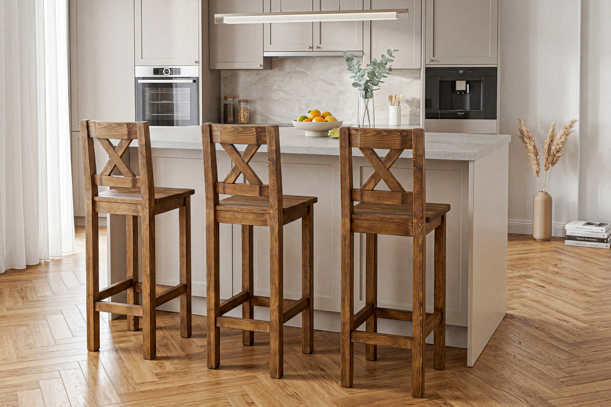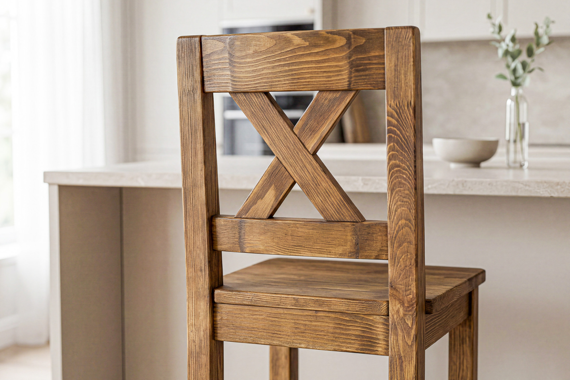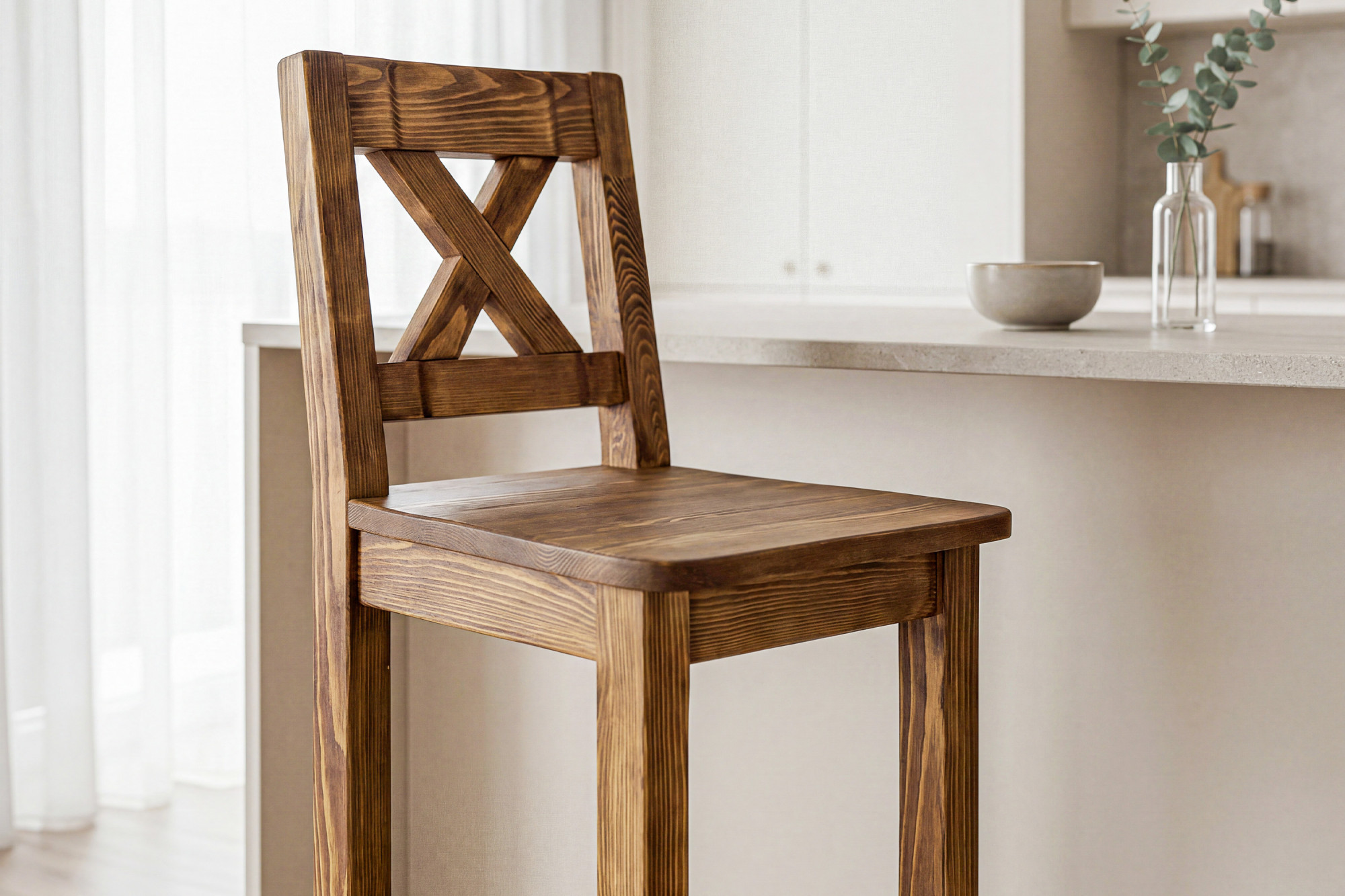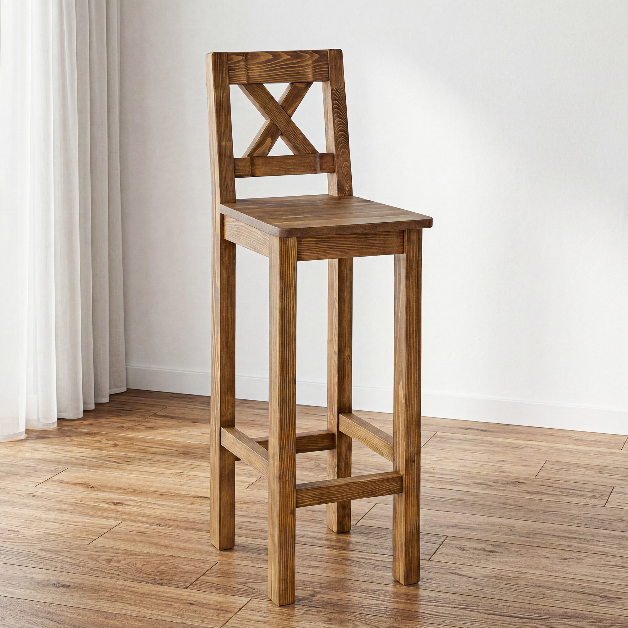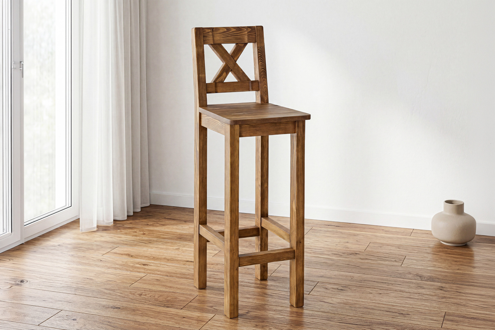 Der Barhocker besteht aus hochwertigem Kiefernmassivholz, das durch Stabilität, Festigkeit und lange Lebensdauer besticht.