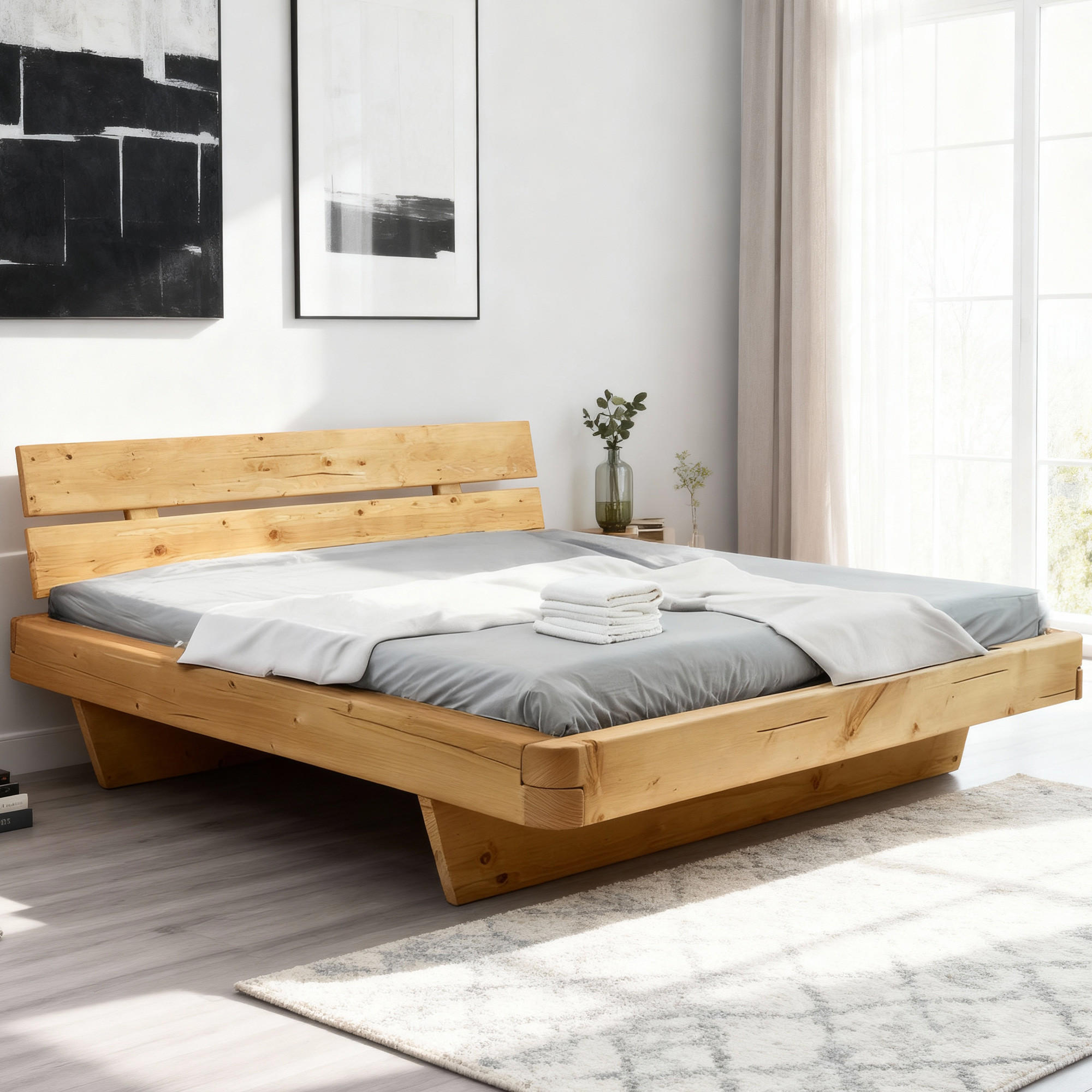 Die Konstruktion besteht aus robusten Fichtenkanteln mit den Maßen 16 × 9 cm, die sorgfältig geschliffen und mit Naturöl behandelt sind, um das Holz zu schützen und ihm ein samtiges Aussehen zu verleihen. Das Fundament aus 4 cm dickem Material sorgt für dauerhafte Stabilität. Die klaren, zeitlosen Linien des Bettes ermöglichen eine einfache Kombination mit anderem Massivholzmöbel, und die Montage ist unkompliziert. Das Bett wird zerlegt geliefert und ist somit auch für enge Flure geeignet. In den Rahmen kann jedes Lattenrost eingesetzt werden, das nicht im Preis enthalten ist.