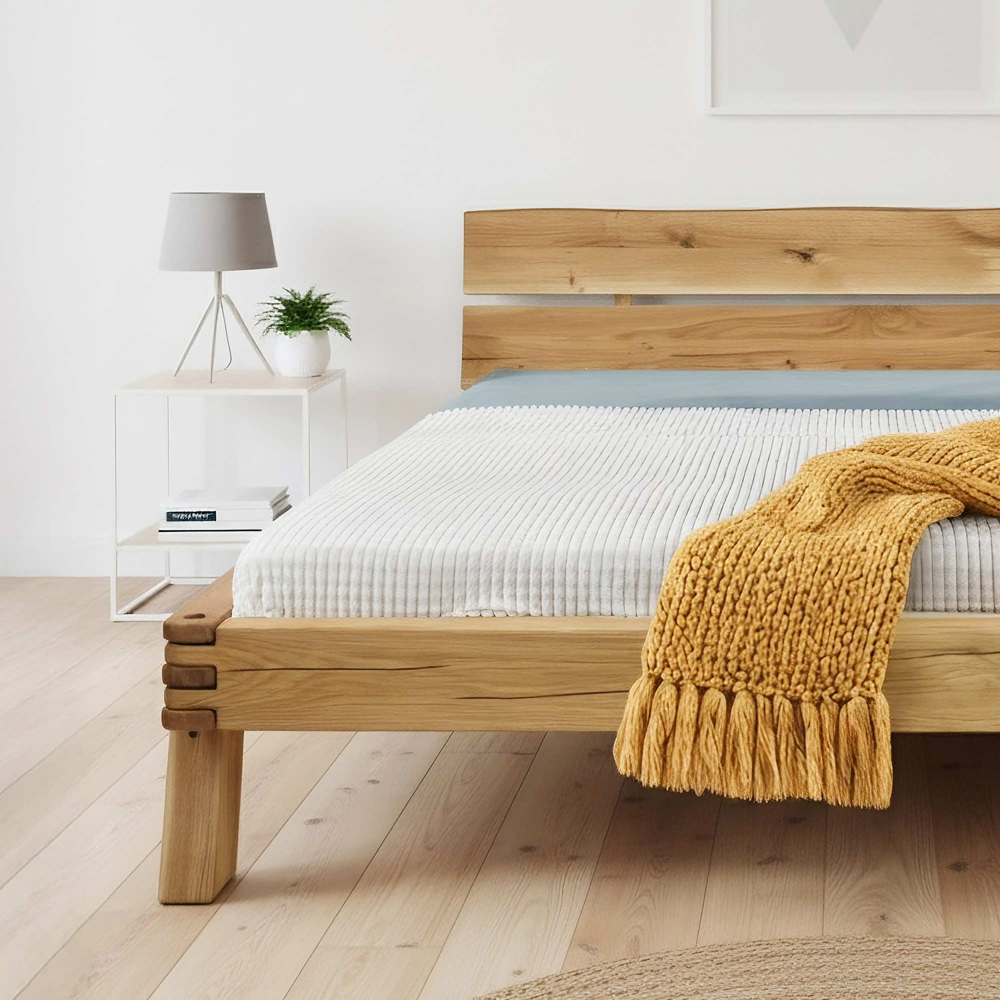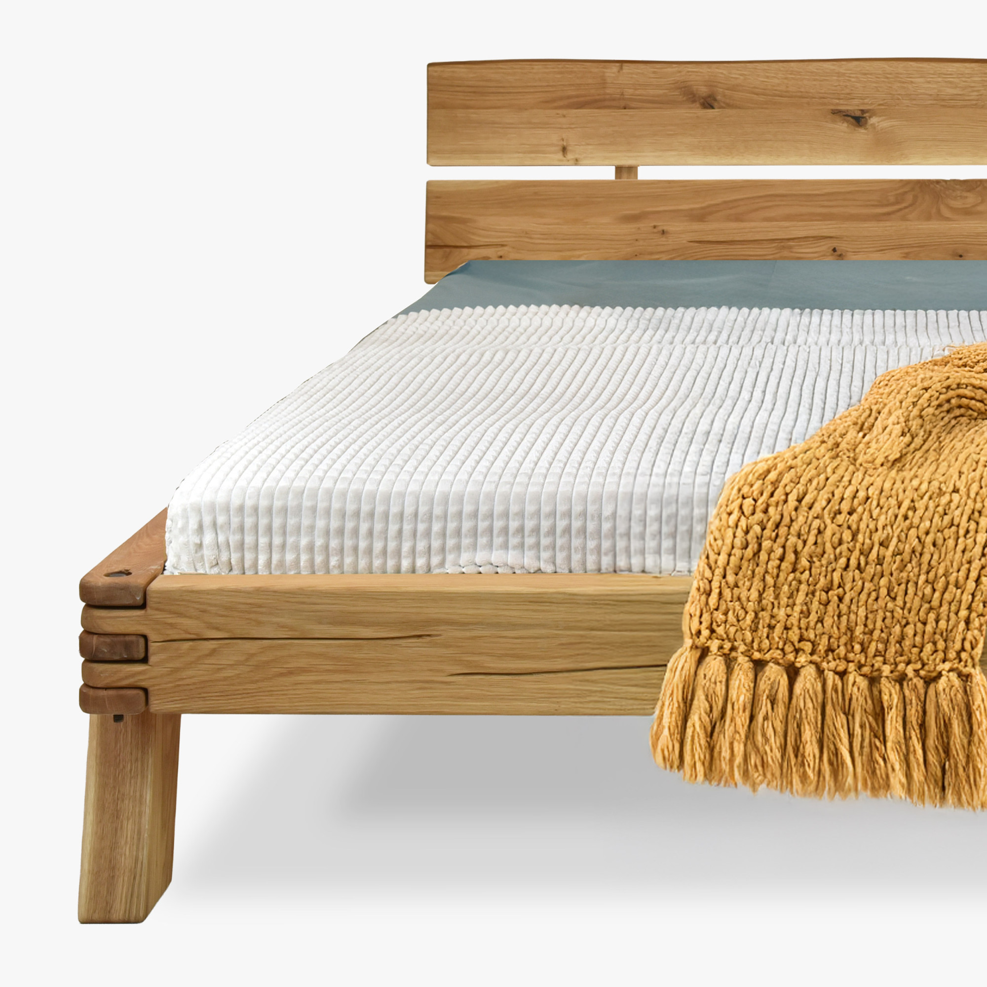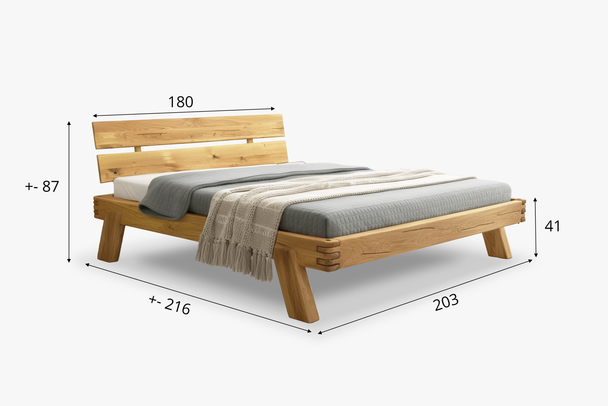 Ein großer Vorteil sind die handgerundeten Ecken, die den einzigartigen Charakter jedes Stücks unterstreichen.Ohne Rost, ermöglicht die Konstruktion den Einsatz jeder anderen Art von Rost. Selbstverständlich besitzt das Bett eine Mittelplatte mit Stützbein für erhöhte Stabilität. Die Belastbarkeit des Bettes beträgt bis zu 230 kg, das empfohlene Maximalgewicht pro Person liegt bei 120 kg. Das Eichenholz stammt aus zertifizierten Quellen mit FSC-Zertifikat, somit können Sie sicher sein, dass Sie ein nachhaltiges und umweltfreundliches Produkt wählen. Das Bett wird zerlegt geliefert und ist sehr einfach zu montieren, sodass Sie schnell ein dominierendes Element Ihres Schlafzimmers erhalten.