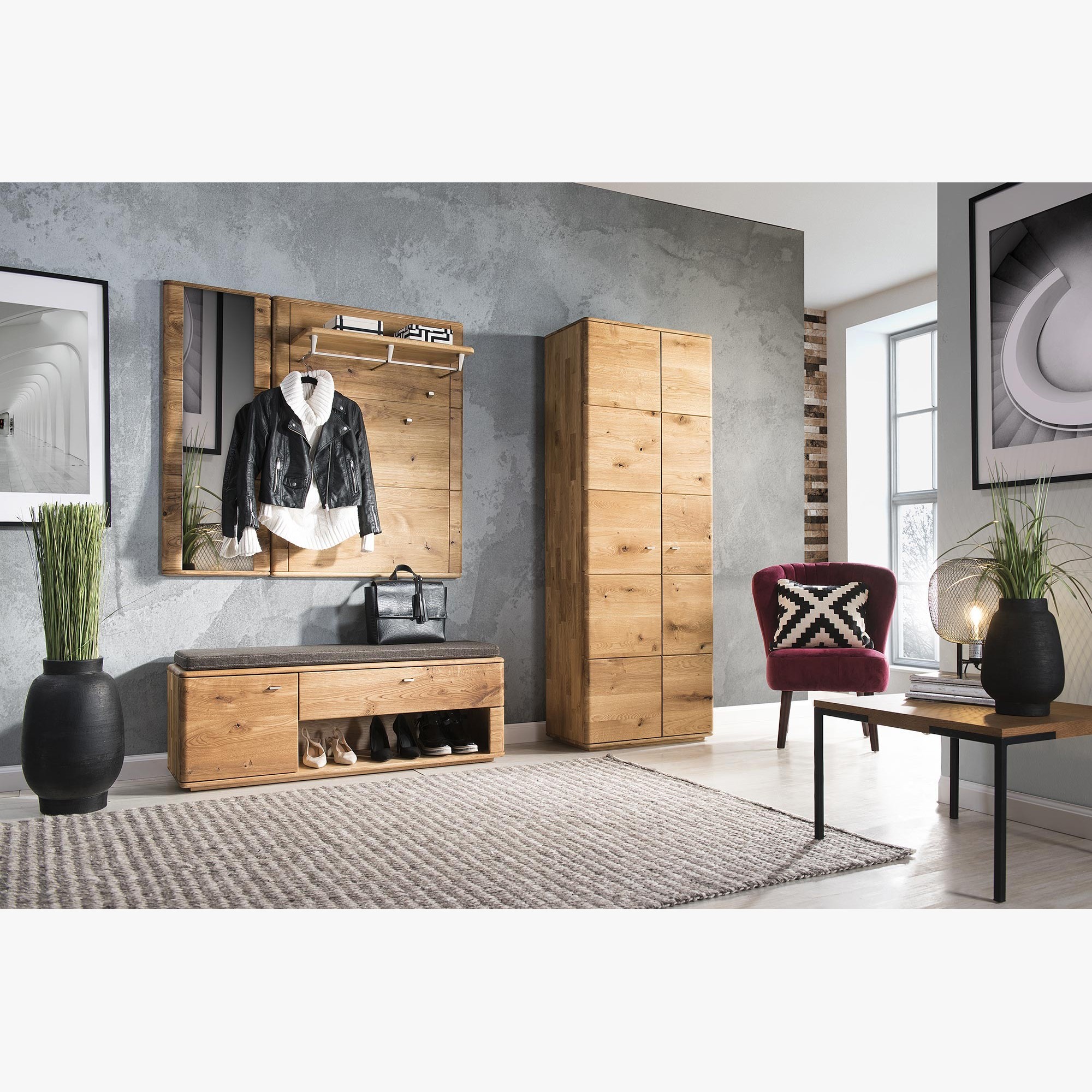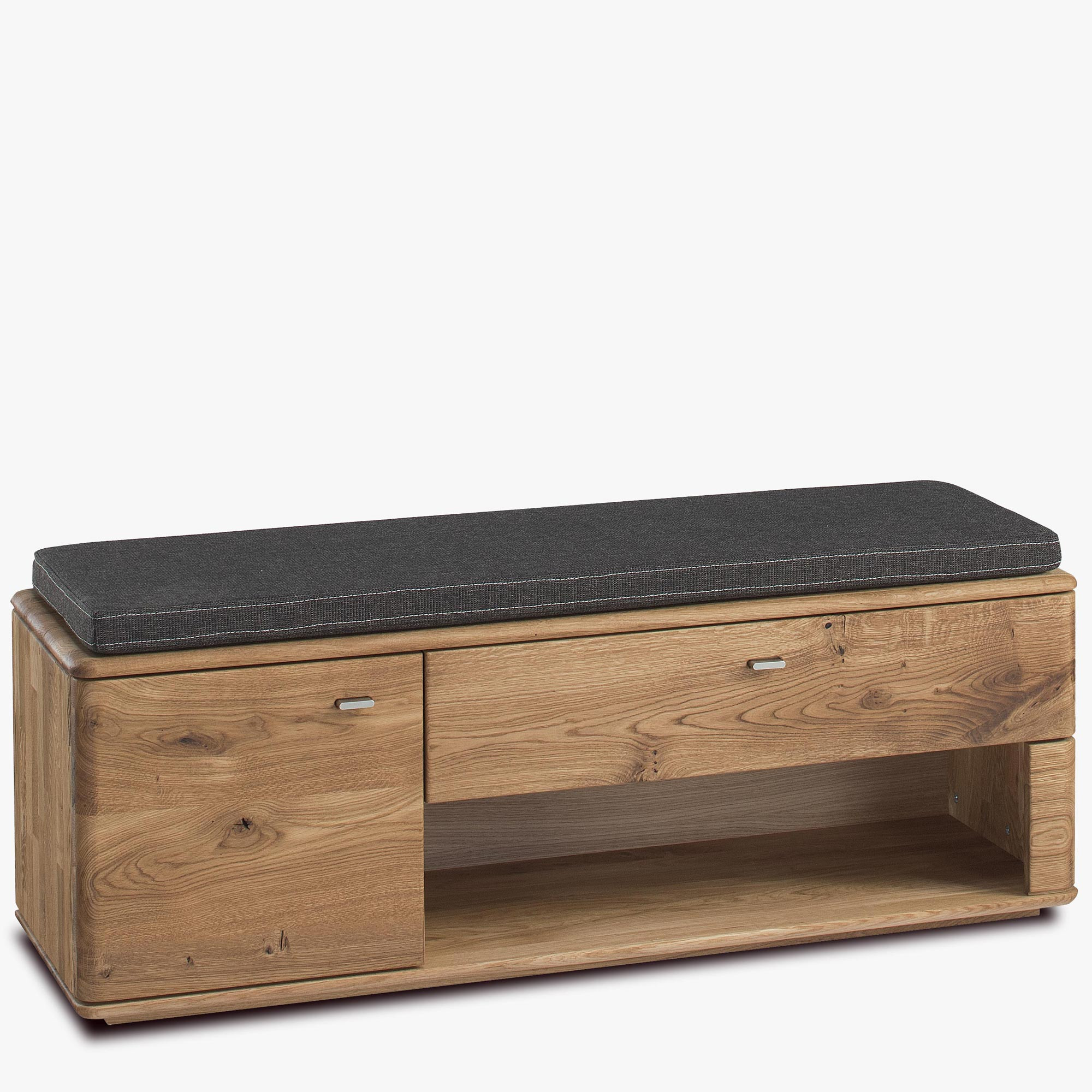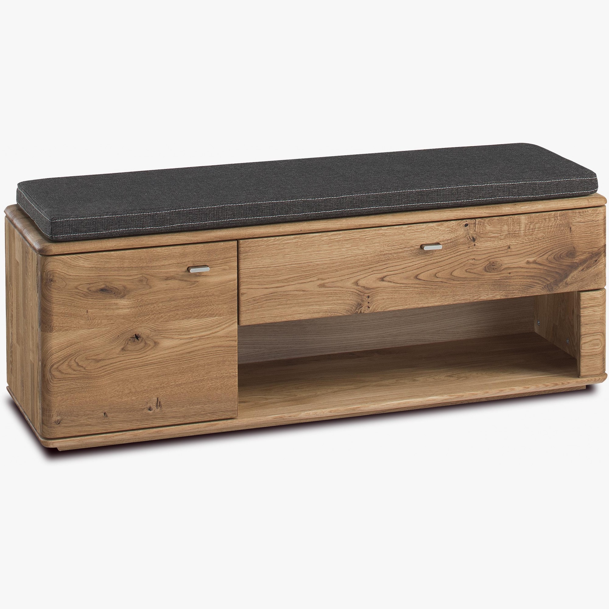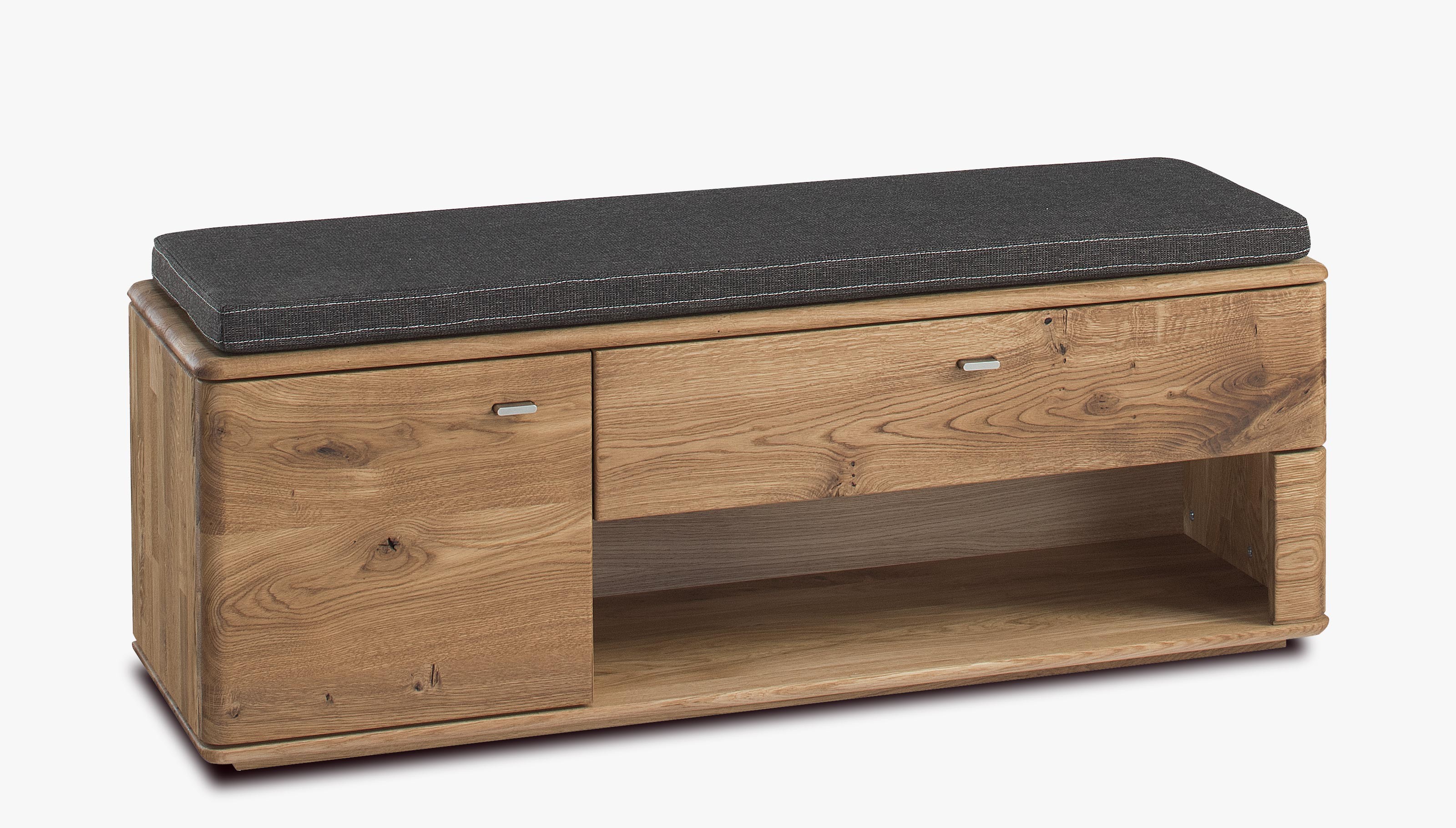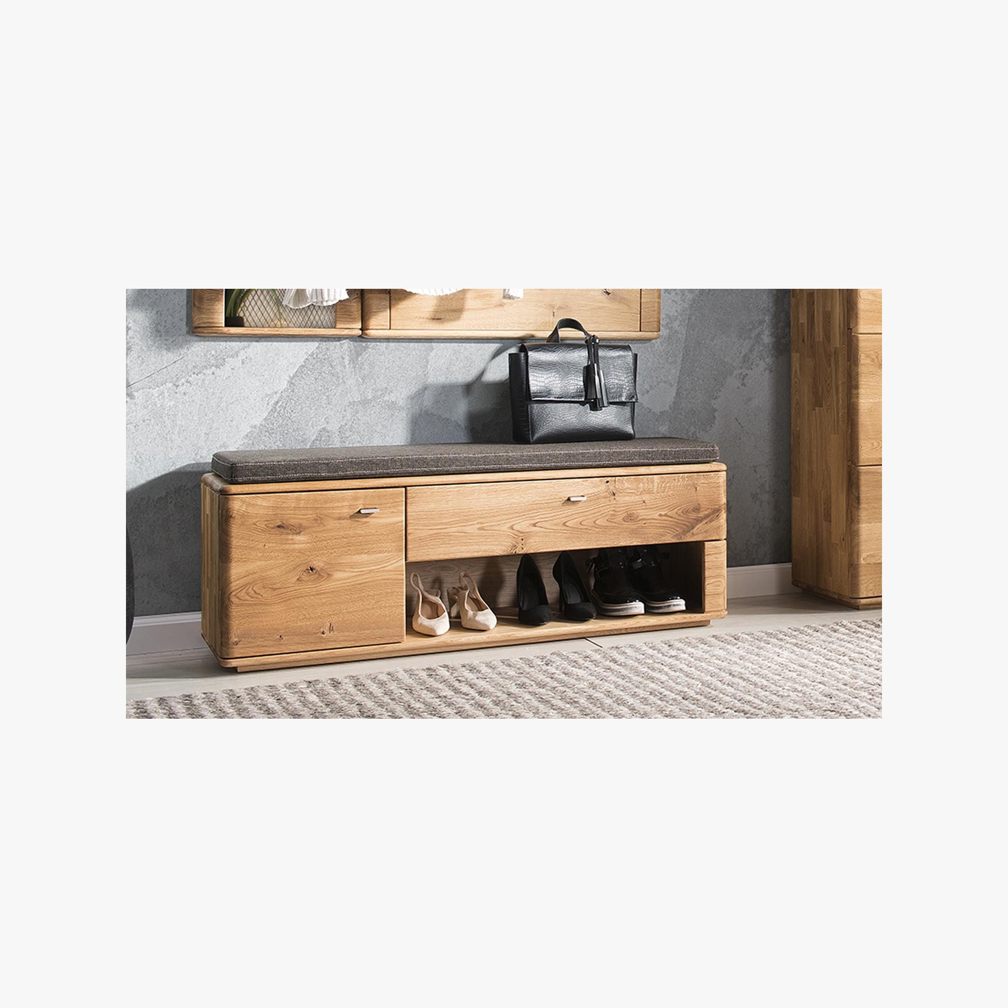 Bänke für Flur und Diele aus der Kollektion Texas. Modell Typ 61 ist aus exklusivem Eichenholz gefertigt. Sie können Ihre Zusammenstellung nach Ihren Wünschen aus allen Stücken der Kollektion Texas zusammenstellen. Die Bank verfügt links an der Oberseite über eine Schublade. Die Beschläge sind mit Soft-Close-Verschluss. Ein bequemer Kissen gehört ebenfalls dazu. Die Möbel sind mit hochwertigem deutschen Öl der Marke Livos behandelt, das umweltfreundlich ist.