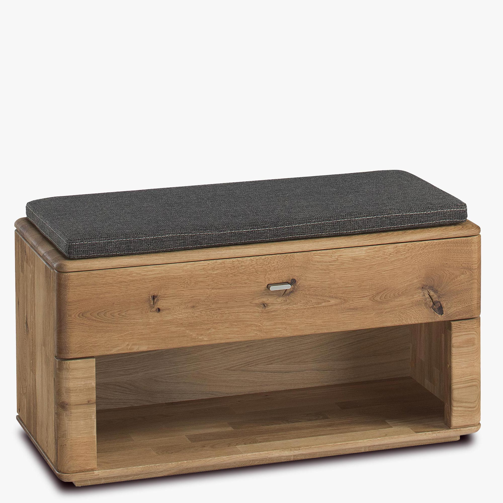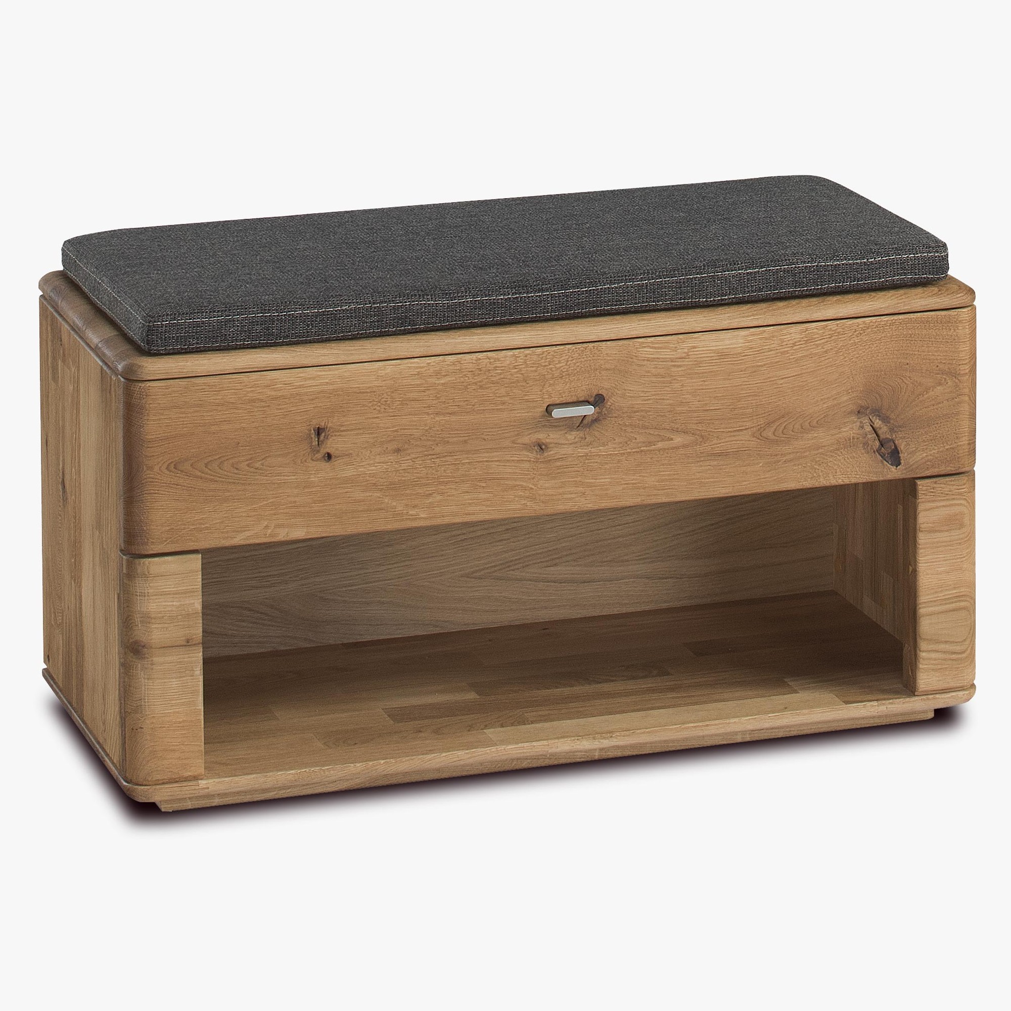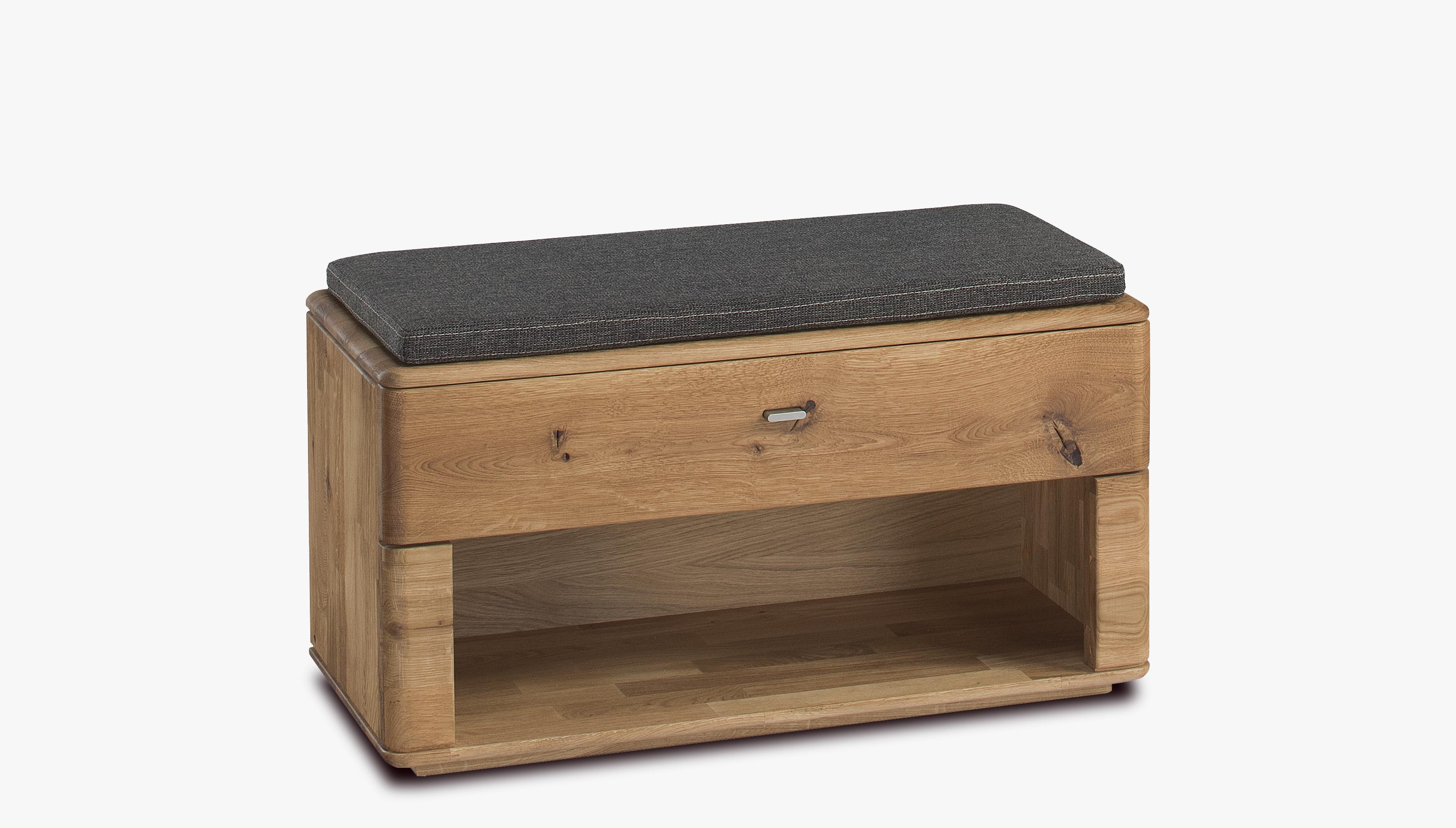 Bänke für Flur und Eingangsbereich aus der Kollektion Texas. Modell Typ 61 ist aus exklusivem Eichenholz gefertigt. Sie können Ihre Zusammenstellung nach Ihren Wünschen aus allen Stücken der Kollektion Texas. Die Bank hat im oberen Bereich eine Schublade. Die Beschläge verfügen über eine Soft-Close-Funktion. Ein bequemer Kissen ist ebenfalls enthalten. Das Möbel ist mit hochwertigem deutschen Öl der Marke Livos behandelt, welches umweltfreundlich ist.