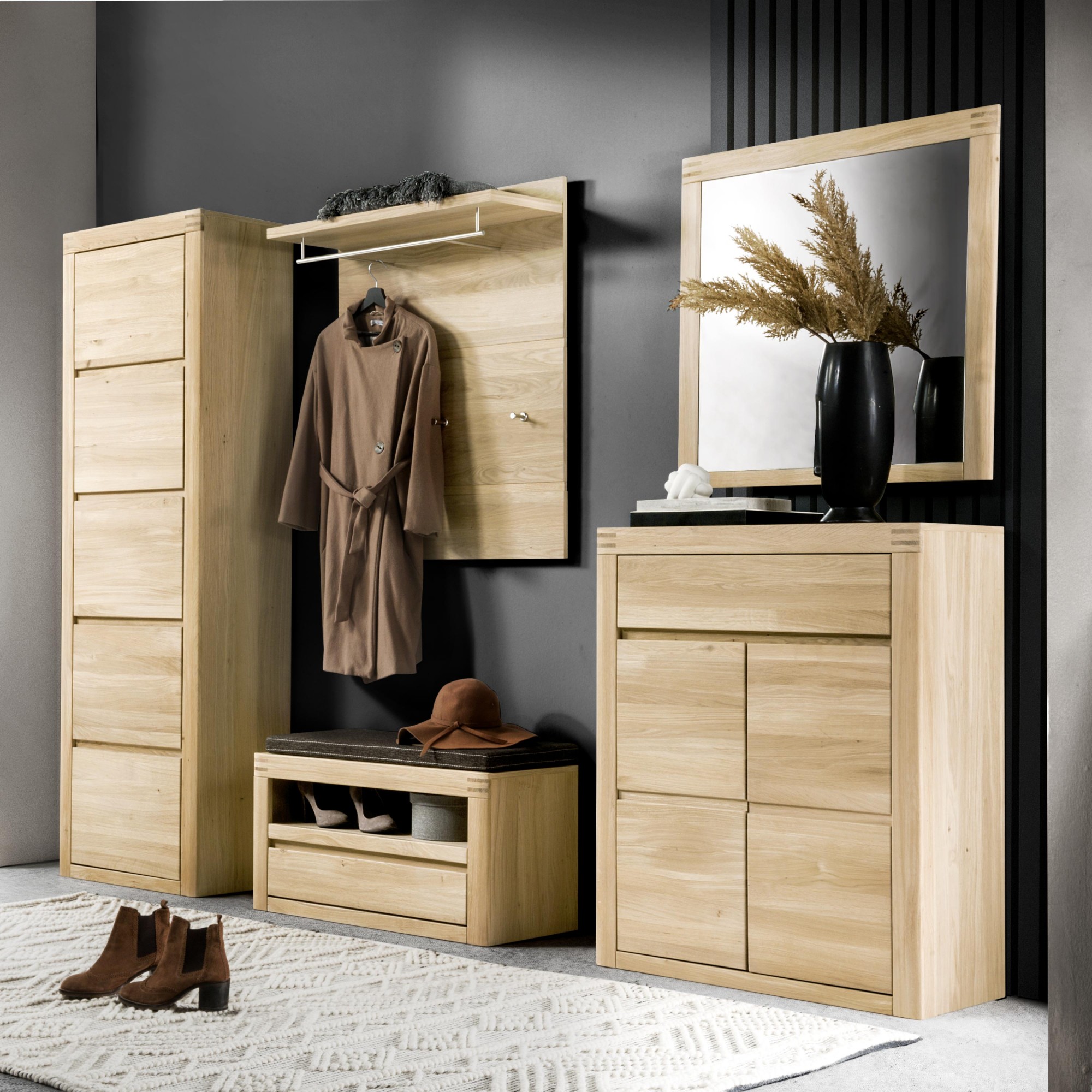 Imposante Flurmöbel in angenehmen hellen Farben. Möbel aus teilweisem Eichenmassivholz in der Farbe weißer Eiche gefertigt. Die Vorderseite der Möbel aus Eichenholz. Seiten und Oberplatte sind furnierte Natur-Eiche. Innenkorpus: naturbelassene Eichensperrholzfurnier in Kombination mit Folie. Die Schubladen und Türen sind mit Soft-Close-Verschluss ausgestattet. Präzise Verarbeitung und hoher Standard sind selbstverständlich. Es handelt sich um Möbel hergestellt für den deutschen Markt.