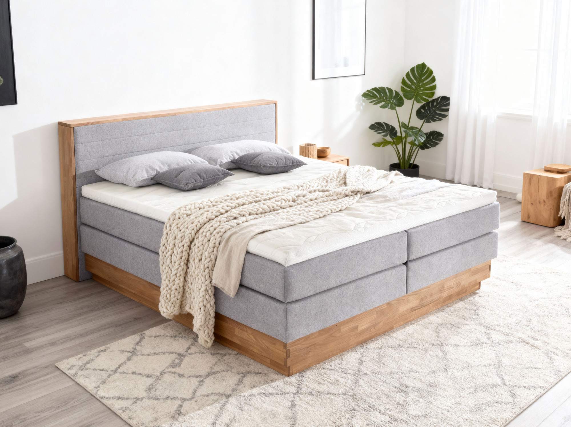 Das Boxspringbett Moneta ist die ideale Wahl für Haushalte, die hochwertigen und stilvollen Möbel aus natürlichem Holz zu einem erschwinglichen Preis direkt vom Hersteller suchen. Dieses elegante und modern gestaltete Bett vereint geöltes massives Eichenholz, das nicht nur eine lange Lebensdauer garantiert, sondern auch ein außergewöhnlich gemütliches und natürliches Ambiente in Ihrem Schlafzimmer schafft. Das Bettkopfteil, eingelassen in einen Rahmen aus massivem Holz, sorgt für eine robuste Konstruktion, die extrem widerstandsfähig und stabil ist, was eine langfristige Nutzung ohne Verlust von Ästhetik und Funktionalität garantiert.