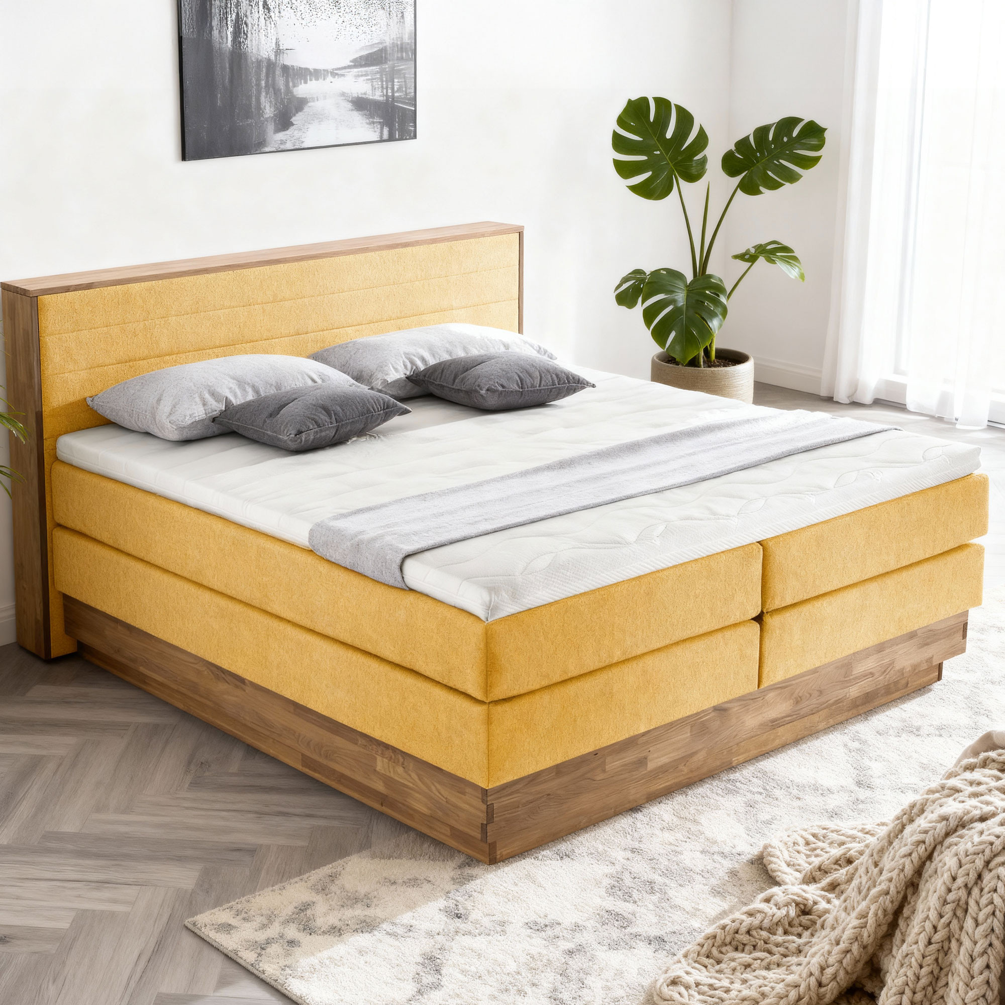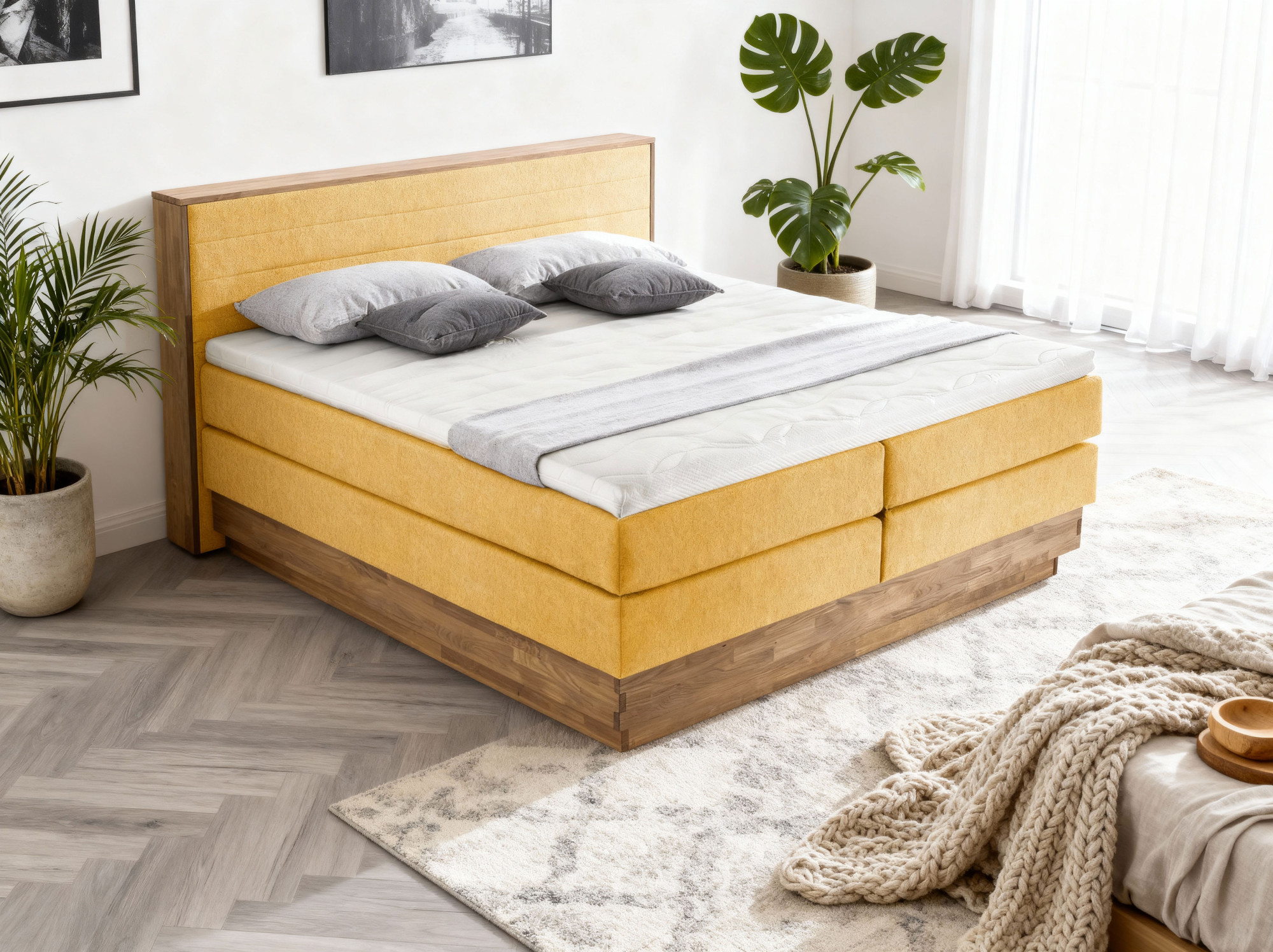 Das Boxspringbett Moneta ist die ideale Wahl für Haushalte, die qualitativ hochwertige und stilvolle Möbel suchen. Dieses elegante und modern gestaltete Bett vereint geöltes massives Eichenholz, das nicht nur für eine lange Lebensdauer sorgt, sondern auch eine außergewöhnlich gemütliche und natürliche Atmosphäre in Ihrem Schlafzimmer schafft. Das Bettkopfteil, eingebettet in den Rahmen aus Massivholz, bietet eine robuste Konstruktion, die extrem widerstandsfähig und stabil ist und eine langanhaltende Nutzung ohne Verlust von Ästhetik und Funktionalität garantiert.