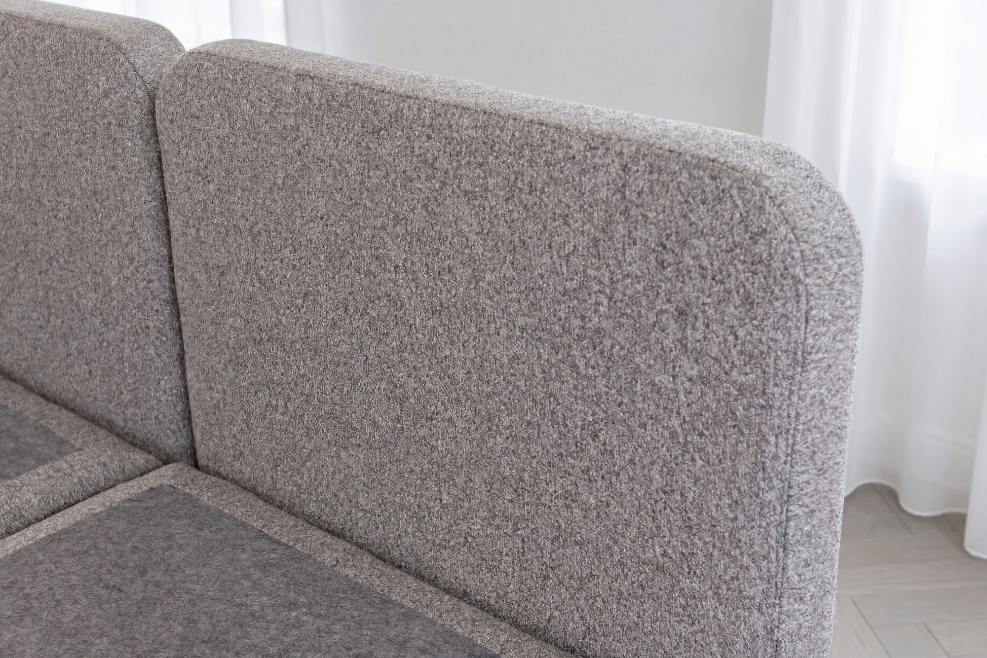 Der Bett-Korpus ist aus einer Kombination aus Holz und Spanplatte gefertigt, was Stabilität und lange Lebensdauer garantiert. Die Füllung besteht aus PUR-Schaum und hochelastischem Schaum, die zusammen idealen Komfort beim Schlafen und Ausruhen schaffen. Das gepolsterte abgerundete Bettkopfteil mit geteiltem Design wirkt weich und modern und bietet angenehme Rückenstütze beim Lesen oder Fernsehen. Der Stoff Adventure 90 ist 100% Polyester mit einer Grammatur von 400 g/m² und einer Martindale-Beständigkeit von 70.000–80.000 Zyklen, wodurch er auch bei täglicher Nutzung makelloses Aussehen bewahrt.