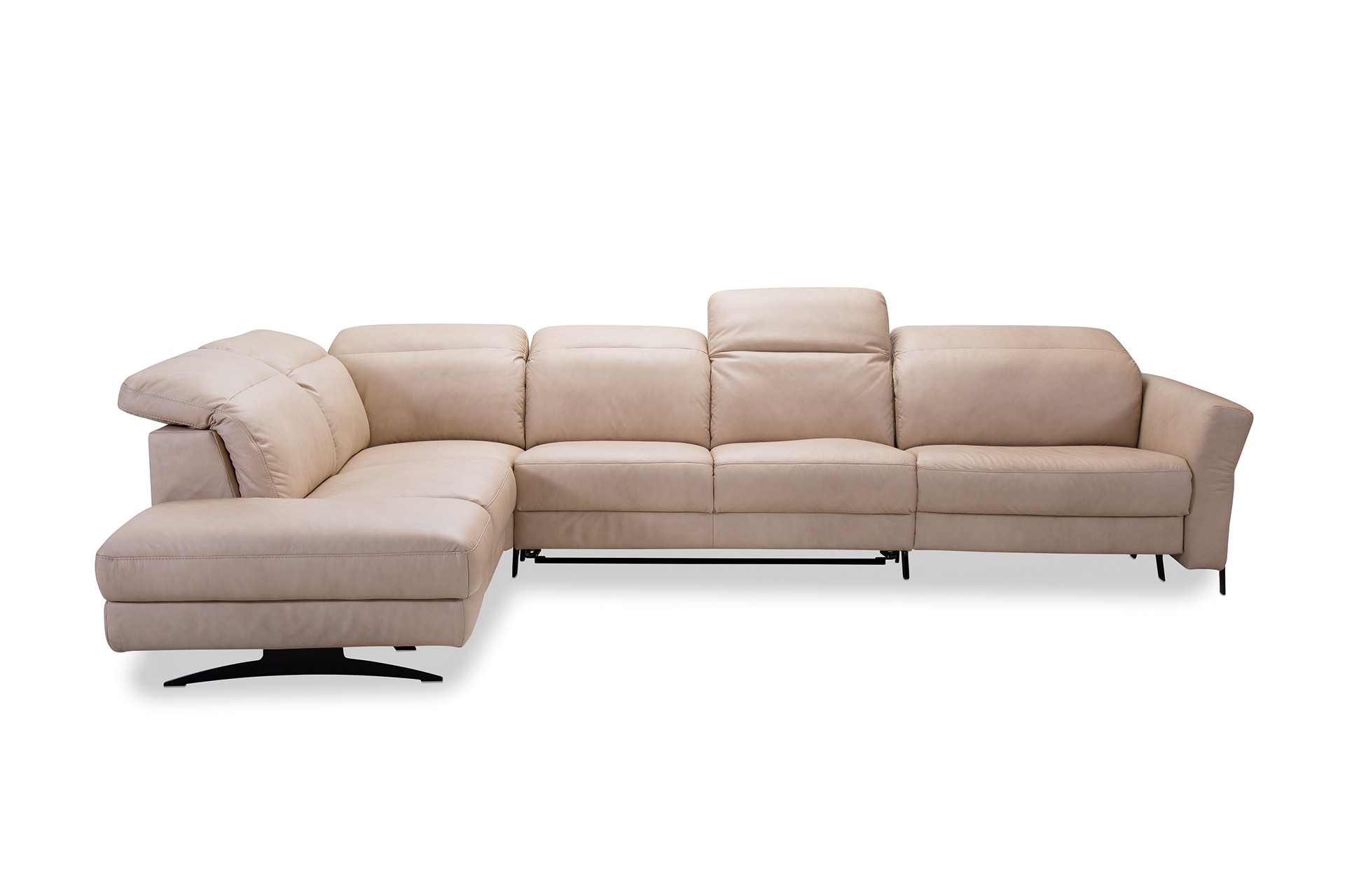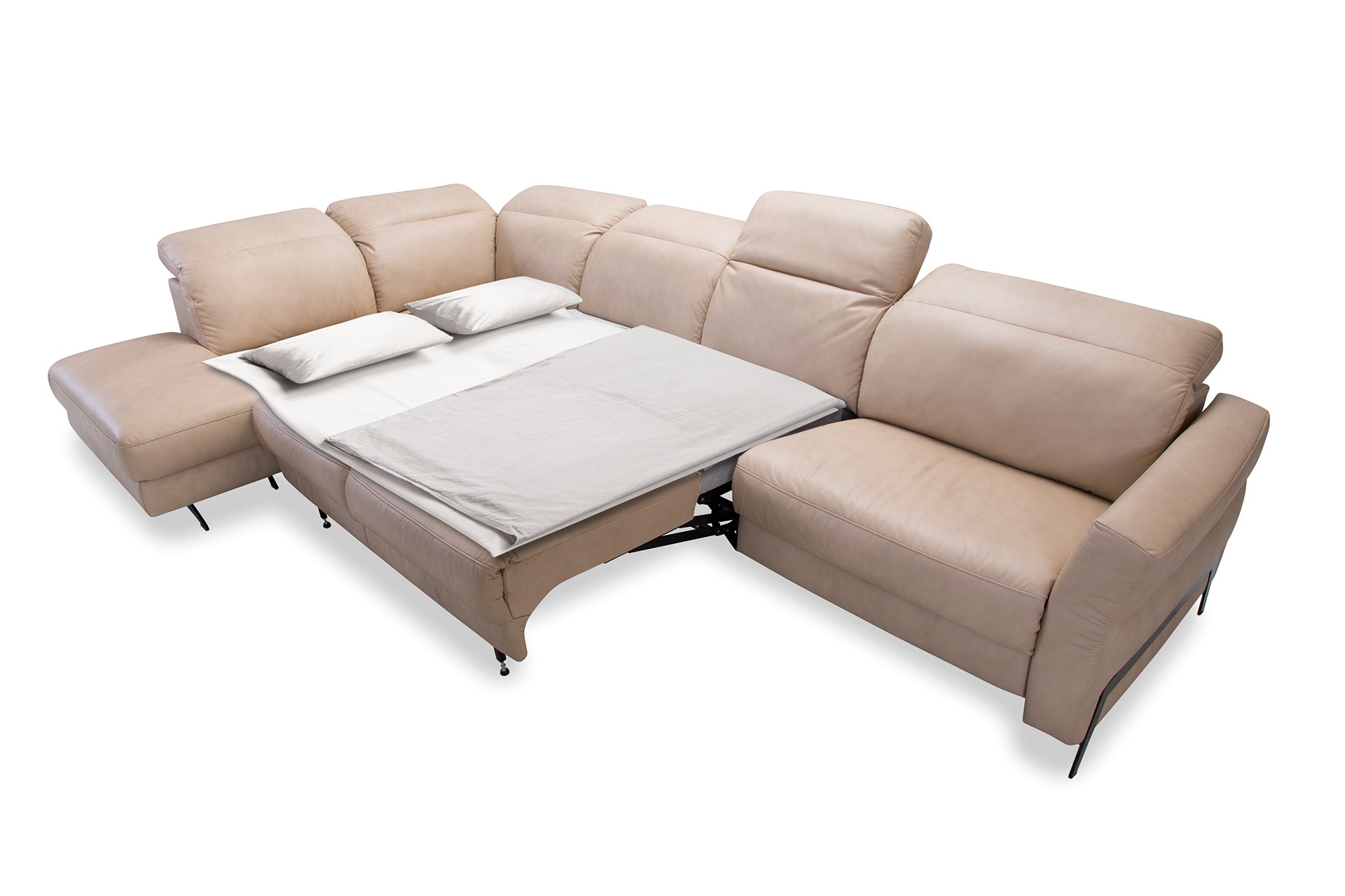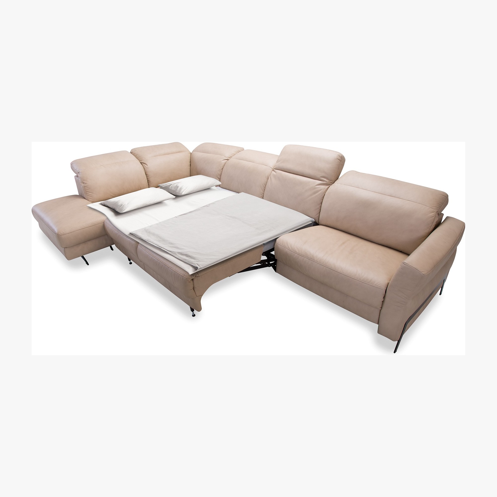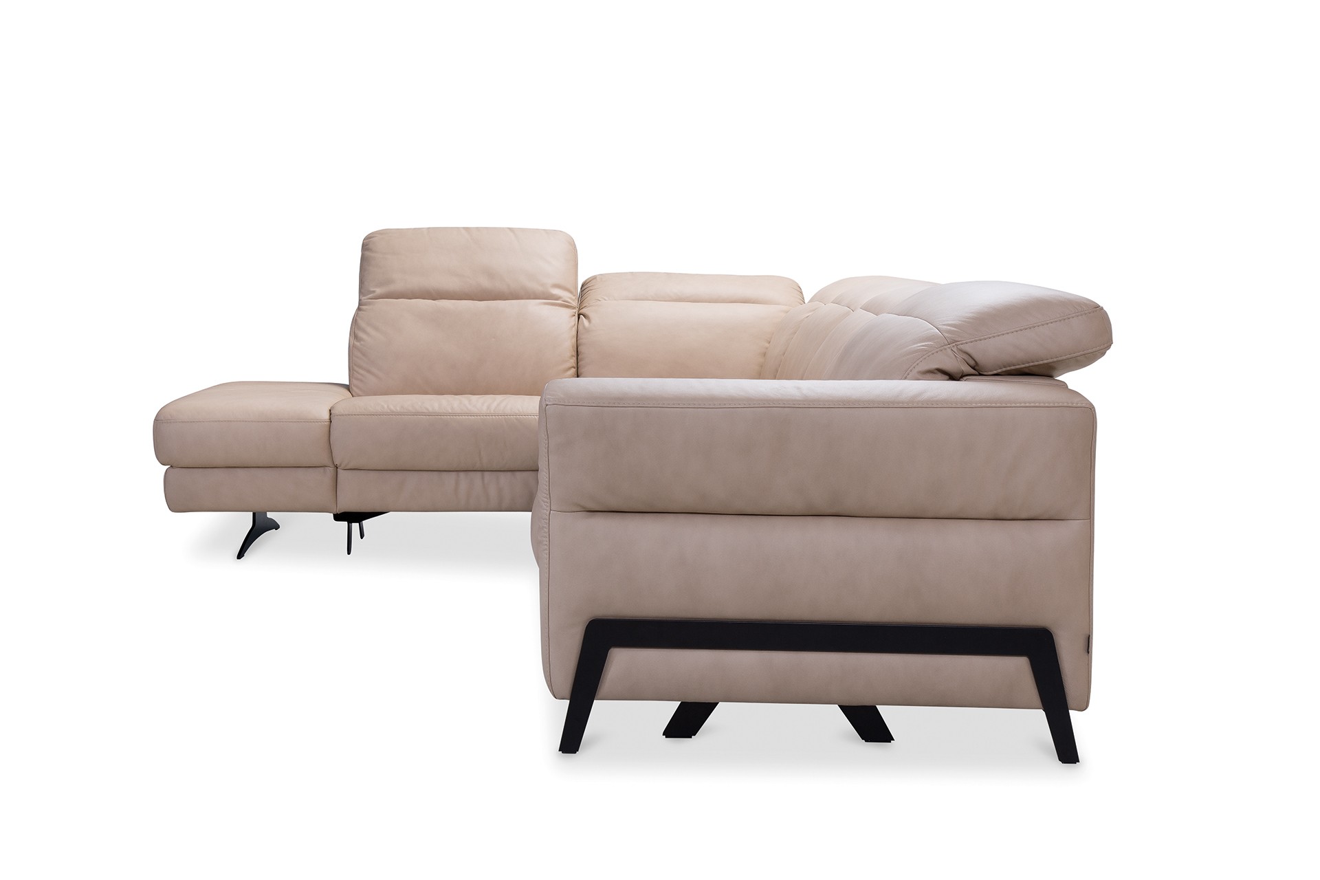 Designermodernes Ledersofa auf Metallfüßen in schwarzer Farbe. Luxuriöse Sofagarnitur Volta, die modulbar ist und in ihrer Konfiguration eine große Anzahl verfügbarer Elemente hat. Komplette Preisliste unten. Es ist die Eckversion mit wählbarer Ecke. Das Sofa verfügt auch über eine Funktion zum Ausklappen zum Bett. Nach dem Ausklappen beträgt die Liegetiefe 194 cm.