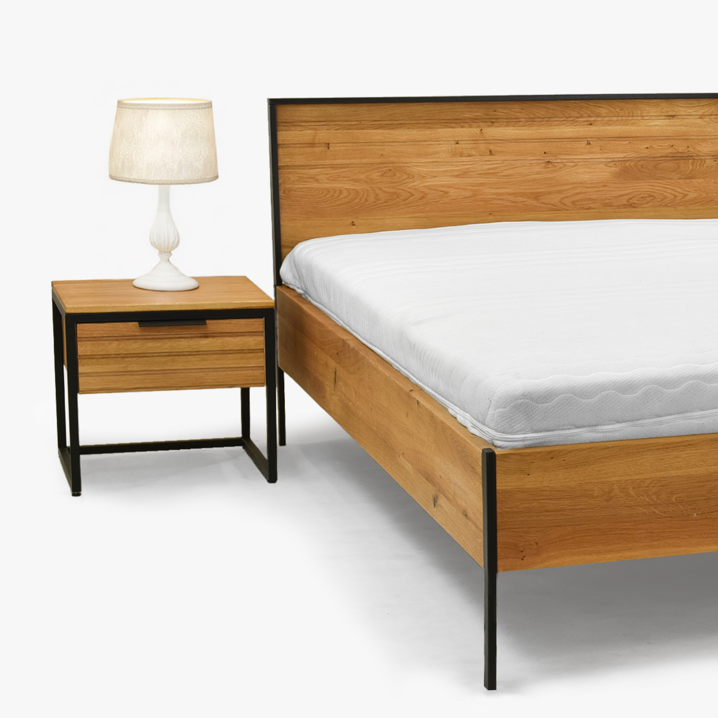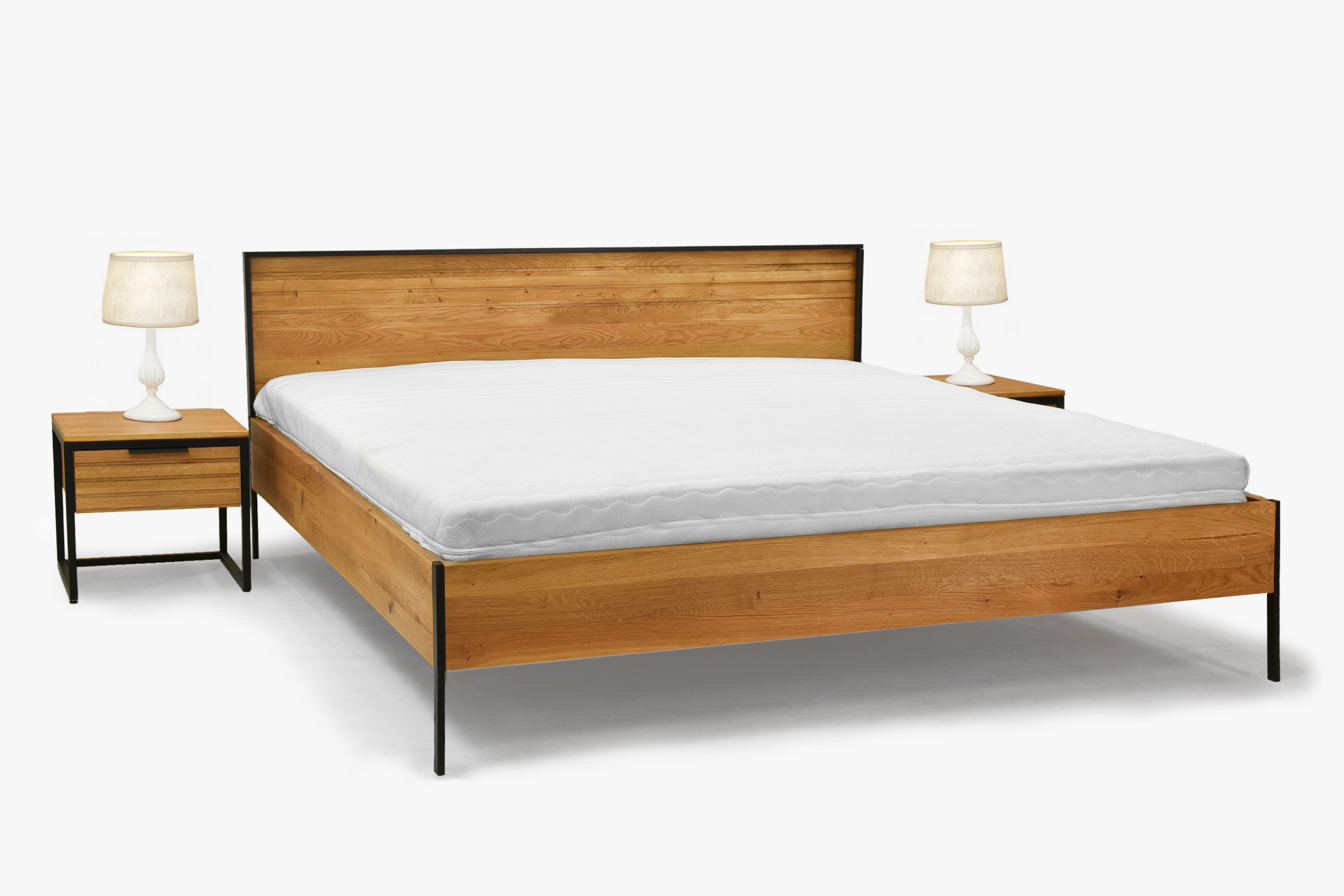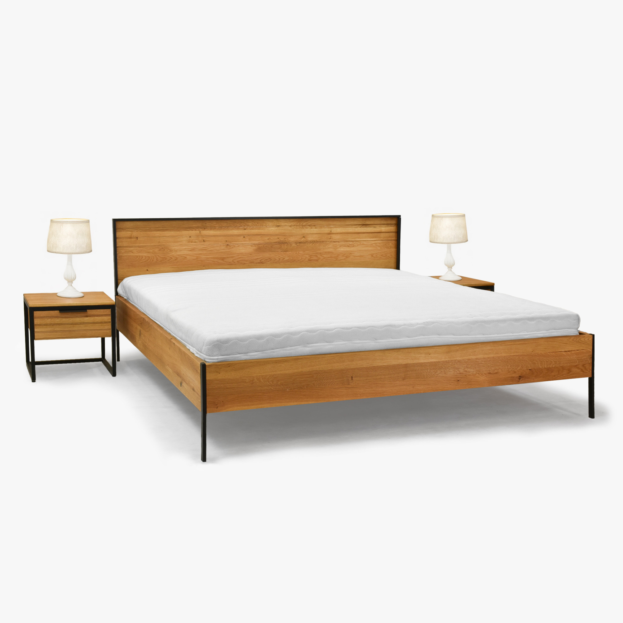 Das Eiche-Doppelbett Verona ist für diejenigen entworfen, die im Schlafzimmer klare Linien, echte Naturmaterialien und lange Lebensdauer wünschen. Der Rahmen besteht aus massivem Eichenholz mit 25 mm Dicke, das aus Wäldern mit FSC-Zertifizierung stammt und mit natürlichem Öl behandelt wurde – es betont die Holzmaserung und schützt gleichzeitig vor täglicher Abnutzung. Dank der Größe 180 × 200 cm kann beliebig ein Rost im eigenen Rahmen oder zwei Roste 90 × 200 cm aufgenommen werden. Ein eleganter Kontrast wird durch Metallfüße und einen schwarzen Rahmen um das Kopfteil geschaffen, die dem Bett einen modernen industriellen Akzent verleihen, ohne die Gemütlichkeit des Massivholzes zu beeinträchtigen.