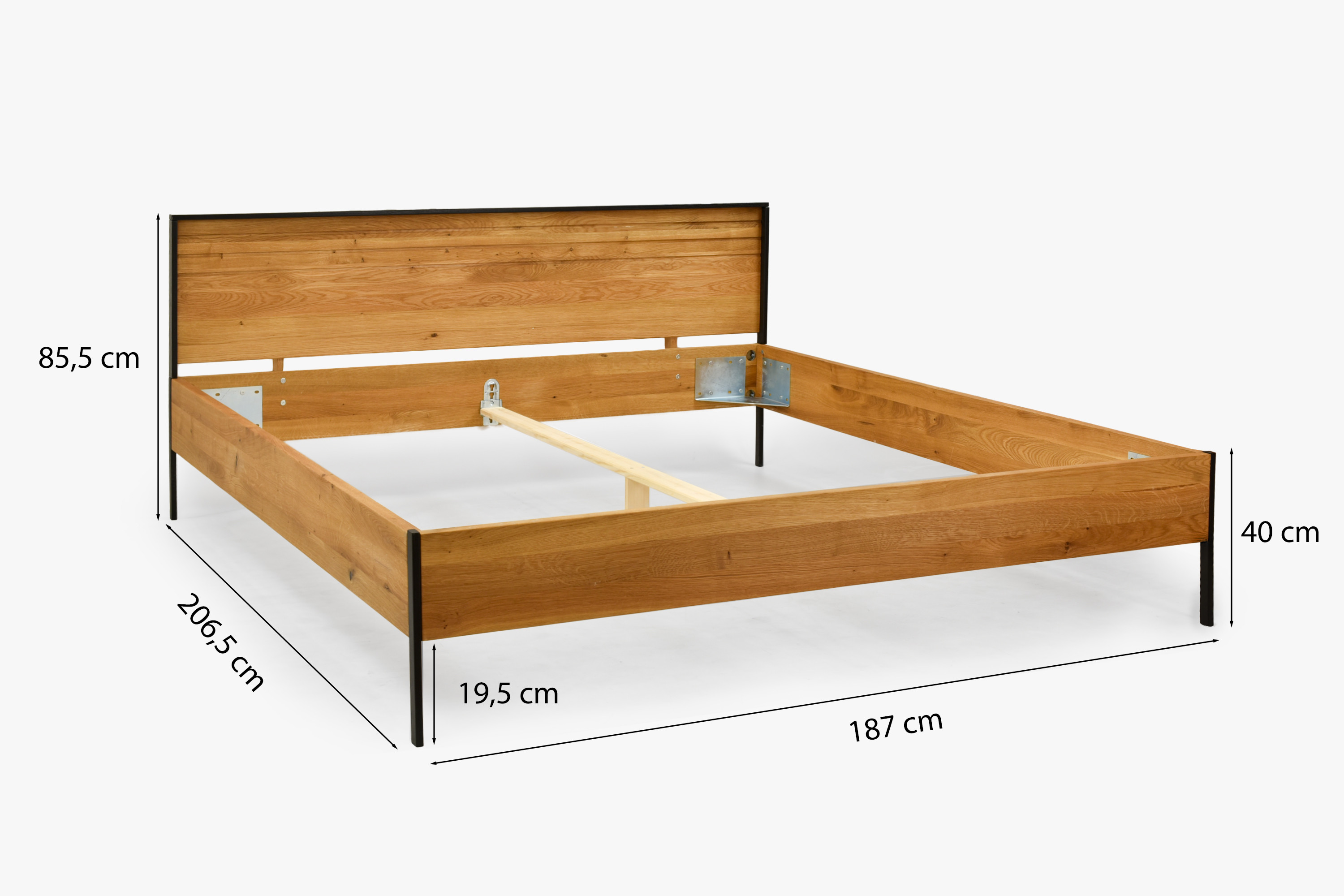 Dank massivem Eichenholz mit 25 mm Dicke und Metallfüßen hat das Bett eine Gesamttragfähigkeit von bis zu 230 kg. ( Person max. 115 kg )