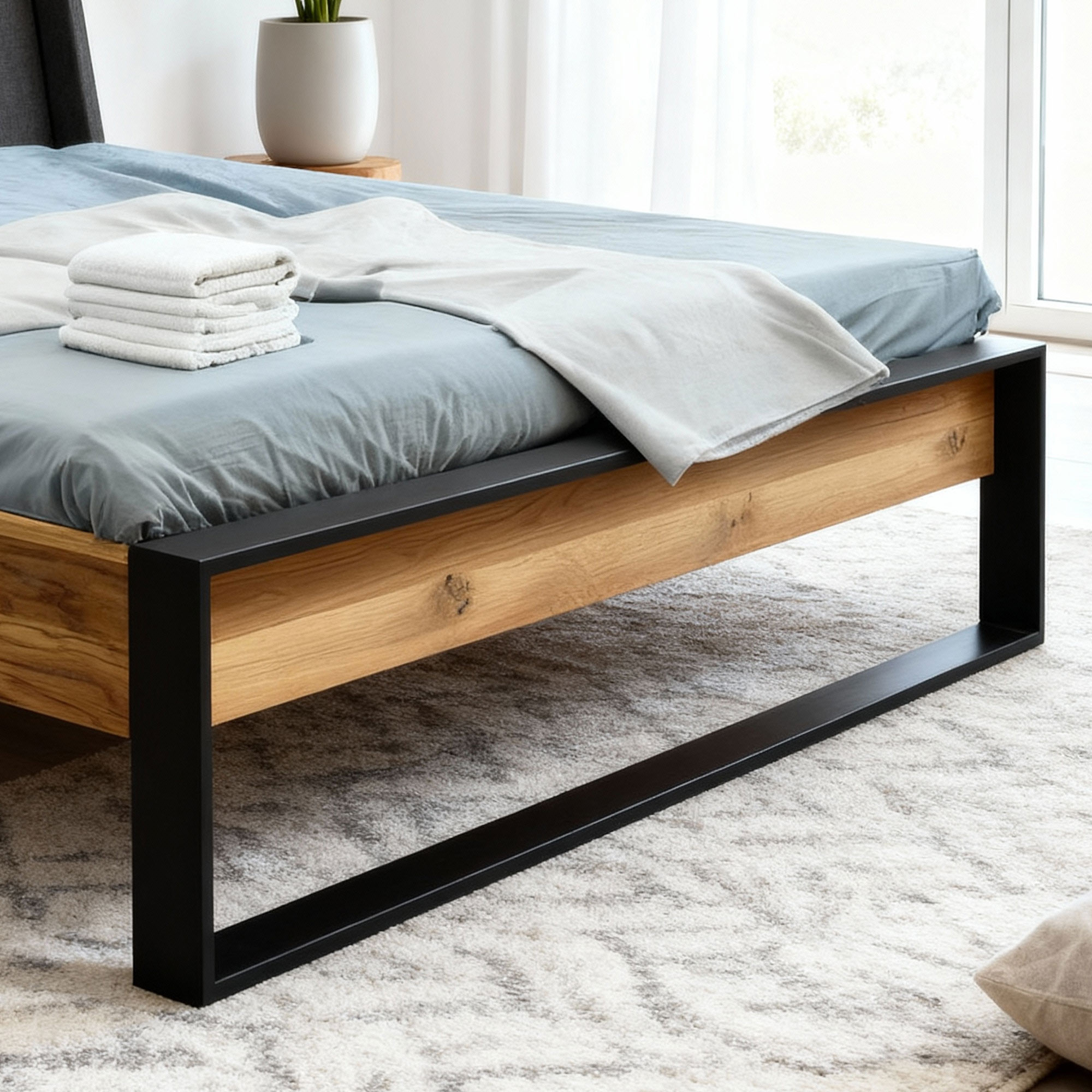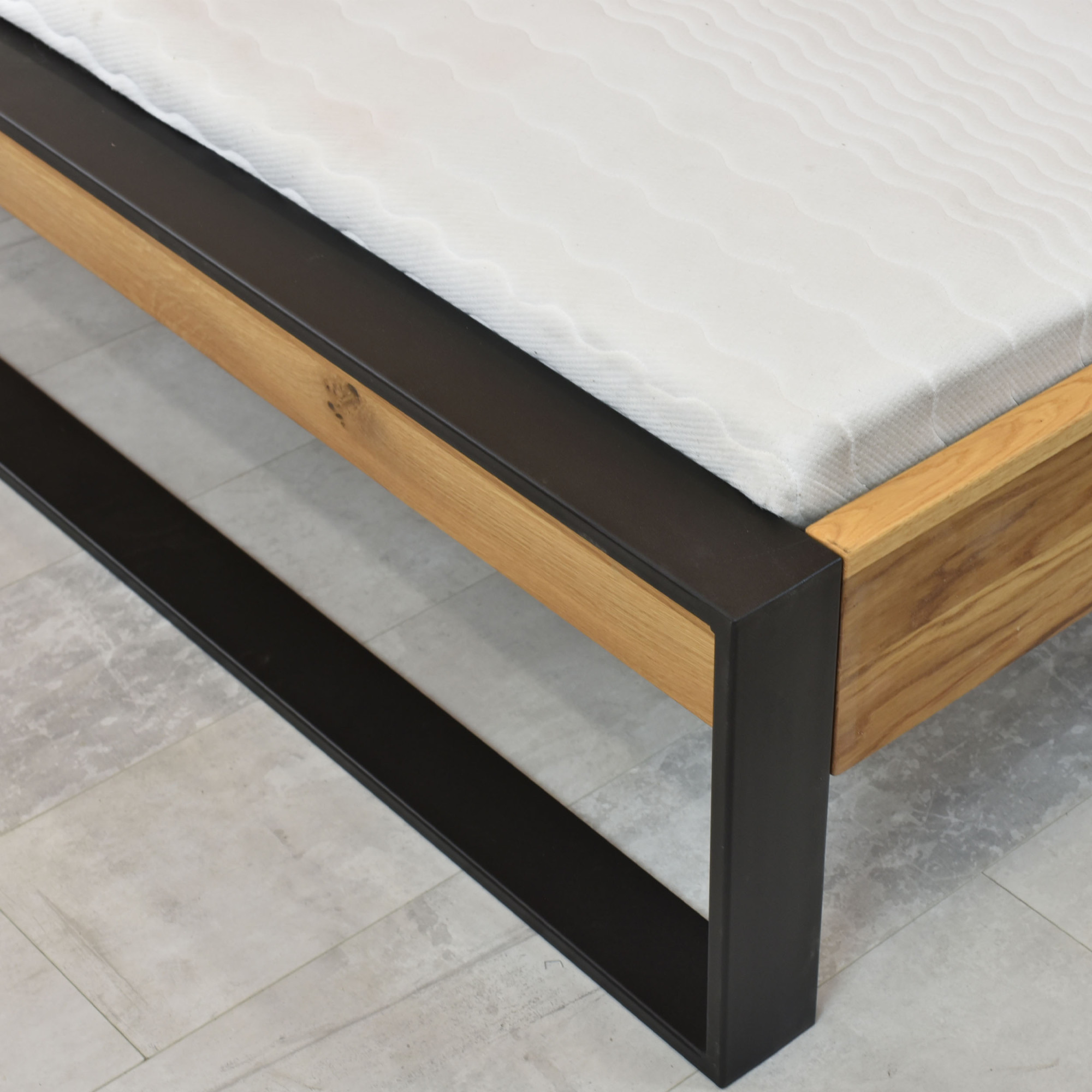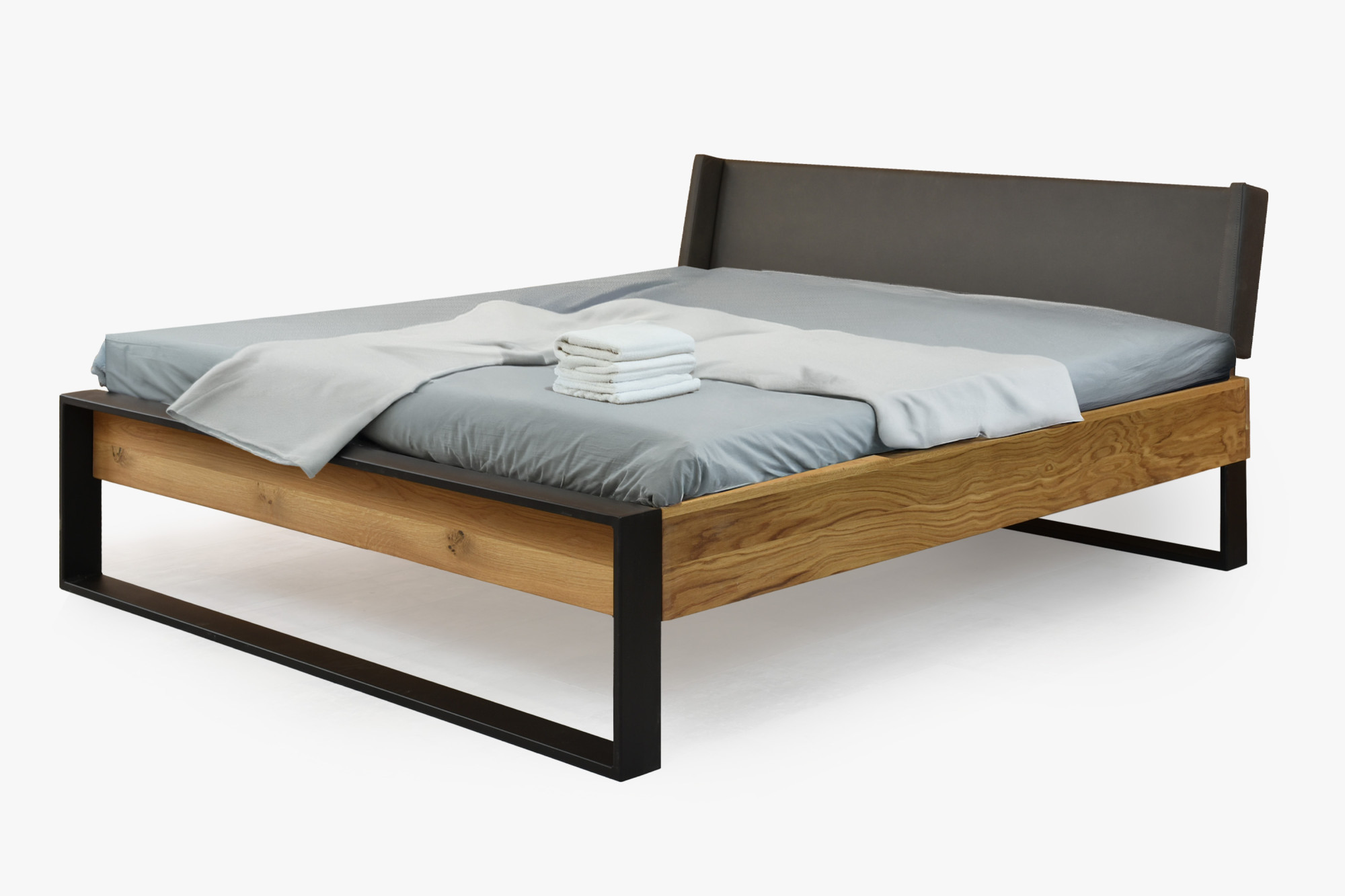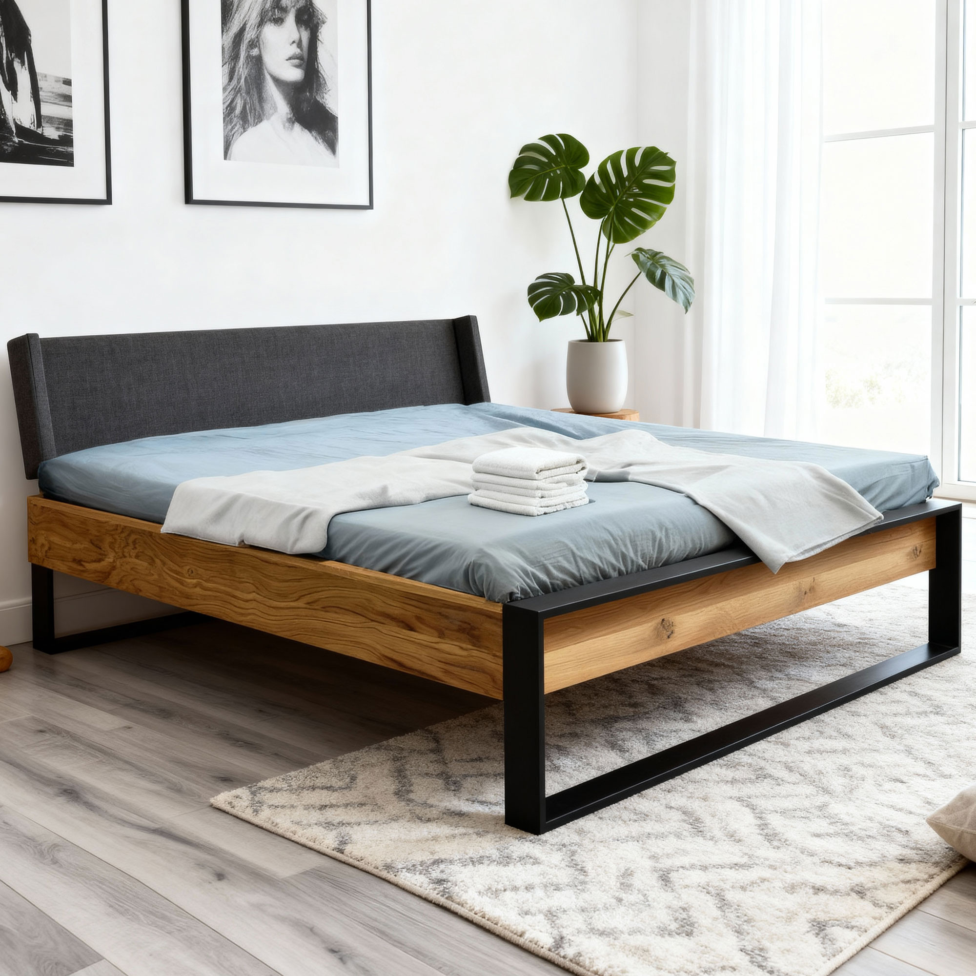 Doppelbett Eiche massiv 180x200 cm mit mattschwarzen