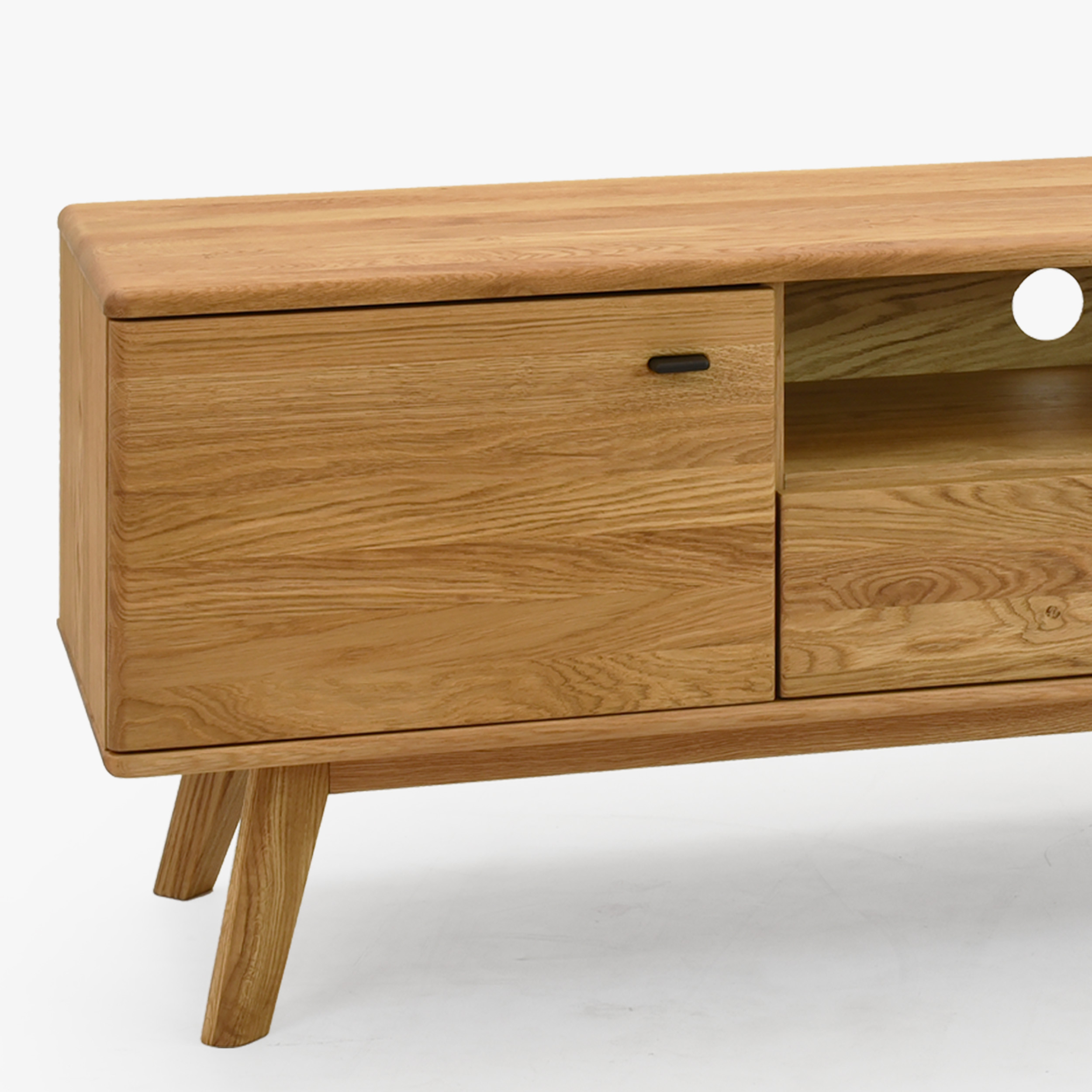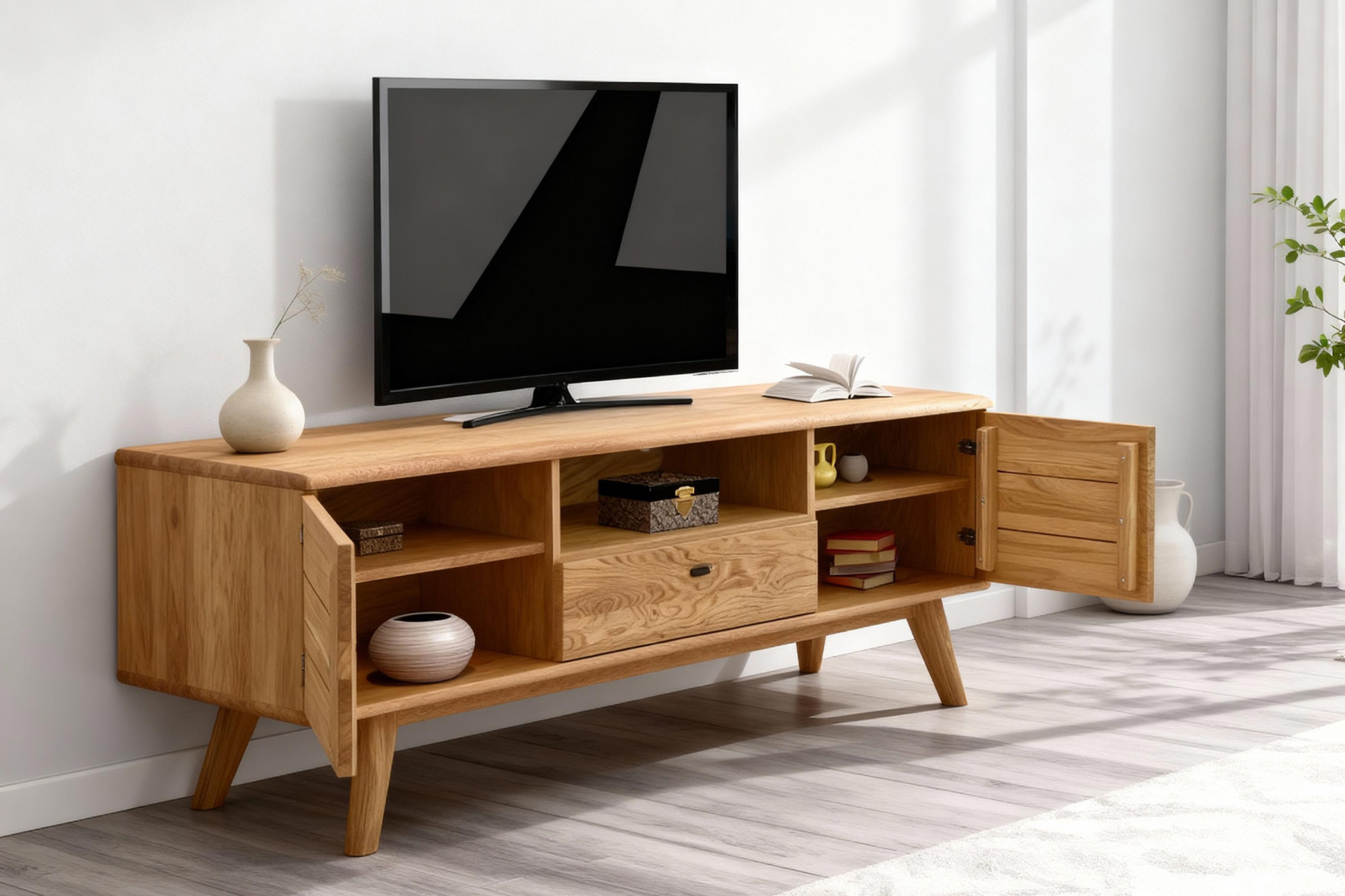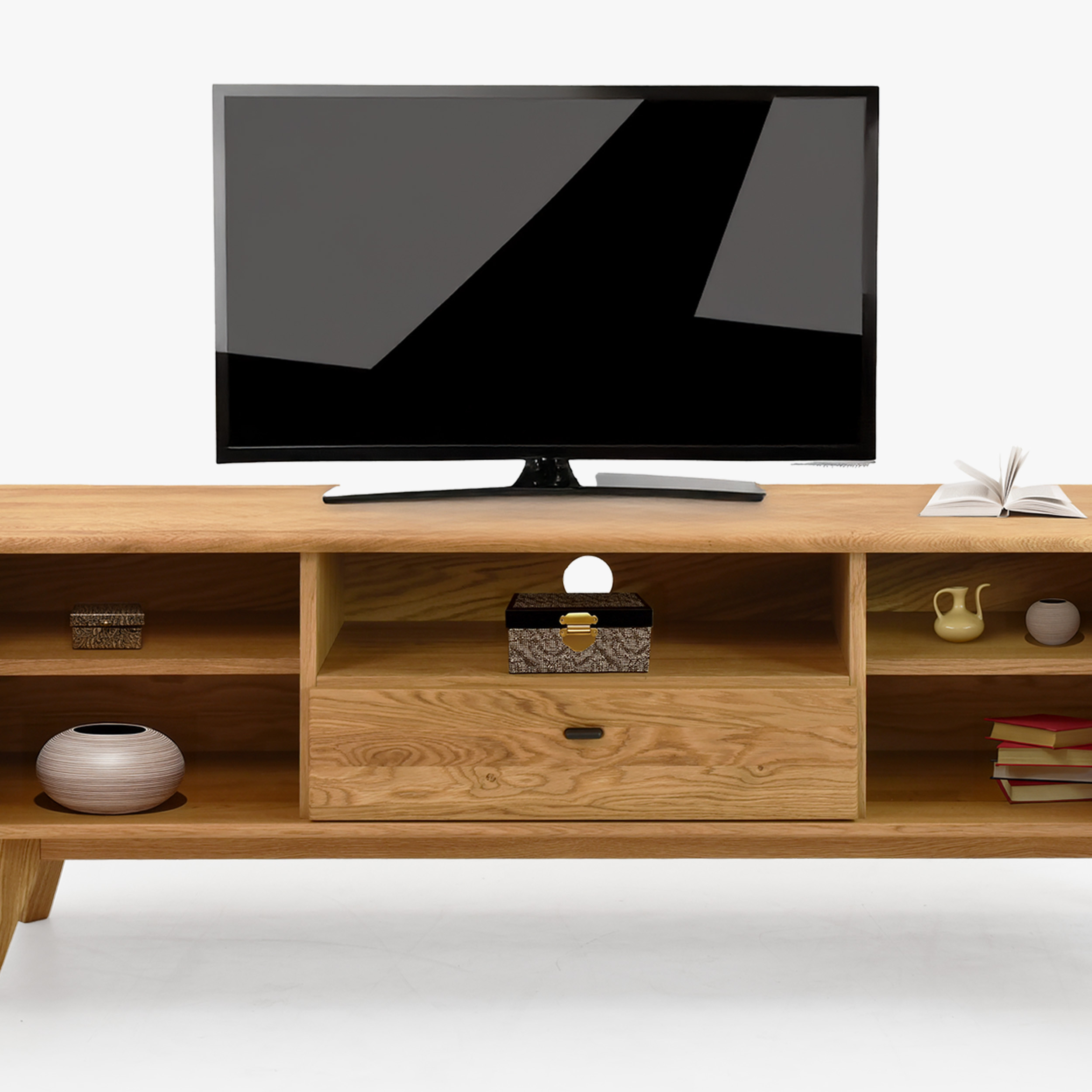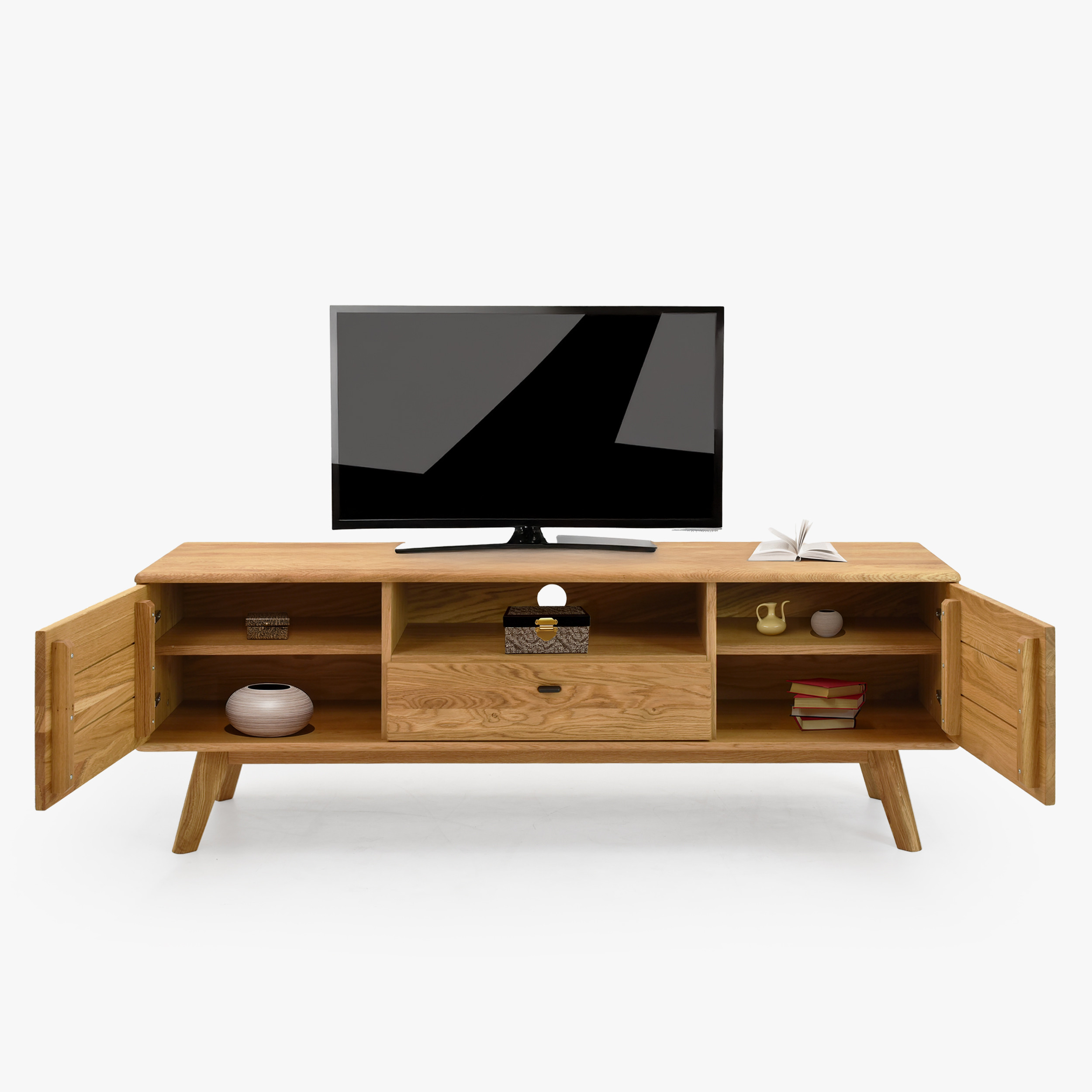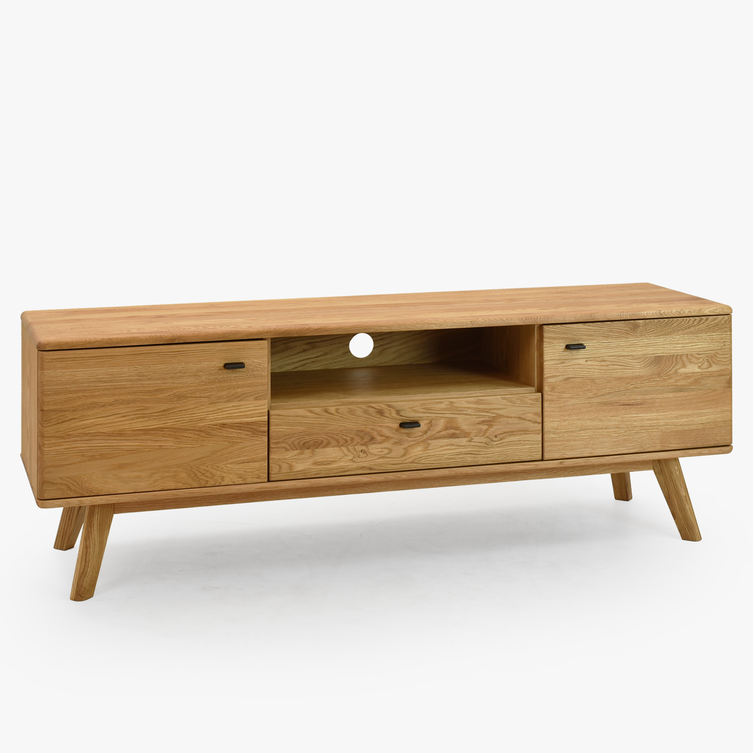 Massive TV-Kommode auf Füßen aus der Serie Jánošík stellt die ideale Verbindung von natürlichem Eichenholz, modernem Design und präziser Handwerkskunst dar. Dieses Möbelstück besticht durch eine stabile Konstruktion, die eine Kombination aus massiver Eiche (Oberplatte, Fronten, Beine und tragende Teile) und Eichenfurnier an den Seiten und am Korpus ist. Dadurch bietet die Kommode hohe Beständigkeit, lange Lebensdauer und bewahrt gleichzeitig die natürliche Schönheit echten Holzes. Die Oberfläche ist mit hochwertigem deutschem Livos-Öl in der Farbe Naturöl behandelt, das die Struktur der Eiche hervorhebt und das Holz vor Beschädigungen schützt.