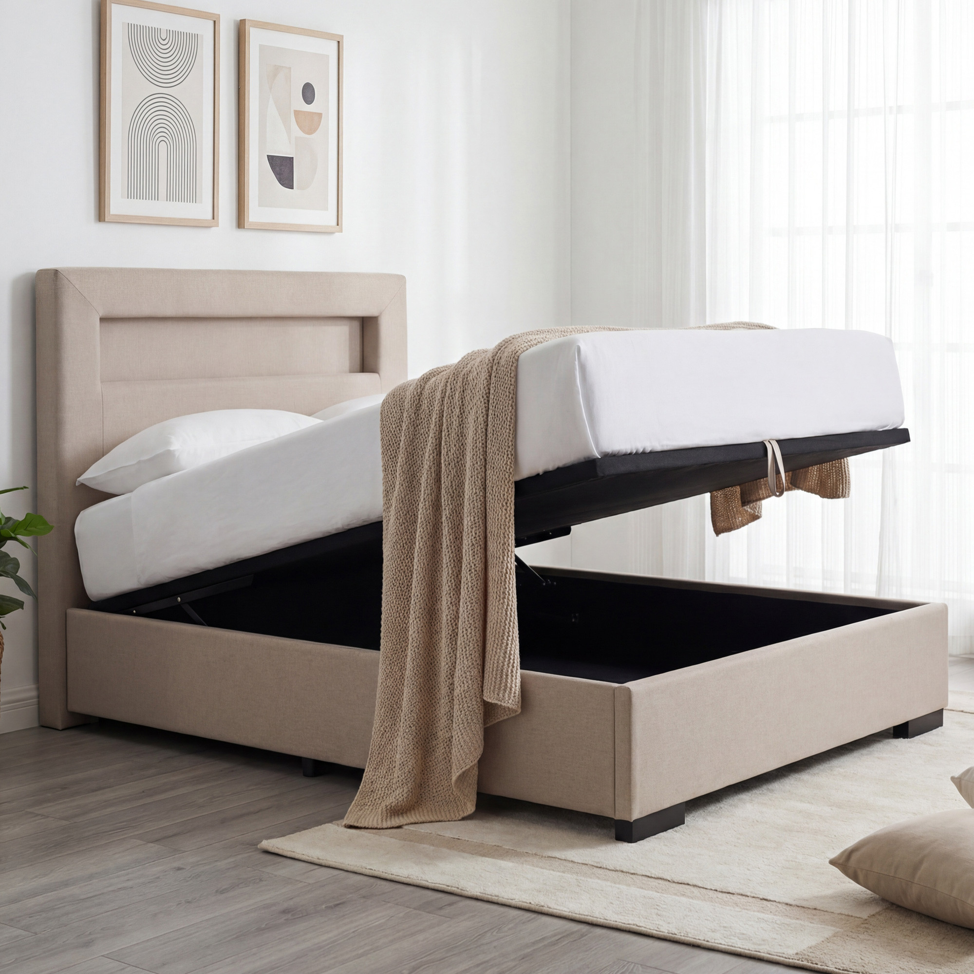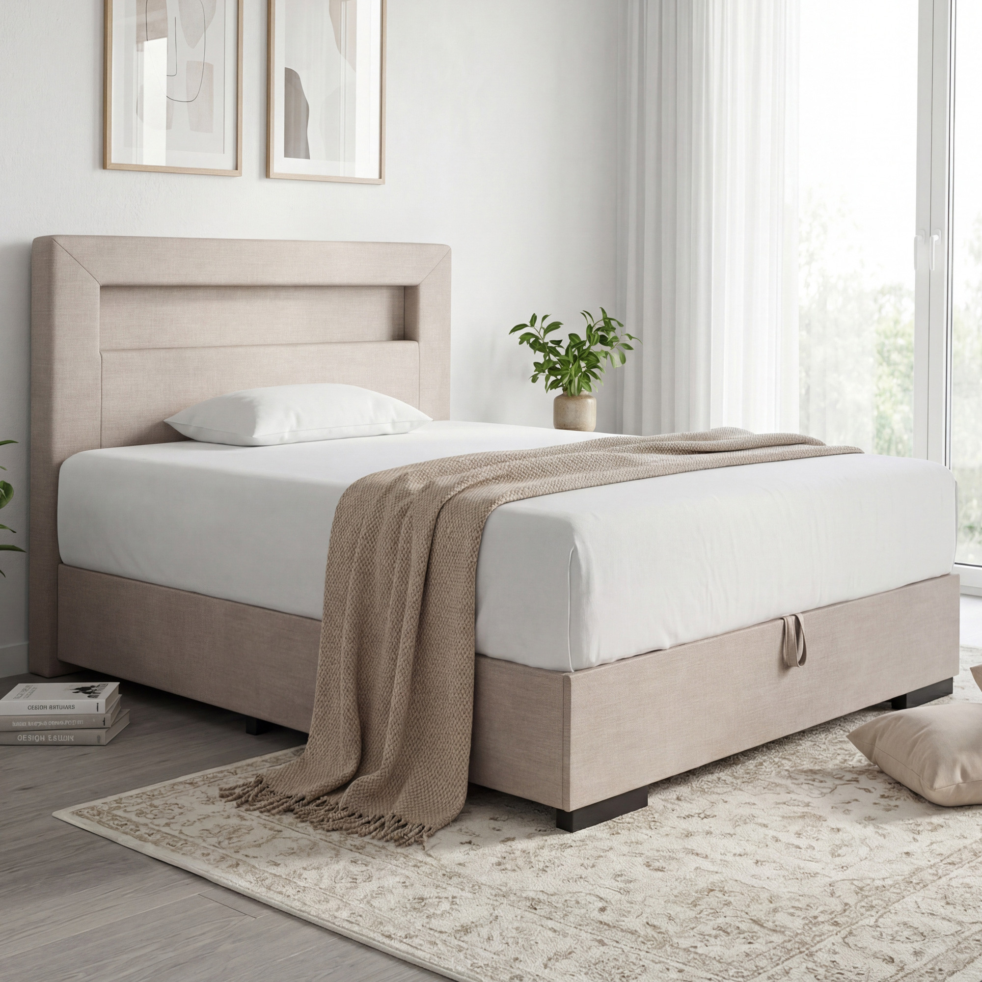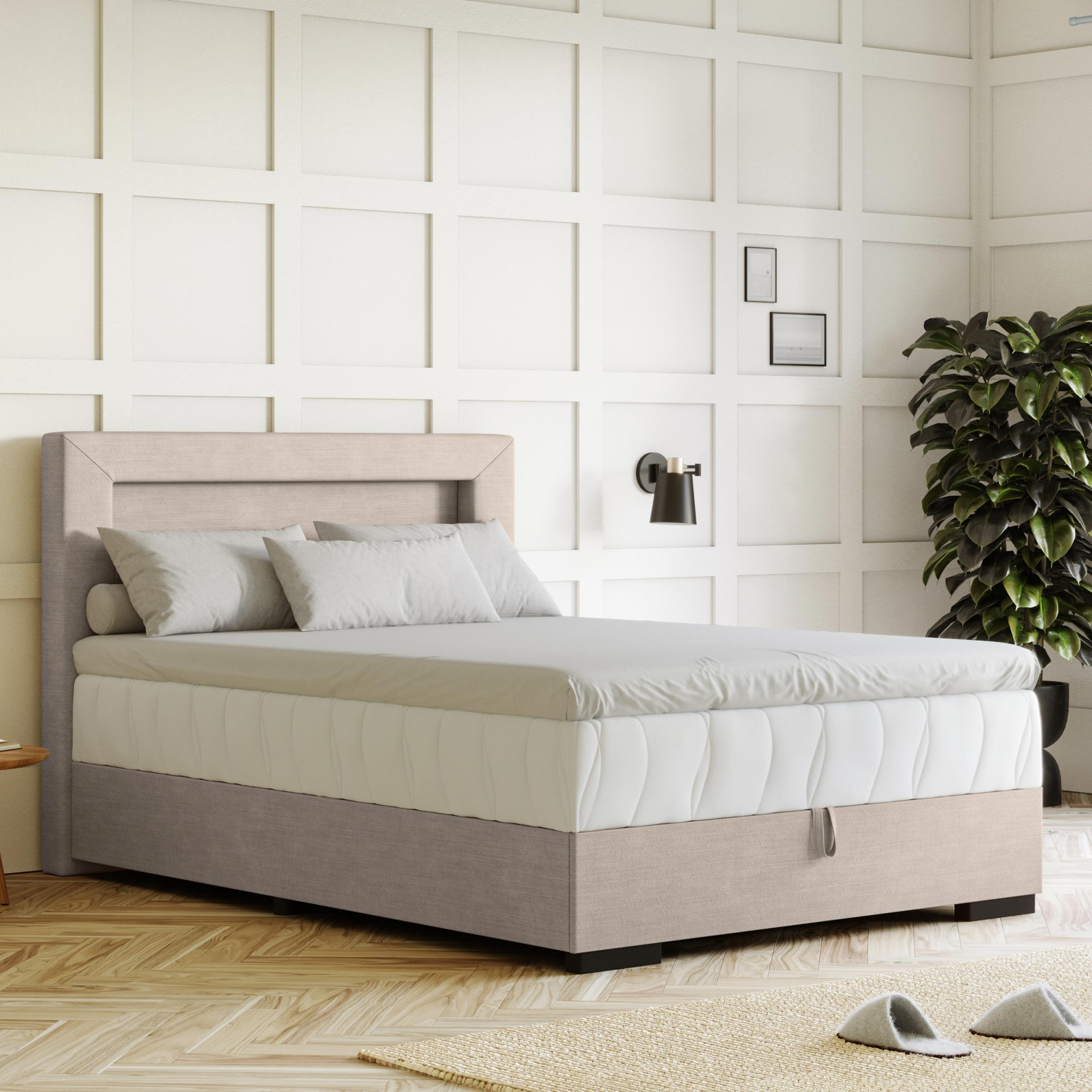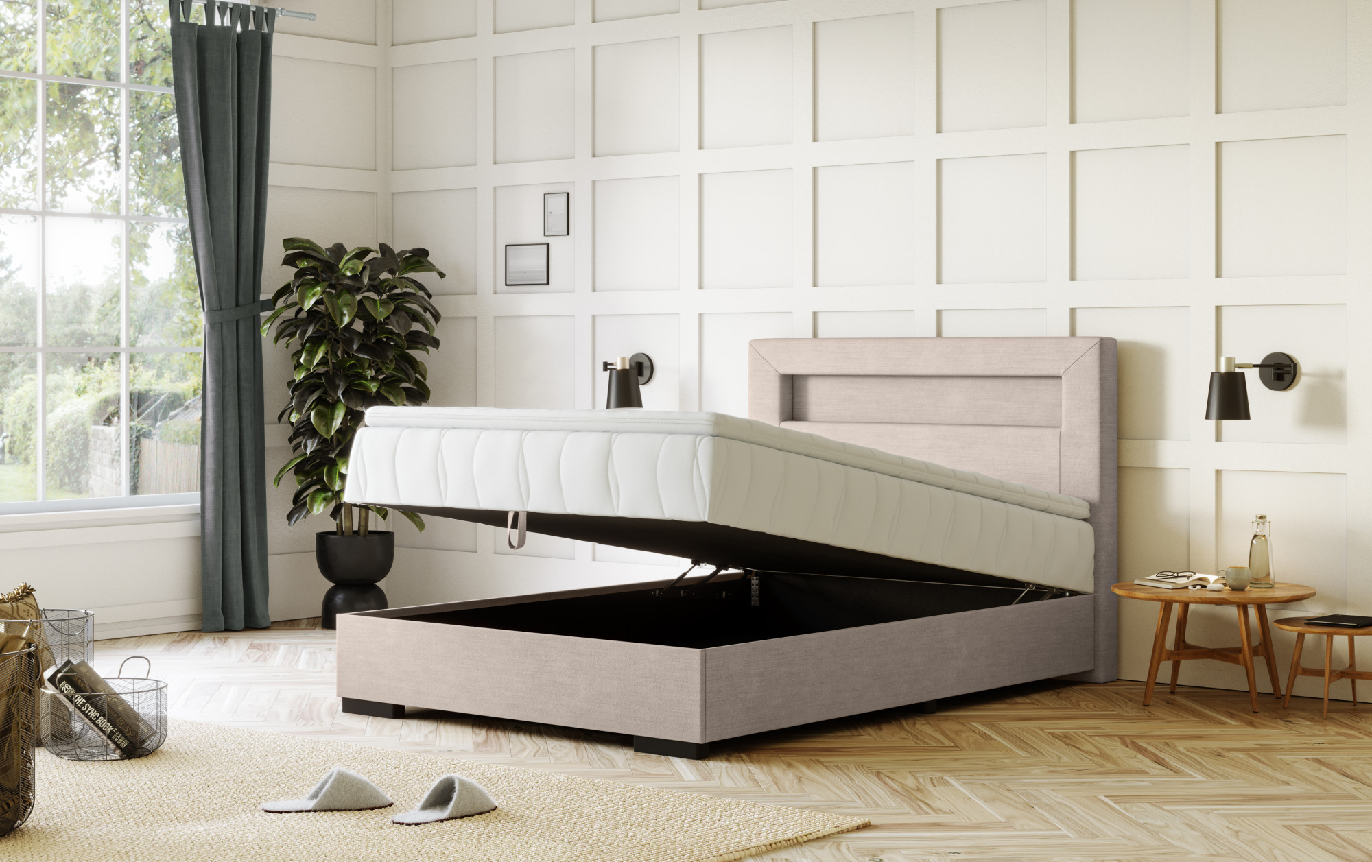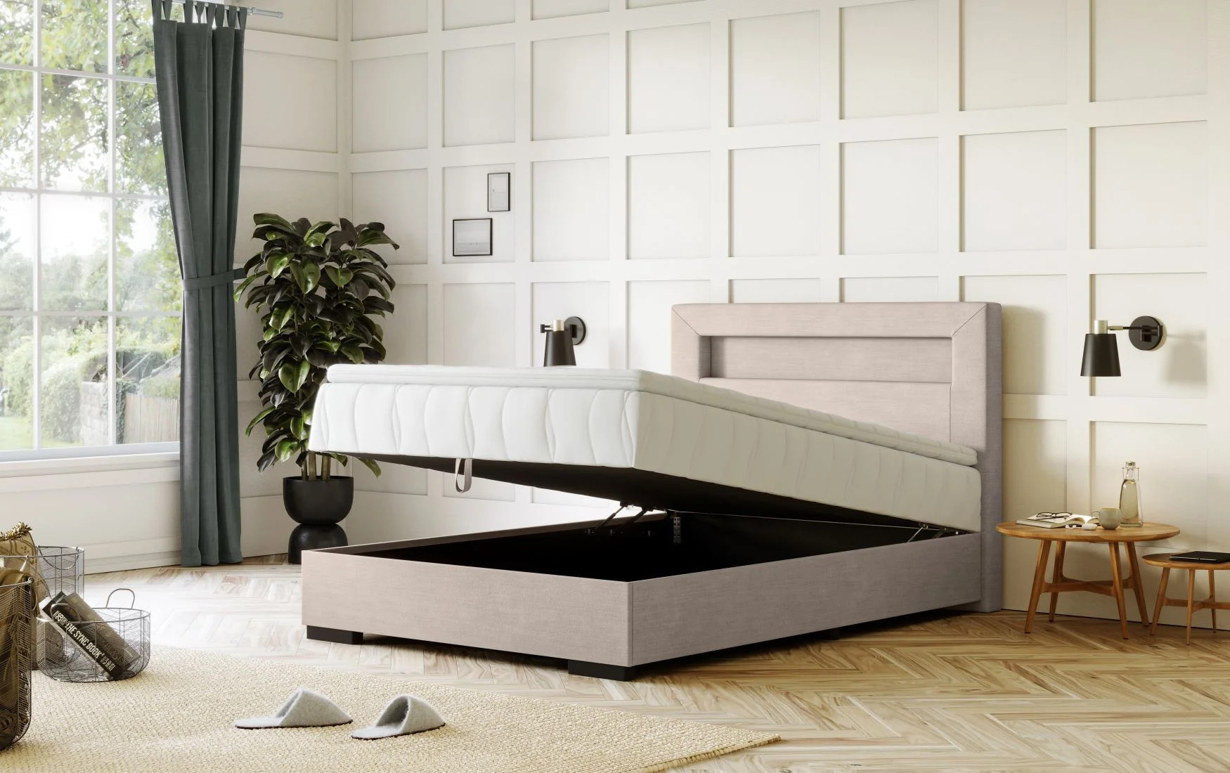 Bett 120 x 200 inklusive Matratze, Stauraum + LED (beige Farbe)