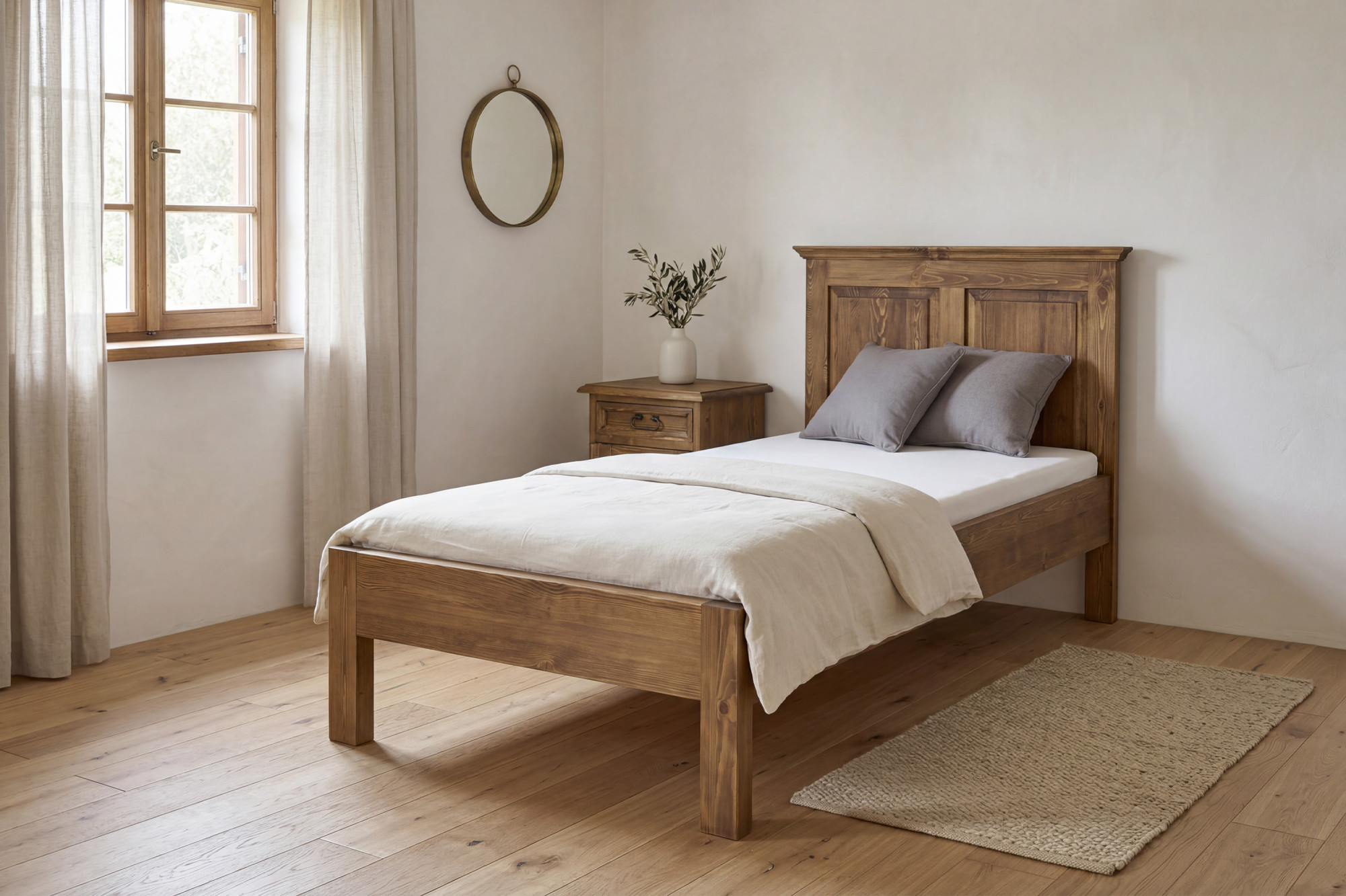 Suchen Sie ein einzelnes Massivholzbett 120 x 200 cm, das ehrliches handwerkliches Können, hohe Stabilität und den Charme des französischen Landlebens vereint? Dieses rustikale Bett aus 100 % Kiefernholz ist die ideale Wahl für das Schlafzimmer, das Gästezimmer oder ein stilvoll eingerichtetes Interieur. Dank der massiven Konstruktion bietet es hervorragende Festigkeit, lange Lebensdauer und ein zeitloses Aussehen, das nicht Modetrends unterliegt.