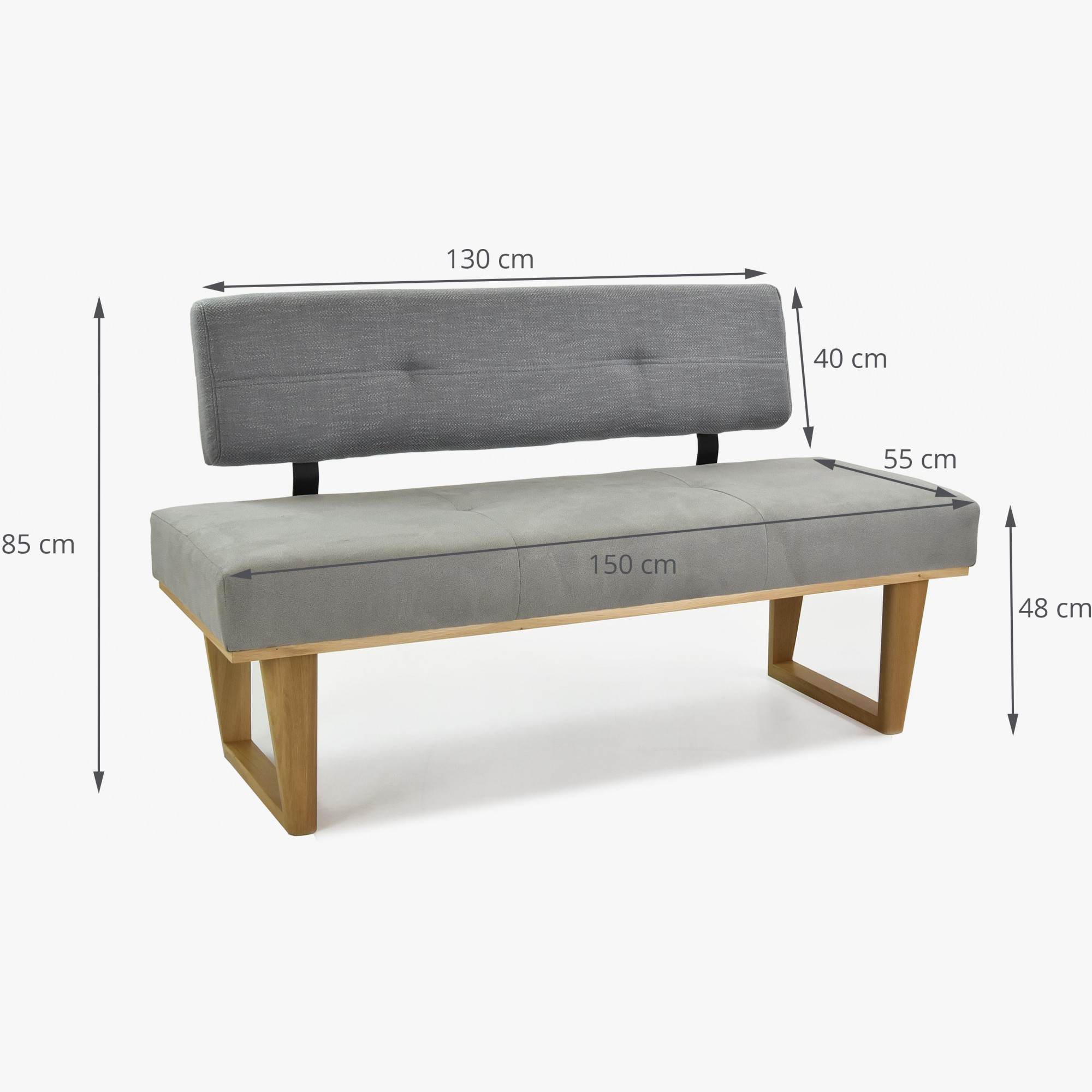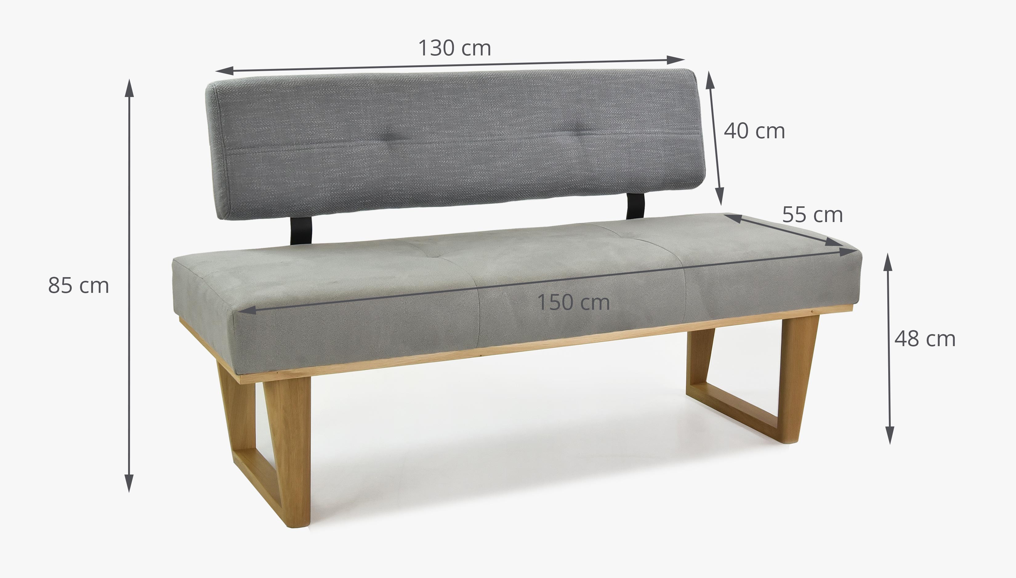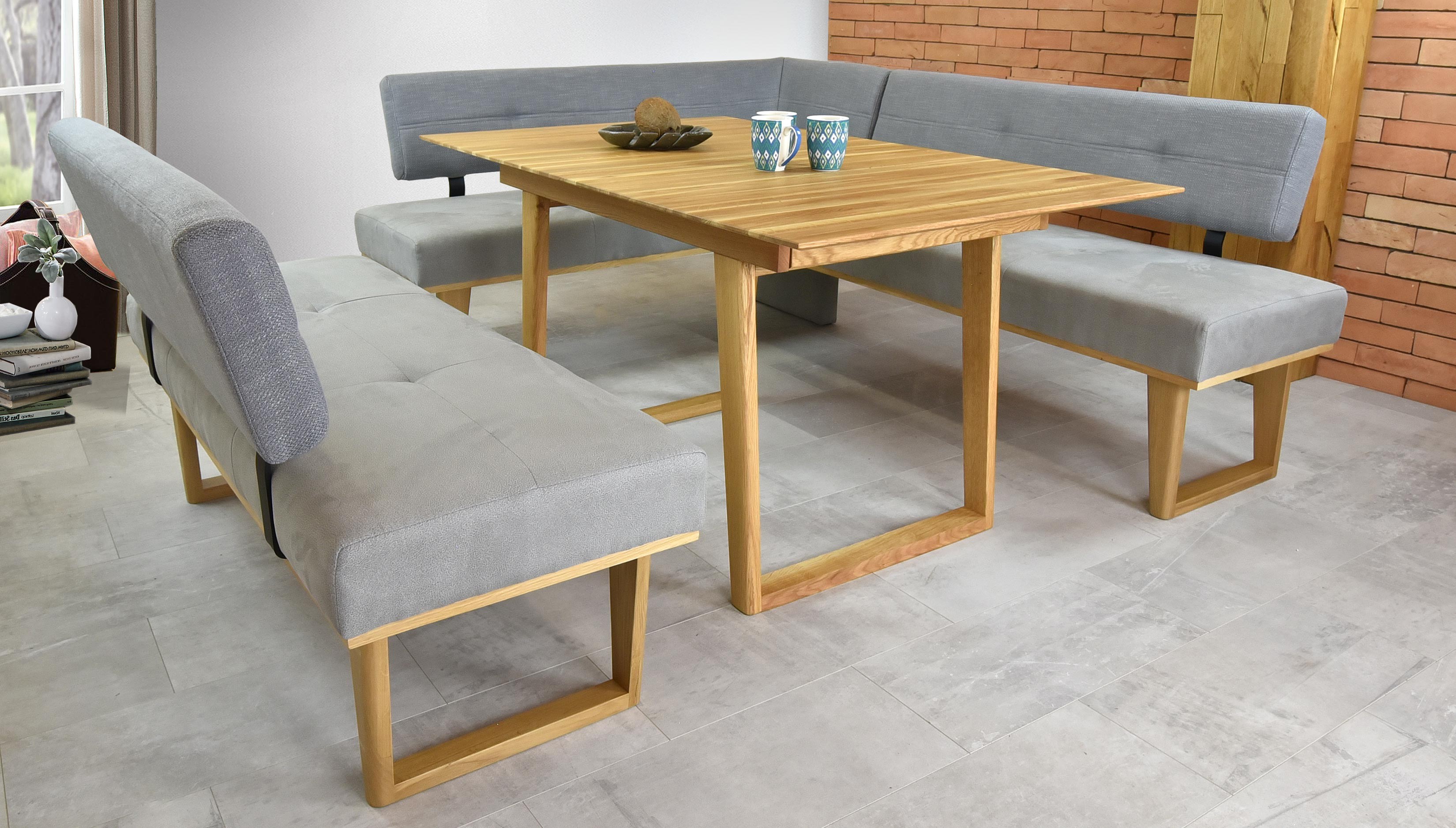 Luxuriöse Stoffbank aus erstklassigen Materialien für Ihre Küche oder Ihr Esszimmer gefertigt. Neuheit in unserem Angebot für das Jahr 2020. Die Bank Colmar bietet außergewöhnlich bequemen Sitzkomfort auch an langen Abenden. Die Bank ist 150 cm lang und auch in der Ausführung rechte Ecke oder linke Ecke erhältlich. Wunderschöne Kombination der Stoffe an der Rückenlehne und Sitzfläche in modernem Grauton. Die Beine der Bank sind aus Eichenholz mit wunderschöner Abrundung gefertigt. Die Bank wird zerlegt geliefert und lässt sich sehr einfach montieren.