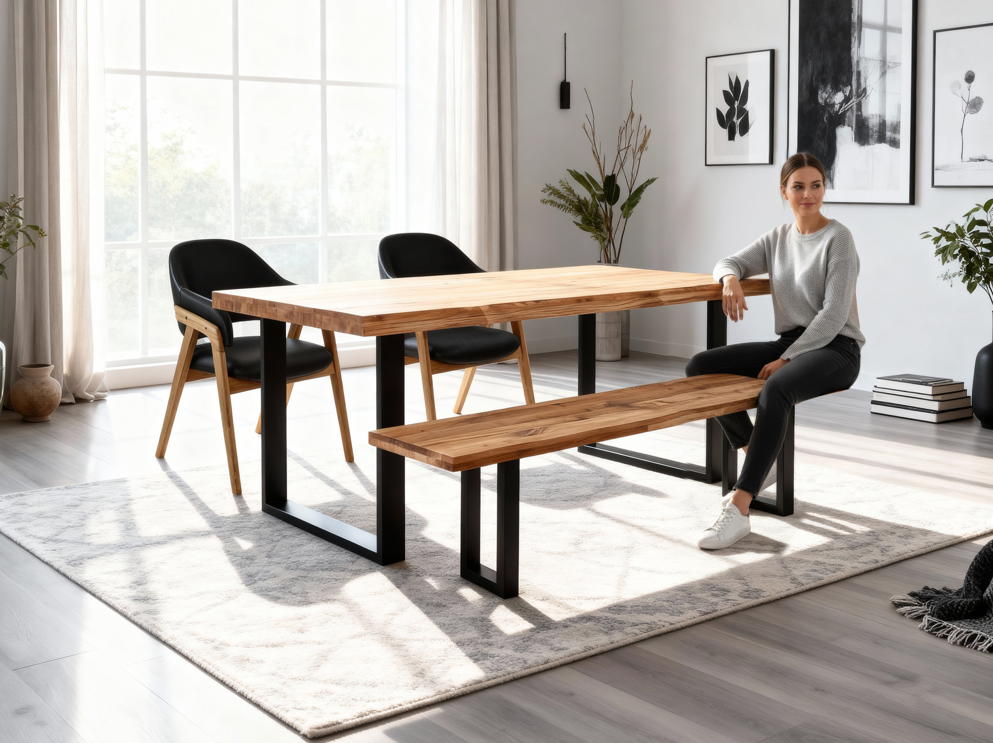 Ja, die Eichenbank passt perfekt zu unseren Esszimmertischen aus massivem Eichenholz. Dank der schwarzen Metallbeine ist sie zudem ideal für industrielle und moderne Einrichtungsstile. Die Sitzfläche mit der natürlichen Kante ergänzt jedes Holzmöbel wunderbar.