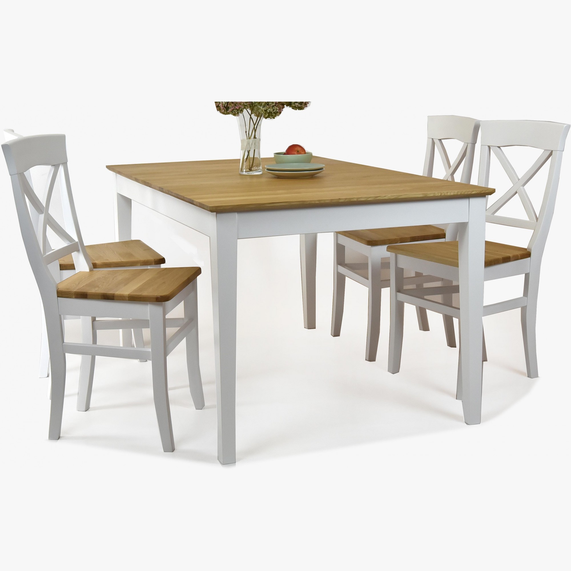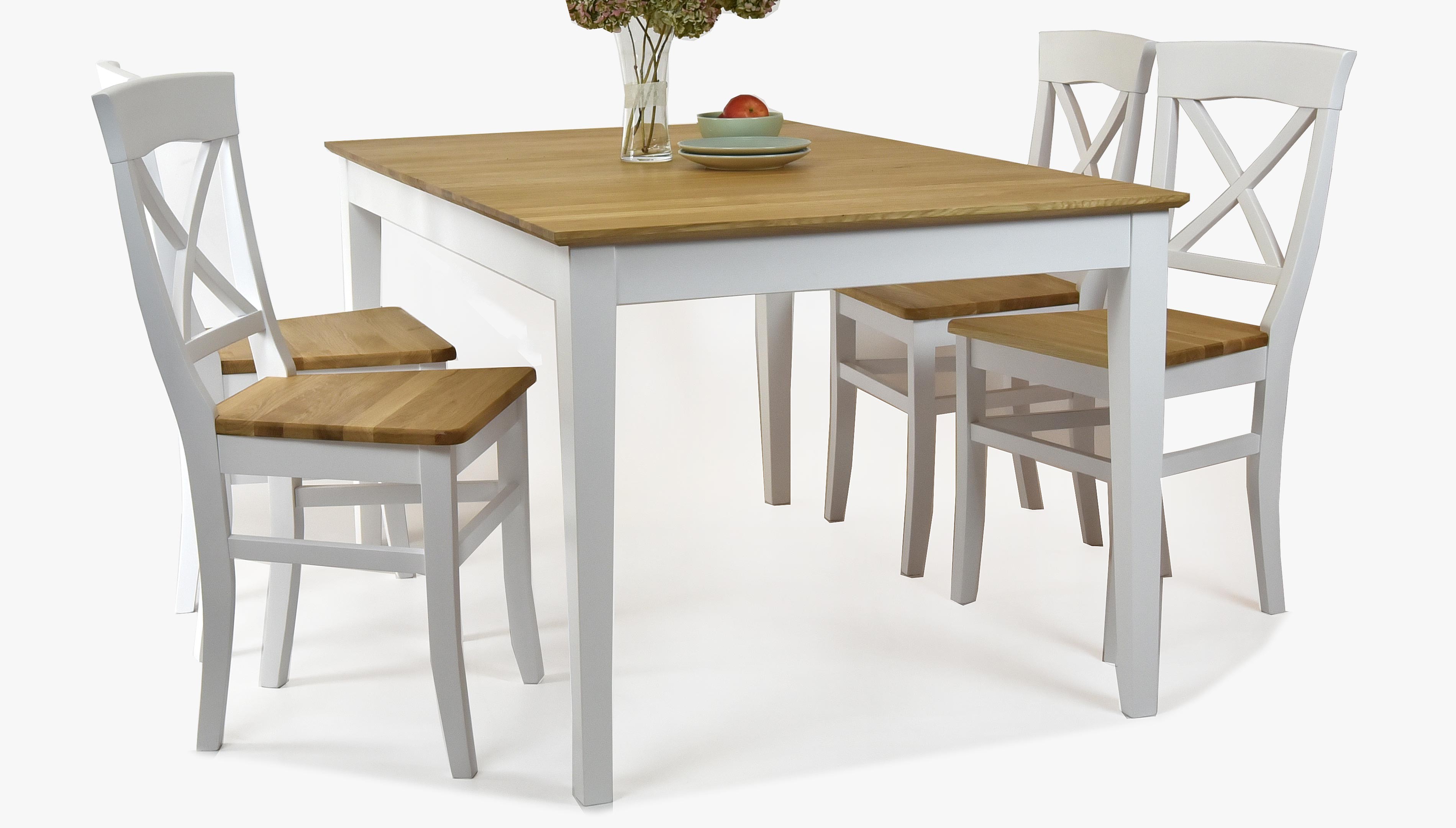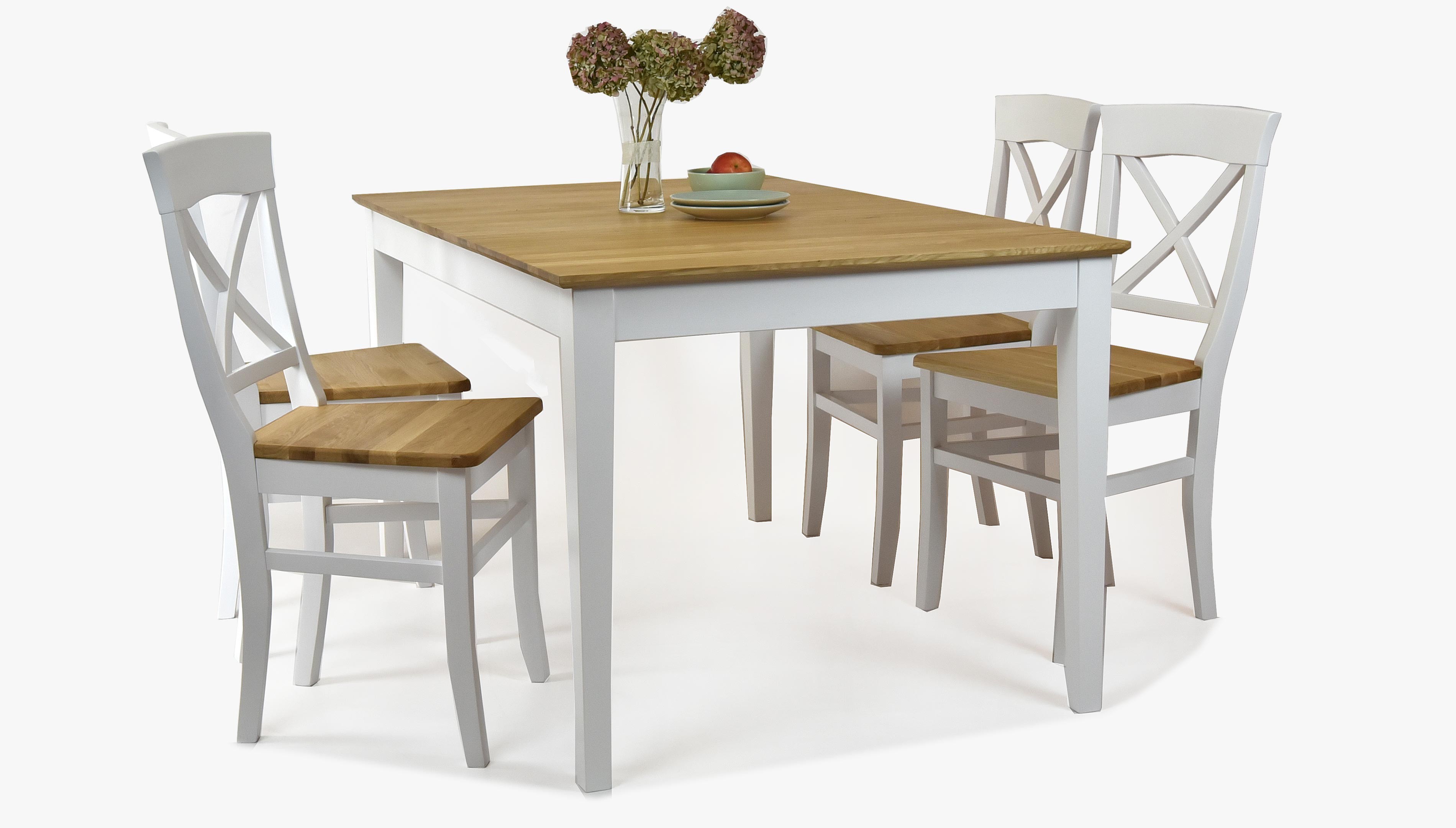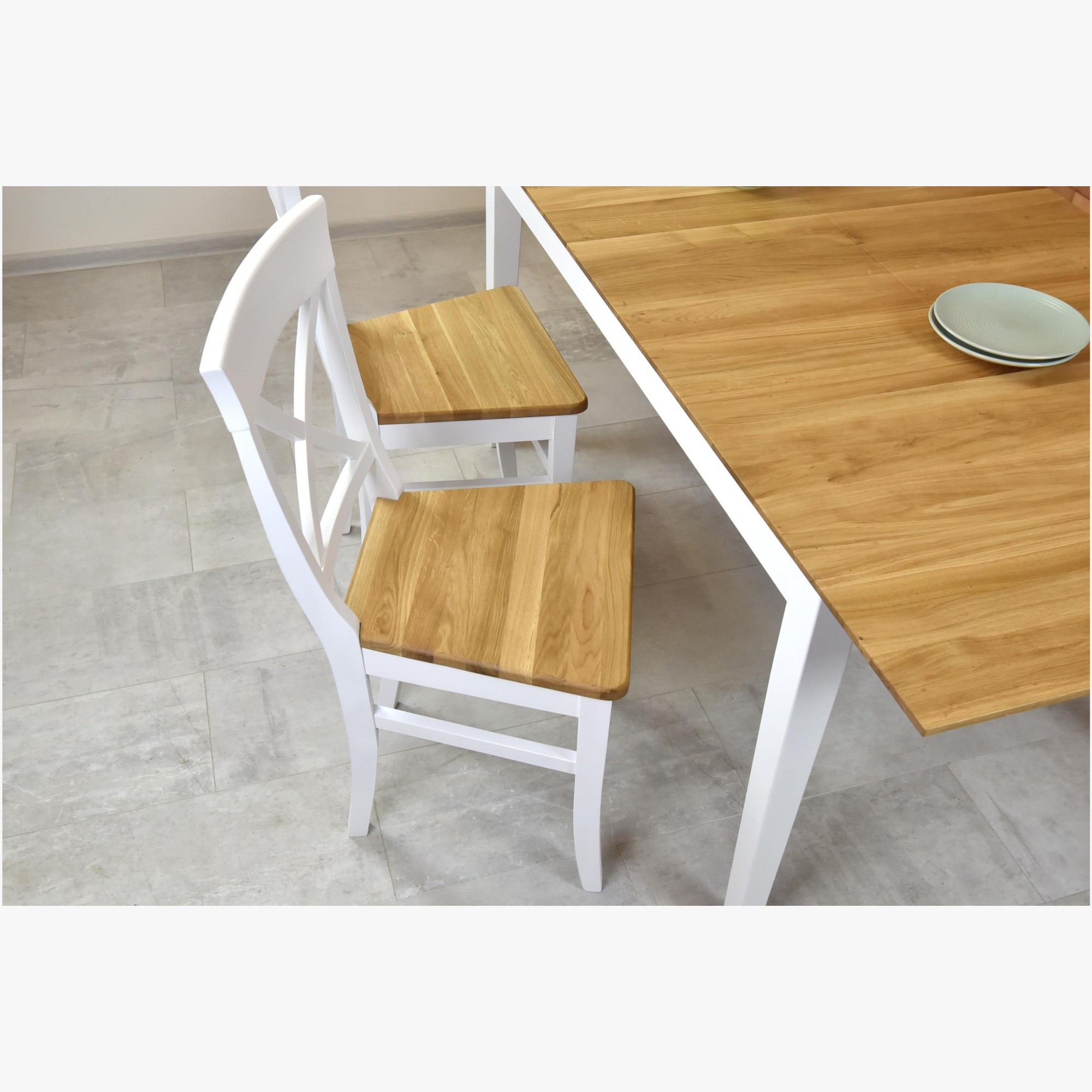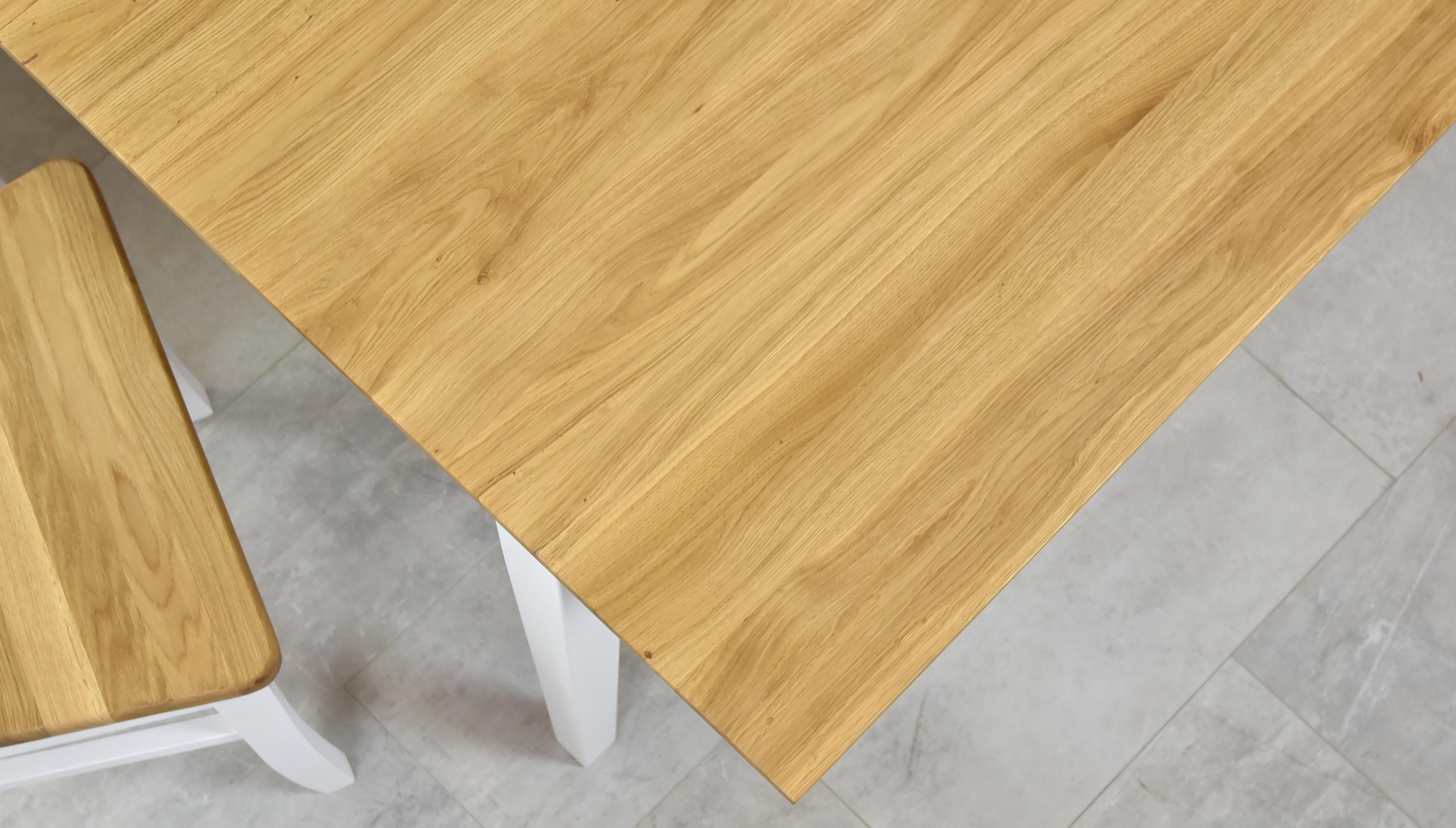 Wenn Sie auch bei der Auswahl neuer Möbel originell sein möchten, ist der massive Eichen-Esstisch die ideale Wahl. Zu diesem Eichen-Tisch können Sie bei uns auch passende Stühle auswählen, idealerweise in derselben Farbe und aus demselben Material. Ein wunderschöner Esstisch in der schönen Kombination Weiß + Eiche. Die Tischplatte ist aus ausgewähltem Eichenholz gefertigt, das nur ein Minimum an Ästen und Holzfehlern aufweist. Der weiße Teil des Holzes besteht aus gehärtetem Eschenholz. Dank des verwendeten harten Holzes ist der Tisch sehr stabil und robust.