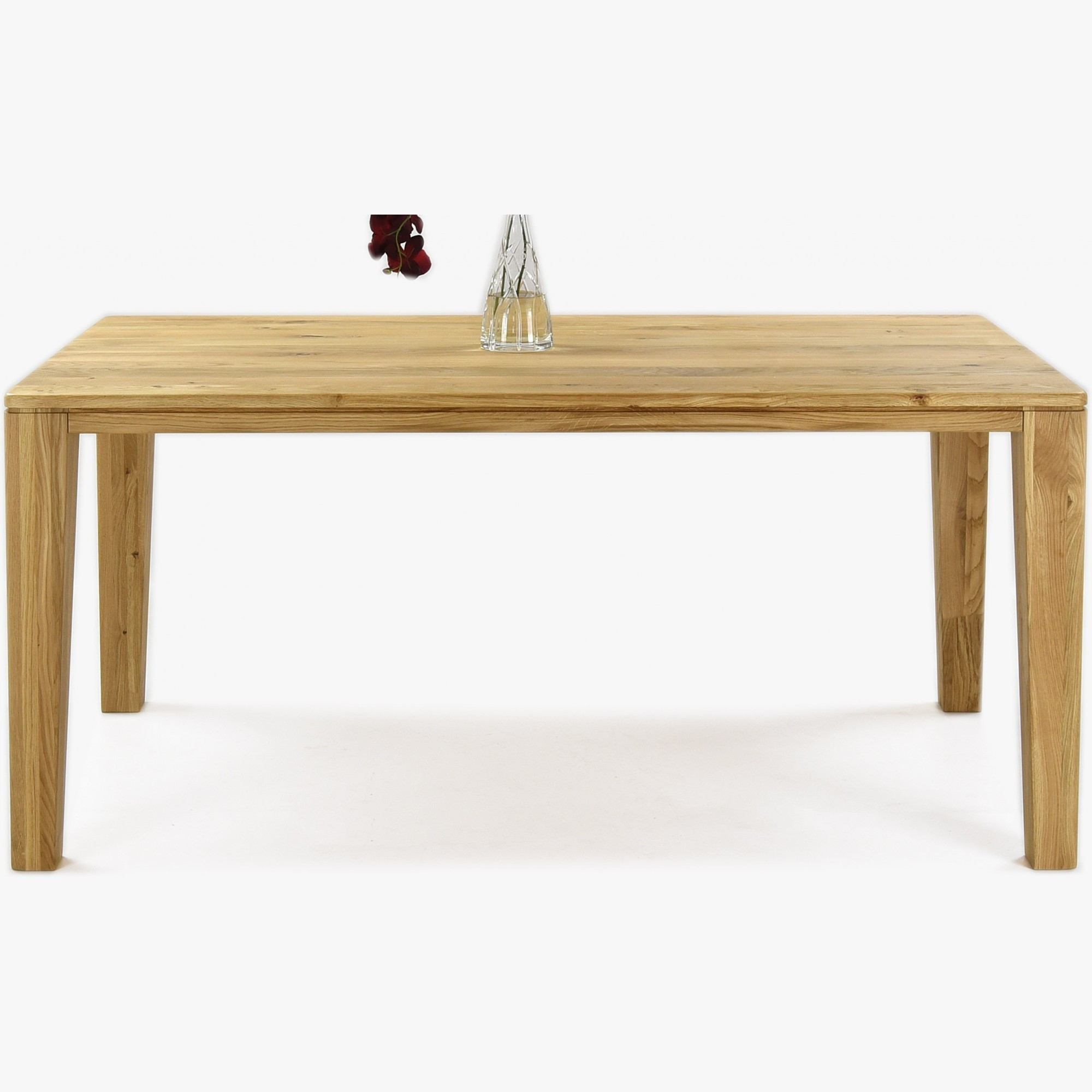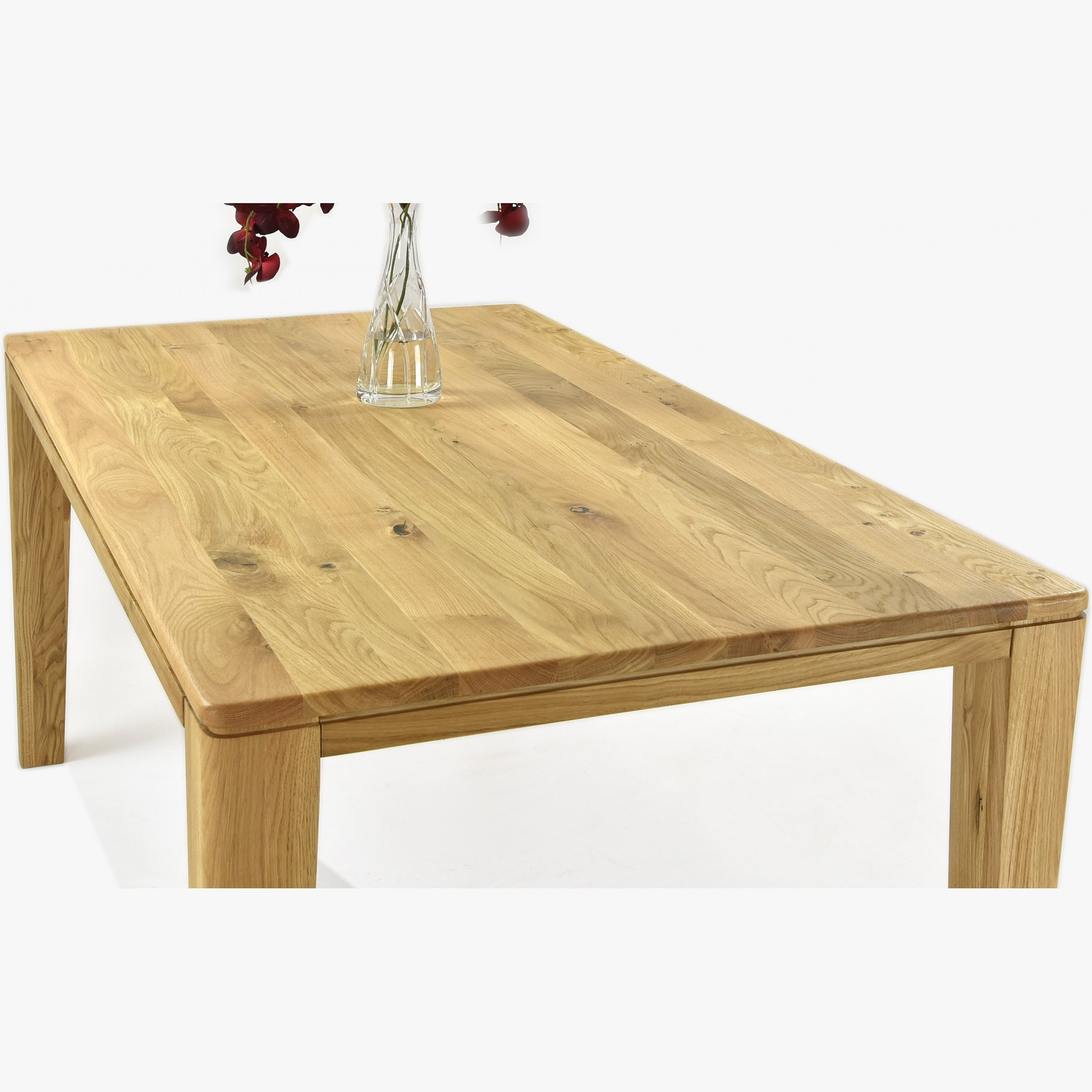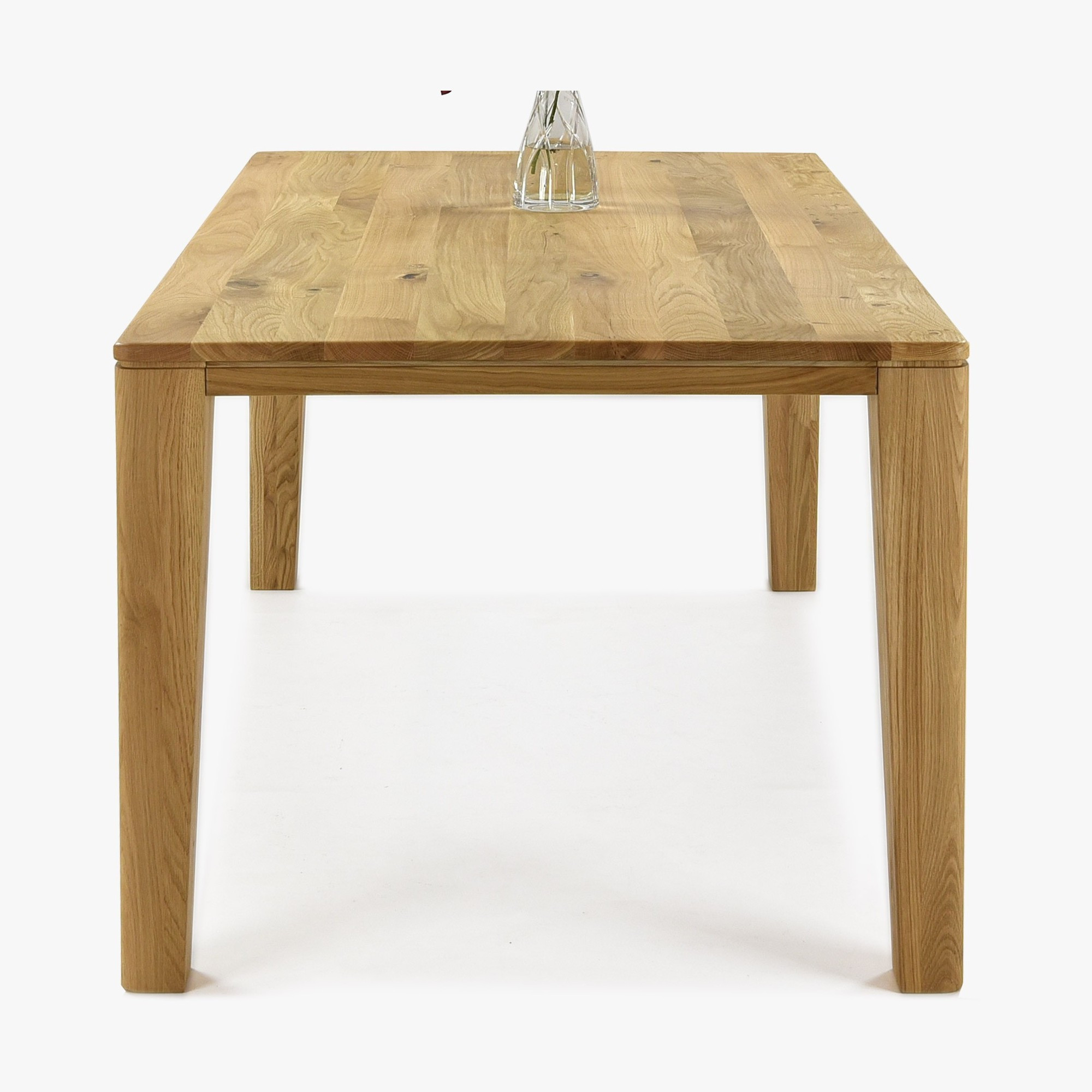 Design-Esstisch aus 100% massiver Eiche für eine praktische Nutzung. Gönnen Sie sich dieses designte luxuriöse Stück Esstisch. Ein großer Vorteil sind die abgerundeten Kanten und Ecken des Tisches. Vermeiden Sie dadurch unnötige Verletzungen. Massive, stabile Tischbeine mit den Maßen bis zu 10 x 10 cm garantieren eine hohe Stabilität des Tisches. Die Tischplatte ist bis zu 2 cm dick, was bei Eichenholz völlig ausreichend ist. Vorteilhaft sind die Beine, die am Tischende angebracht sind, so gewinnen Sie großen Platz für Ihre Stühle oder Sessel. Die Tischhöhe beträgt 76 cm, die Höhe bis zur Unterkante des Tisches beträgt bis zu 69 cm.