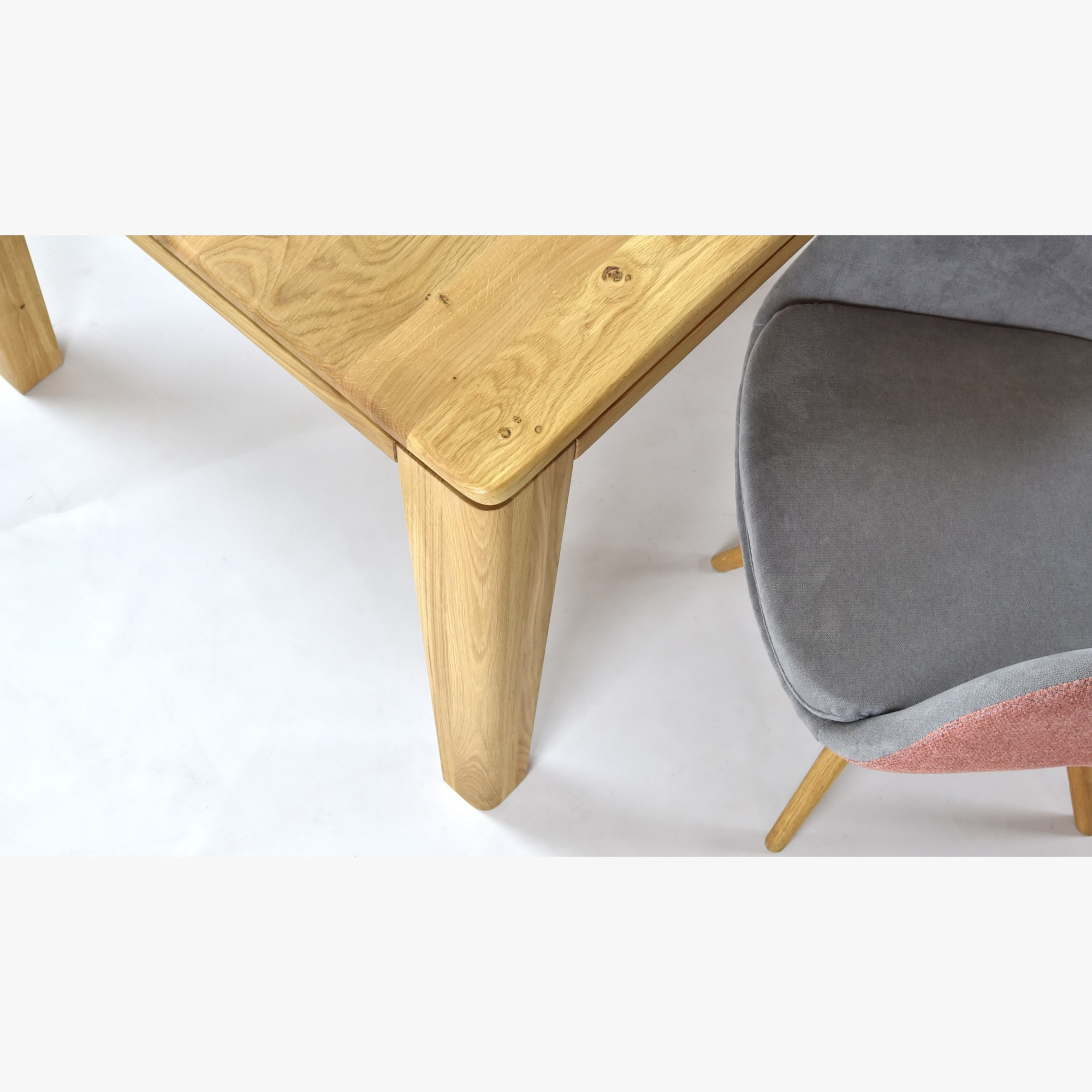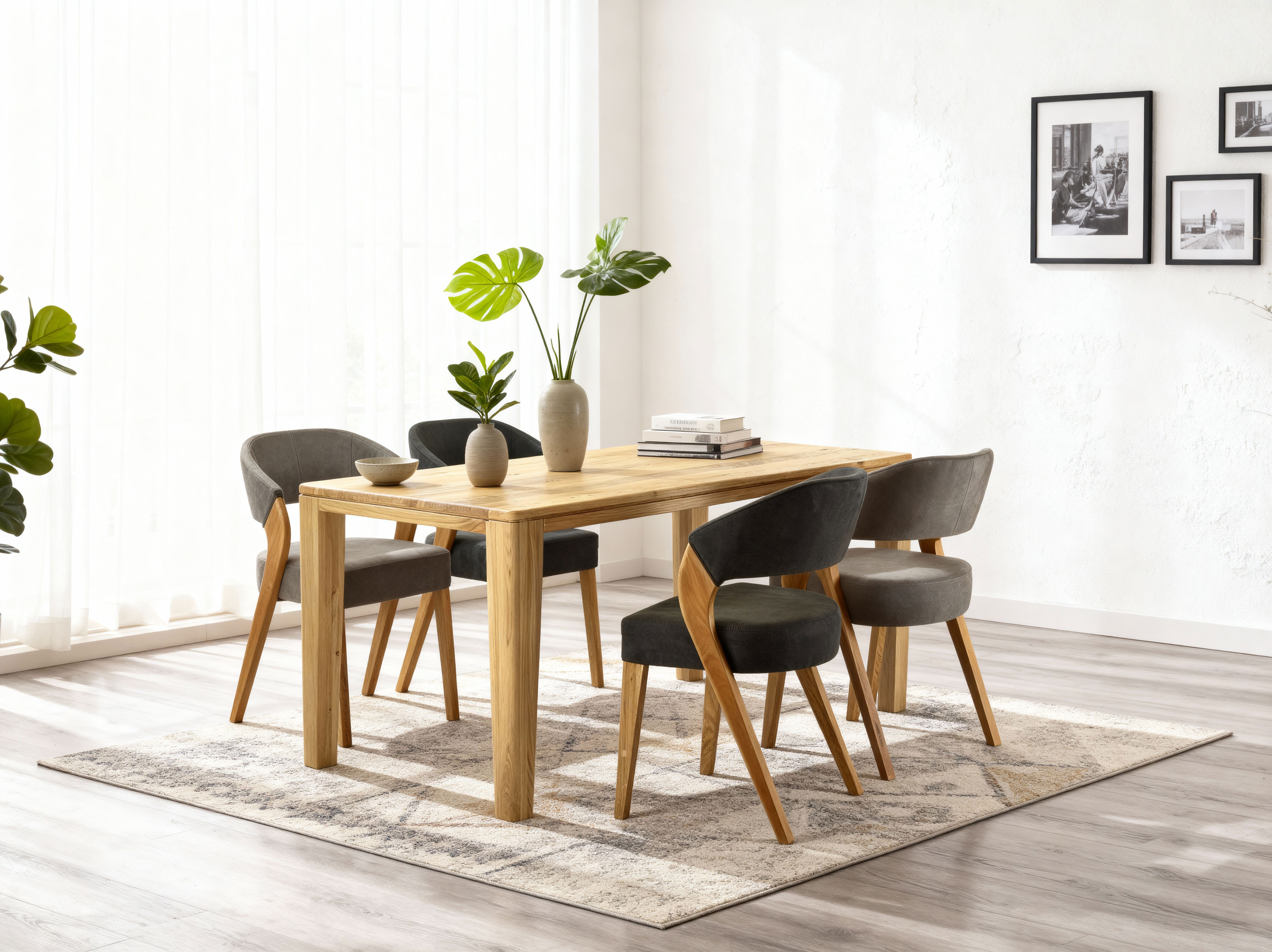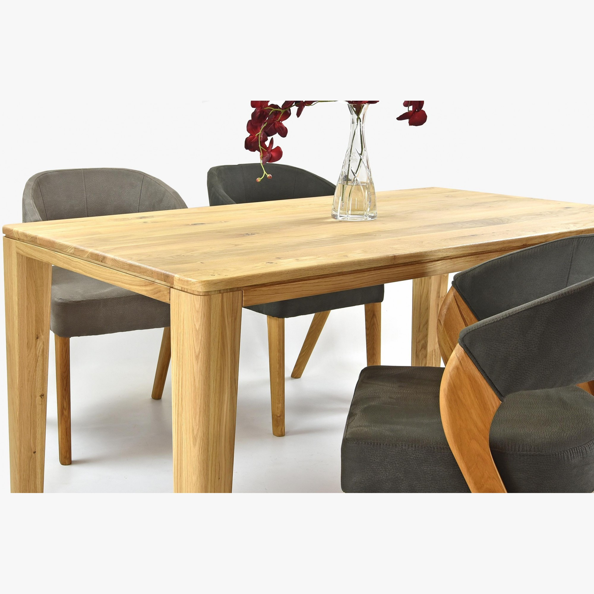 Design-Esstisch aus 100% massiver Eiche für eine praktische Nutzung. Gönnen Sie sich dieses designte luxuriöse Stück Esstisch. Ein großer Vorteil sind die abgerundeten Kanten und Ecken des Tisches. Vermeiden Sie dadurch unnötige Verletzungen. Massive, stabile Tischbeine mit den Maßen bis zu 10 x 10 cm garantieren eine hohe Stabilität des Tisches. Die Tischplatte ist bis zu 2 cm dick, was bei Eichenholz völlig ausreichend ist. Vorteilhaft sind die Beine, die am Tischende angebracht sind, so gewinnen Sie großen Platz für Ihre Stühle oder Sessel. Die Tischhöhe beträgt 76 cm, die Höhe bis zur Unterkante des Tisches beträgt bis zu 69 cm.