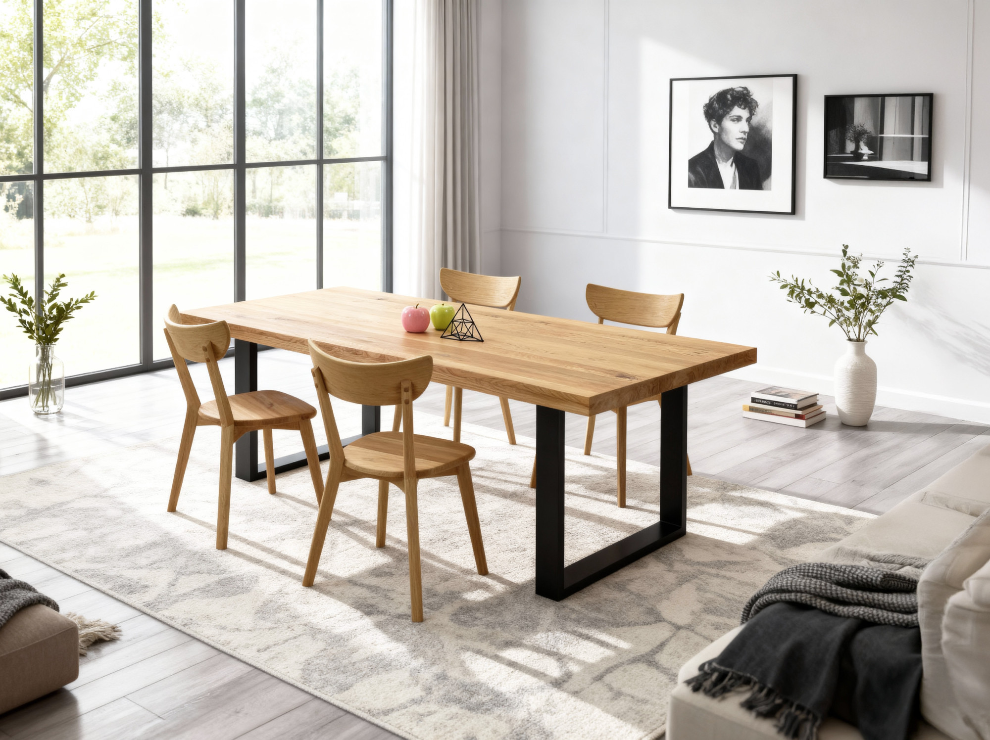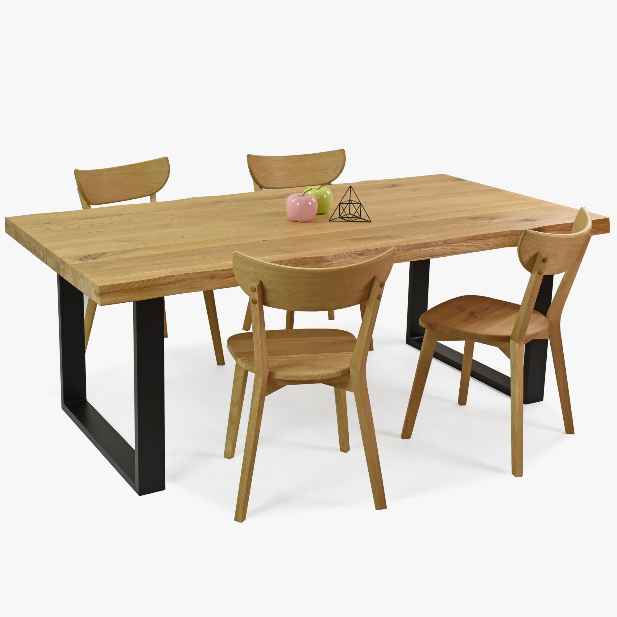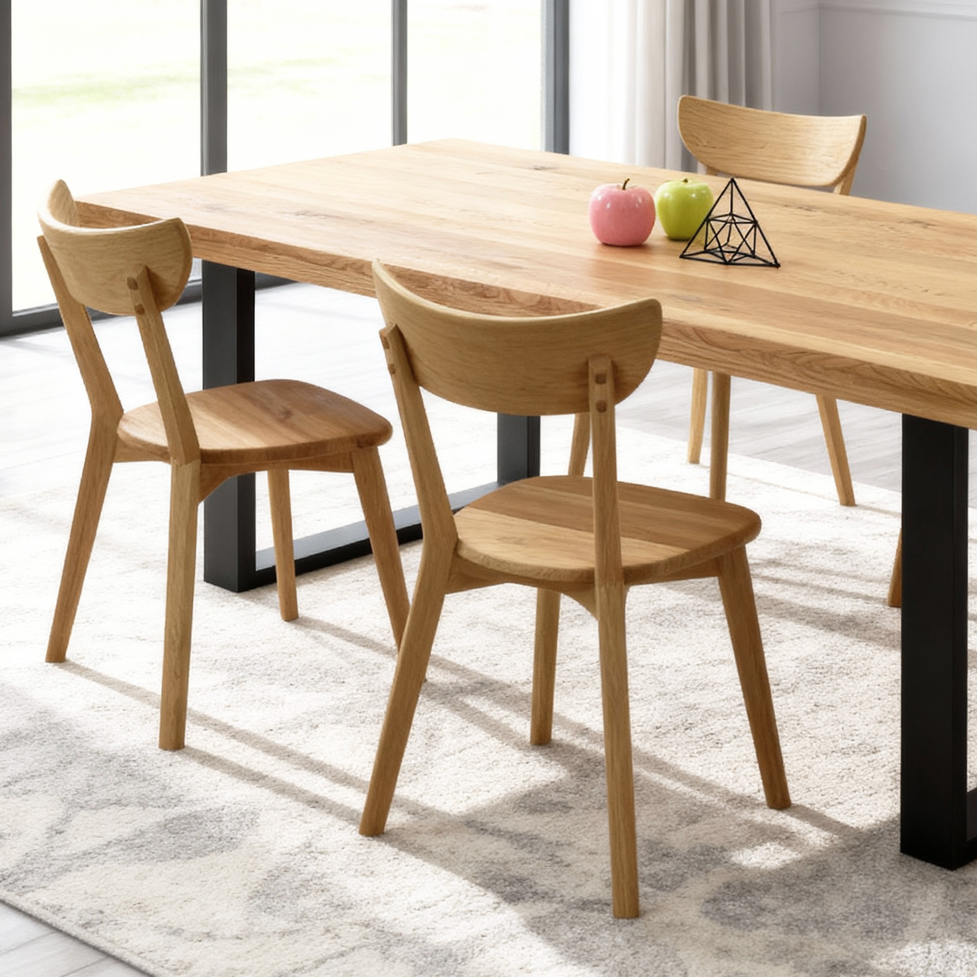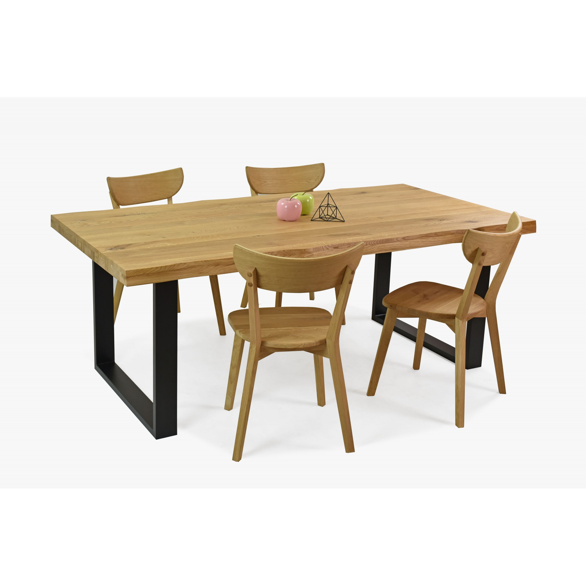 Die Stühle Eva, gefertigt aus dem gleichen Eichenholz, garantieren Festigkeit und Langlebigkeit, ohne den Stil zu beeinträchtigen. Mit dieser Kombination ist Ihr Essbereich bereit für Gastfreundschaft mit Anmut und Beständigkeit. Die Möbel sind mit ökologischem Öl in einem wunderschönen Farbton „Eiche natural“ veredelt, was ihre natürliche Schönheit unterstreicht. Dieses Esszimmer Set bietet zudem Flexibilität – Sie können es ganz nach Ihren Vorlieben zusammenstellen, sodass es perfekt in Ihren Innenraum passt.