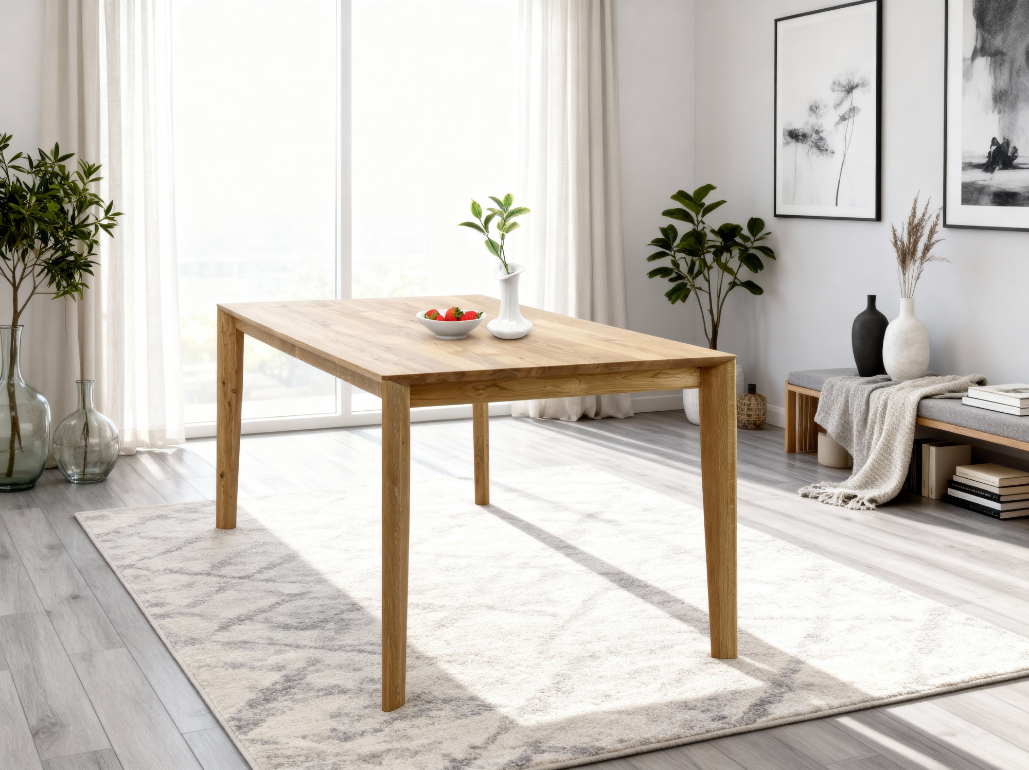 Wenn Sie einen hochwertigen Eichen-Esstisch suchen, der Widerstandsfähigkeit, elegantes Design und natürliche Schönheit verbindet, ist dieses Modell die ideale Wahl. Durch das FSC-zertifizierte Holz erhalten Sie die Sicherheit einer nachhaltigen Herkunft und die Öloberfläche sorgt für lange Haltbarkeit sowie einfache Pflege. Dieser Tisch aus massivem Eichenholz wird zu einem Ort, an dem Sie täglich gemeinsame Momente mit Familie und Freunden teilen.