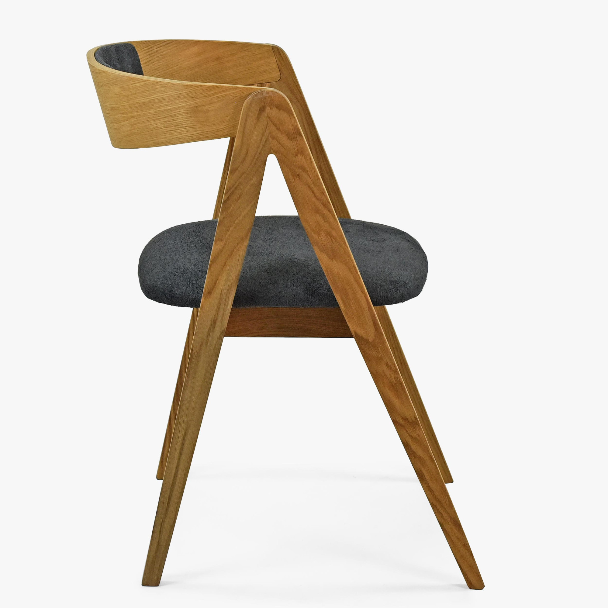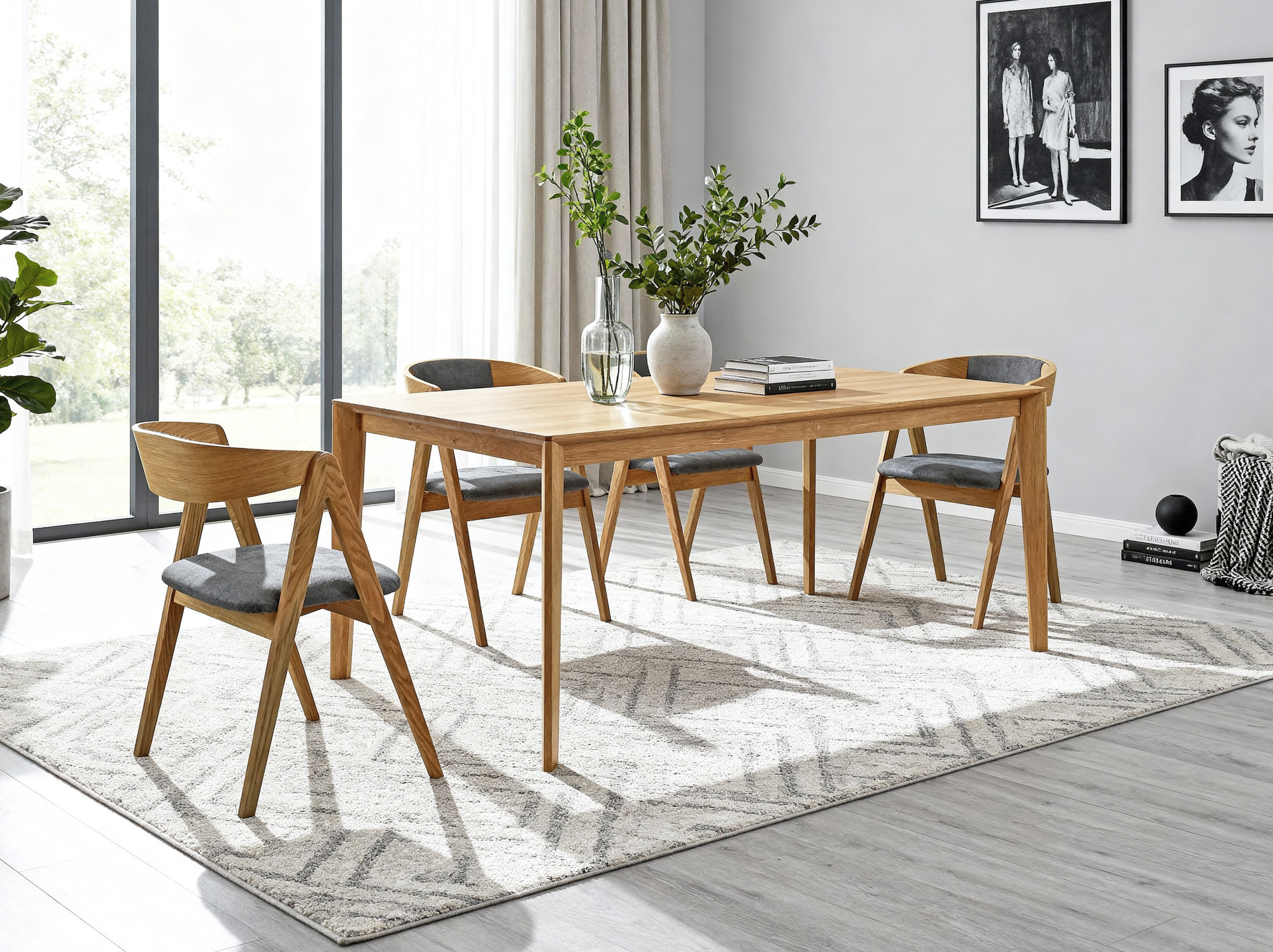 Zum Set gehören 4 Designer-Stühle Maja, die ebenfalls aus Eichenholz gefertigt sind. Ihre bequeme, abgerundete Rückenlehne ist mit strapazierfähigem Stoff in modernem Graphitgrau bezogen, was dem gesamten Ensemble ein raffiniertes Aussehen verleiht. Die Stühle werden komplett montiert geliefert und sind sofort einsatzbereit. Ein Vorteil ist der ökologische Ursprung des Materials – FSC-Zertifizierung, die eine nachhaltige Holzgewinnung garantiert. Das Set lässt sich leicht mit weiteren Eichenholzmöbeln kombinieren und so zu einem harmonischen Gesamtbild im Interior abstimmen. Dieses Ensemble wird nicht nur ein praktischer Platz für das tägliche Essen, sondern auch ein dominantes Element in Ihrem Zuhause sein.