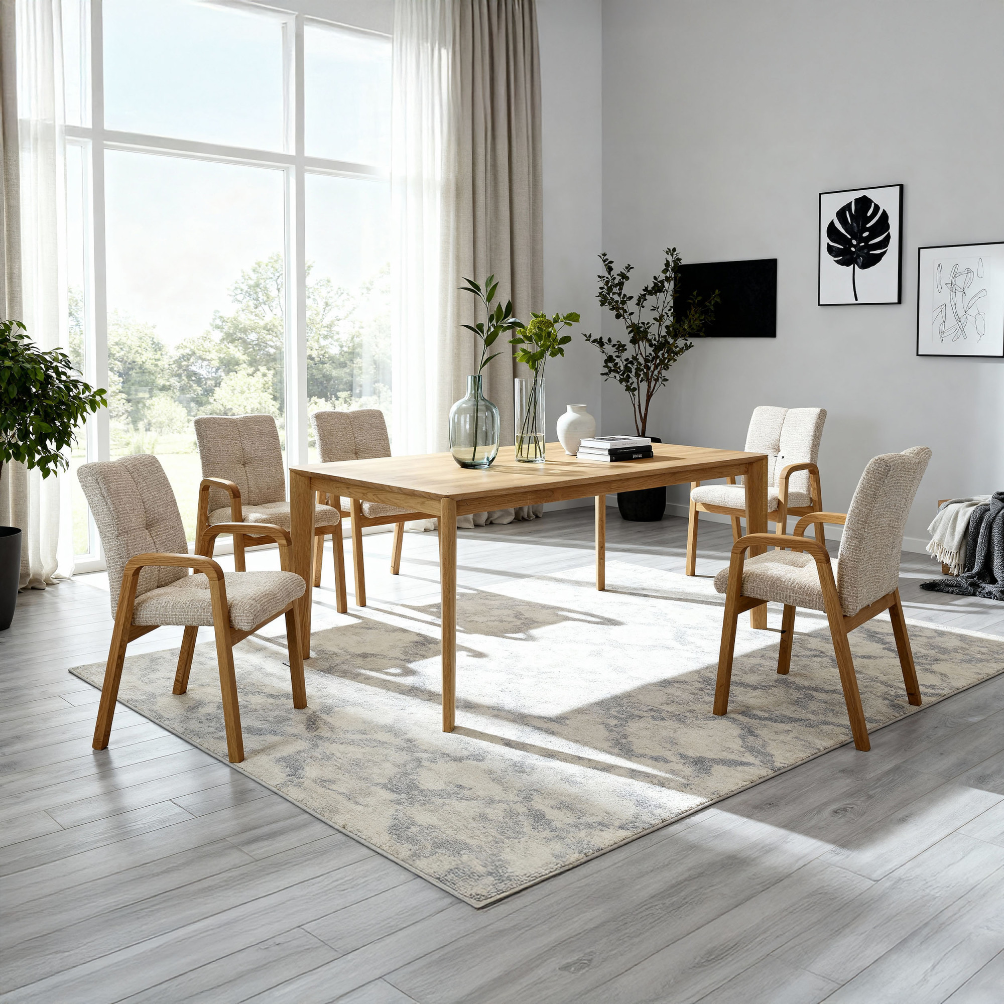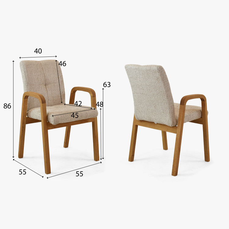 Zum Set gehören elegante Stühle Ori mit Armlehnen, die nicht nur durch ihr Aussehen, sondern auch durch ihren Komfort überzeugen. Gefertigt aus massivem Eichenholz in der Farbe natur Eiche, mit Polsterung aus widerstandsfähigem, strukturiertem Stoff in beigen Tönen (Gewicht 580 g/m², Widerstand 160.000 Martindale-Zyklen), bieten sie auch bei täglichem Gebrauch bequemen Sitzkomfort. Die Oberfläche der Stühle ist mit natürlichem Öl behandelt, das die natürliche Holzstruktur bewahrt und ihm ein mattes, warmes Aussehen verleiht. Dieses Esszimmer-Set vereint Funktionalität, Ästhetik und Beständigkeit – die perfekte Wahl für jedes Interieur, in dem natürliche Eleganz dominiert.