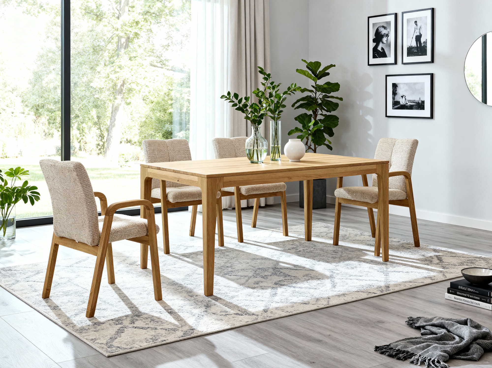Zum Set gehören auch elegante Stühle Ori, die natürliche Eiche mit weichem beigefarbenem Stoff kombinieren. Hergestellt aus massivem Eichenholz im Farbton Natural Eiche und mit natürlichem Öl behandelt, verleihen sie dem Interieur eine warme und natürliche Ausstrahlung. Das Polster besteht aus robustem Stoff mit einem Gewicht von 580 g/m² und einer Martindale-Beständigkeit von 160.000 Zyklen, was außergewöhnliche Haltbarkeit garantiert. Die abgerundeten Armlehnen und ergonomisch geformten Sitzflächen bieten bei jeder Mahlzeit perfekten Komfort. Das Set Lukas & Ori ist die ideale Wahl für alle, die eine Kombination aus natürlichen Materialien, modernem Design und funktionaler Praktikabilität suchen.