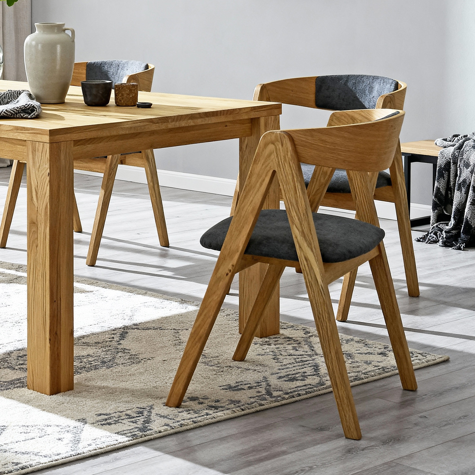 * Auf dem Bild der Eichentisch Bratislava und das Esszimmerstuhl Maja in dunkelgrauem Stoff