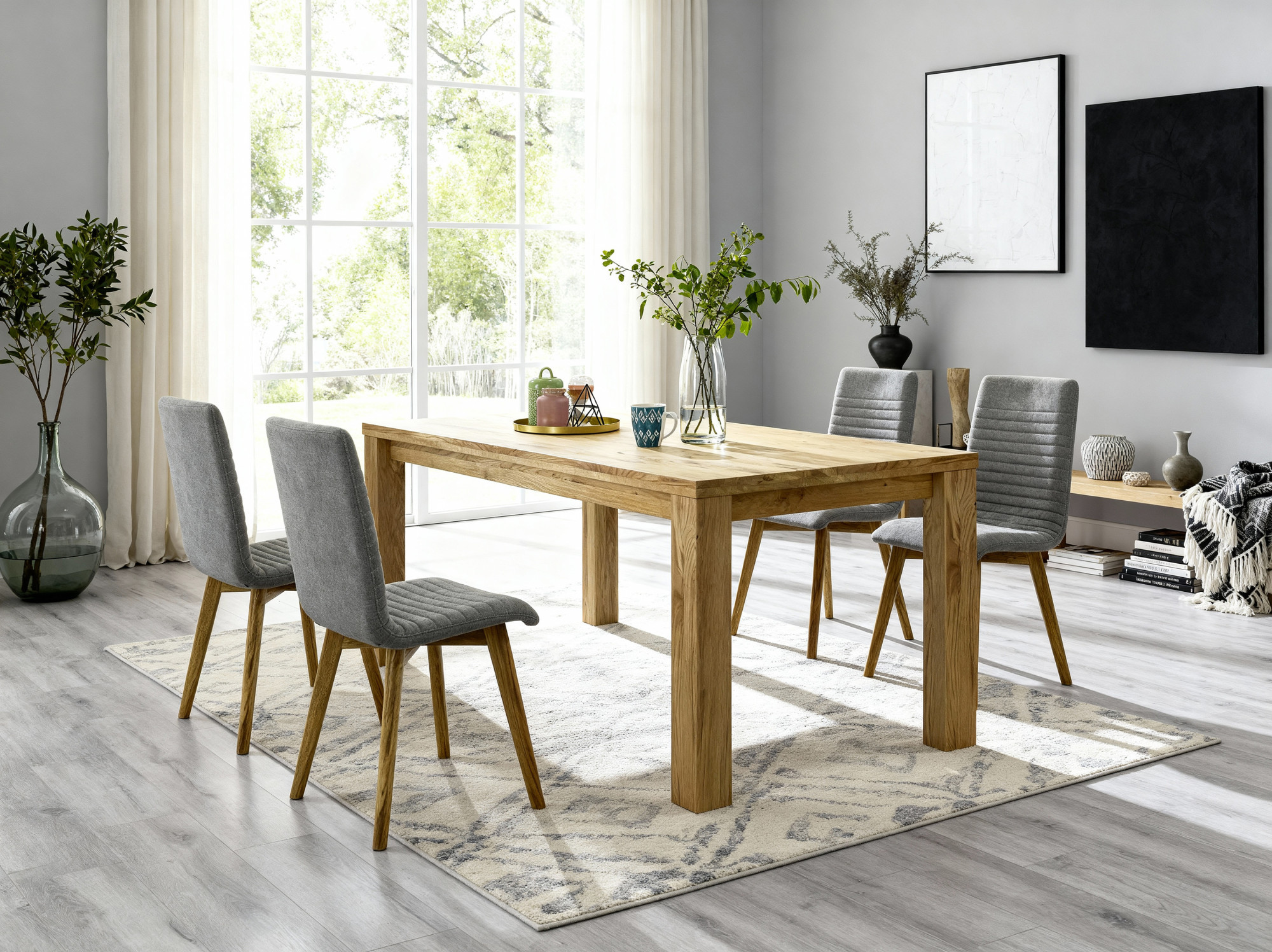 * Auf dem Bild der Eichentisch Bratislava und die Esstisch- Stühle Arosa in hellgrauem Stoff