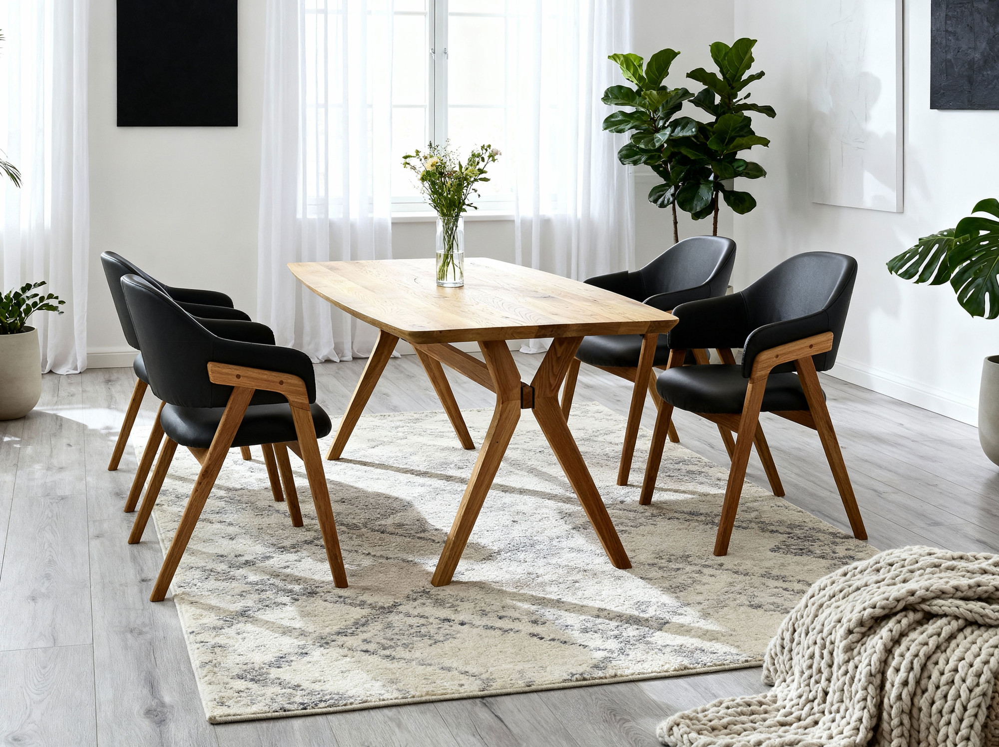 - Lässt sich dieses Set mit anderen Möbeln kombinieren? Ja, Eichen-Natur und schwarze Polsterung passen zu modernen, skandinavischen und klassischen Interieurs.