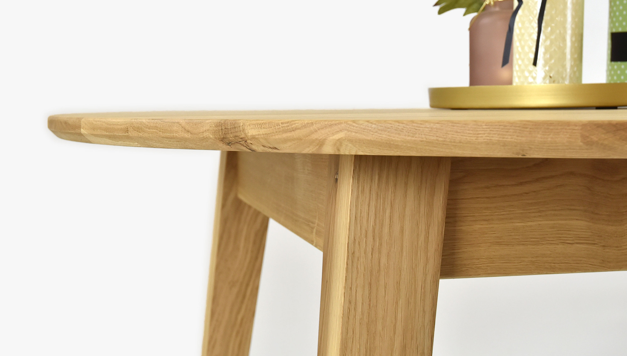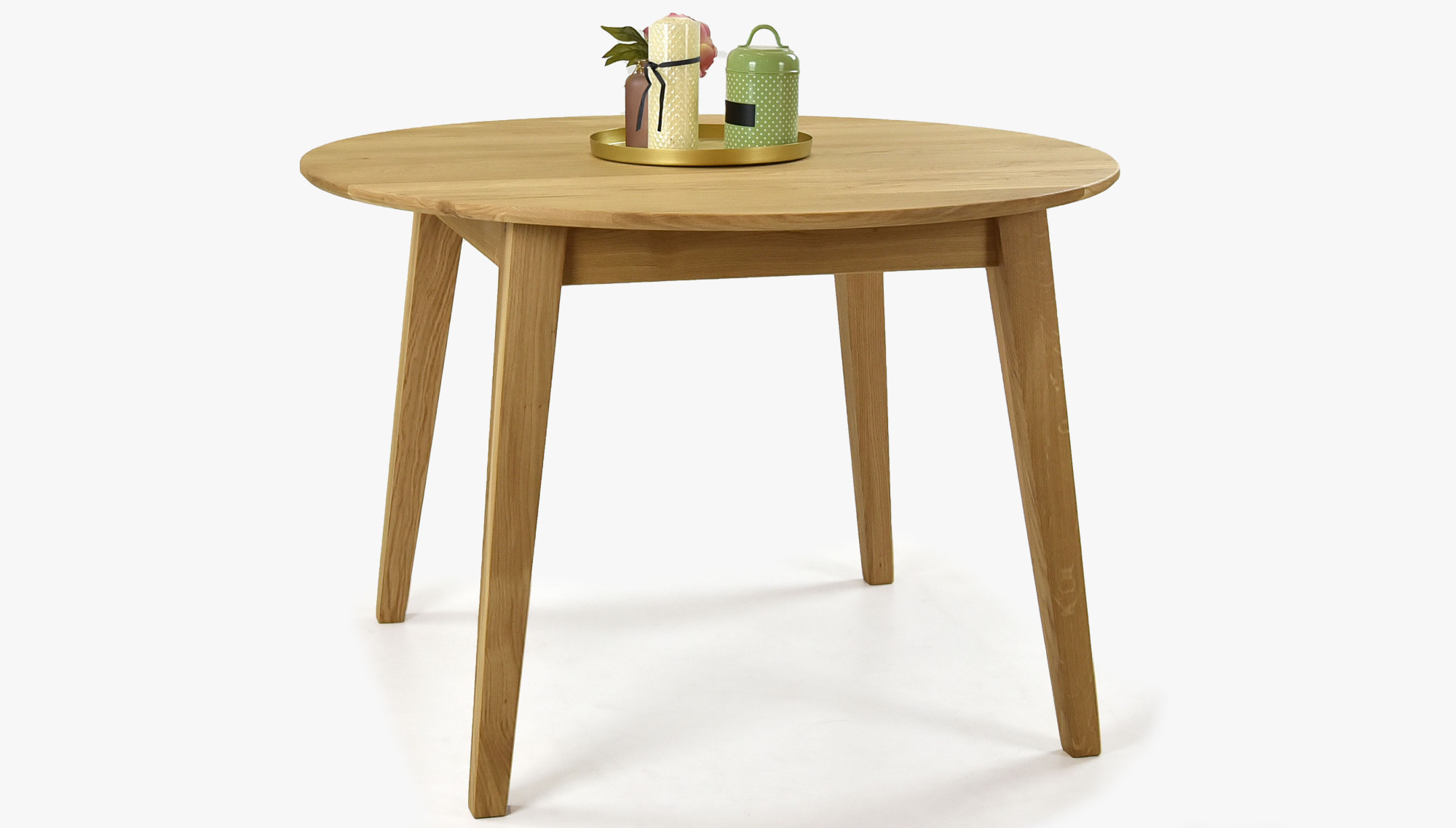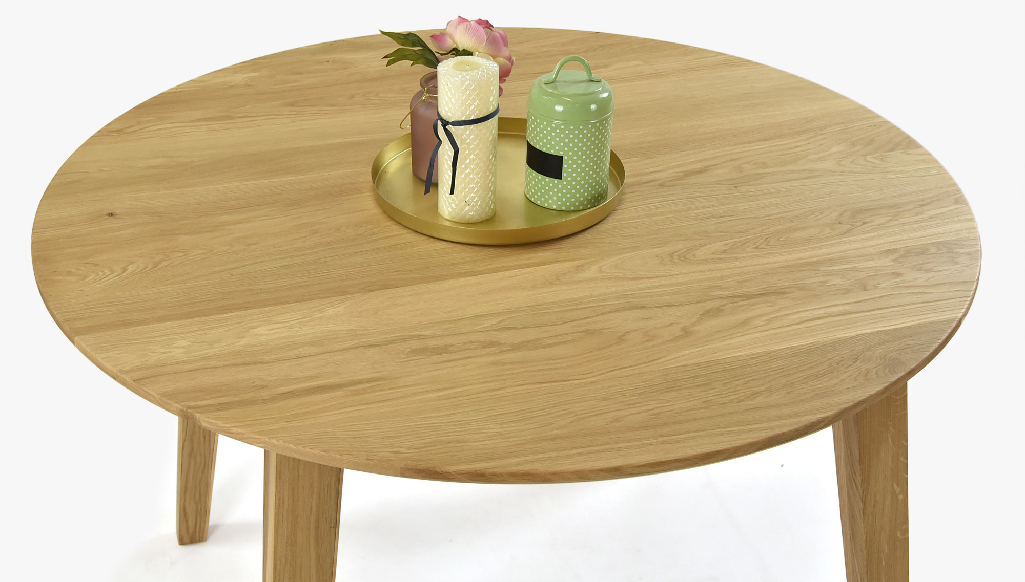 - Massiver Eichentisch mit einem Durchmesser von 90 cm – ideal für 4 Personen