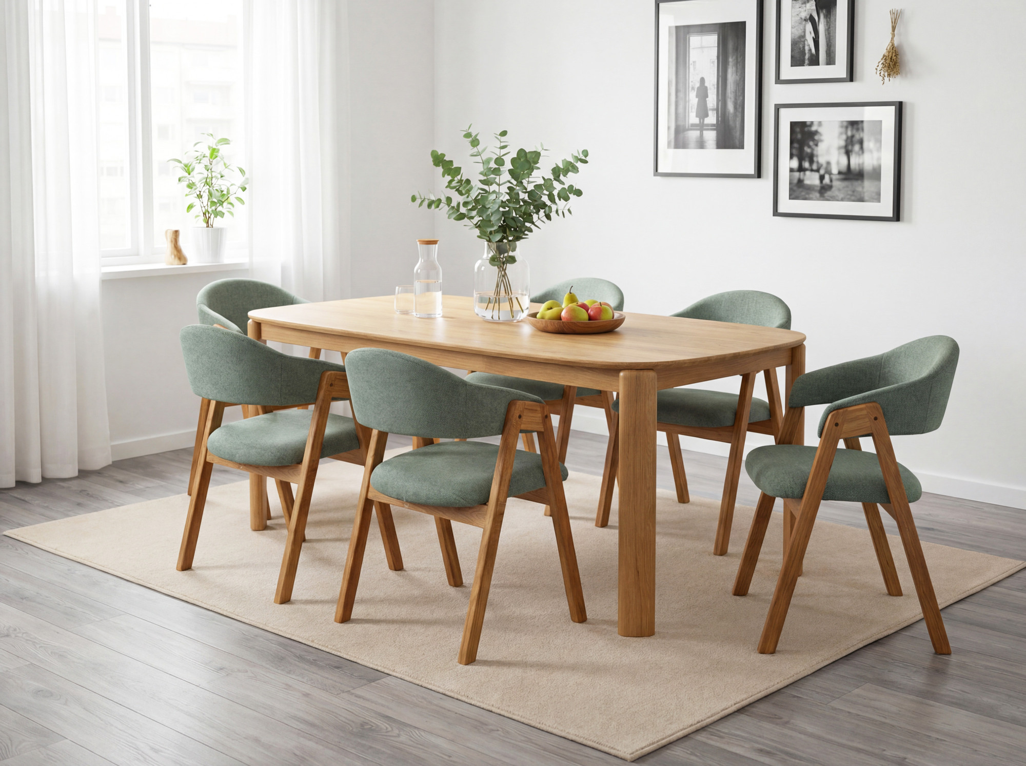 Die Polsterung mit einer Widerstandsfähigkeit von 60 000–70 000 Martindale-Zyklen ist auch für den intensiven täglichen Gebrauch geeignet. Die Eichenkonstruktion des Stuhls ist mit dänischem Öl behandelt, das die Oberfläche schützt und ihr natürliches Aussehen bewahrt. Dieses Esszimmer-Set ist die ideale Wahl für Haushalte, die hochwertige Eichenmöbel direkt vom Hersteller zu einem erschwinglichen Preis suchen.
