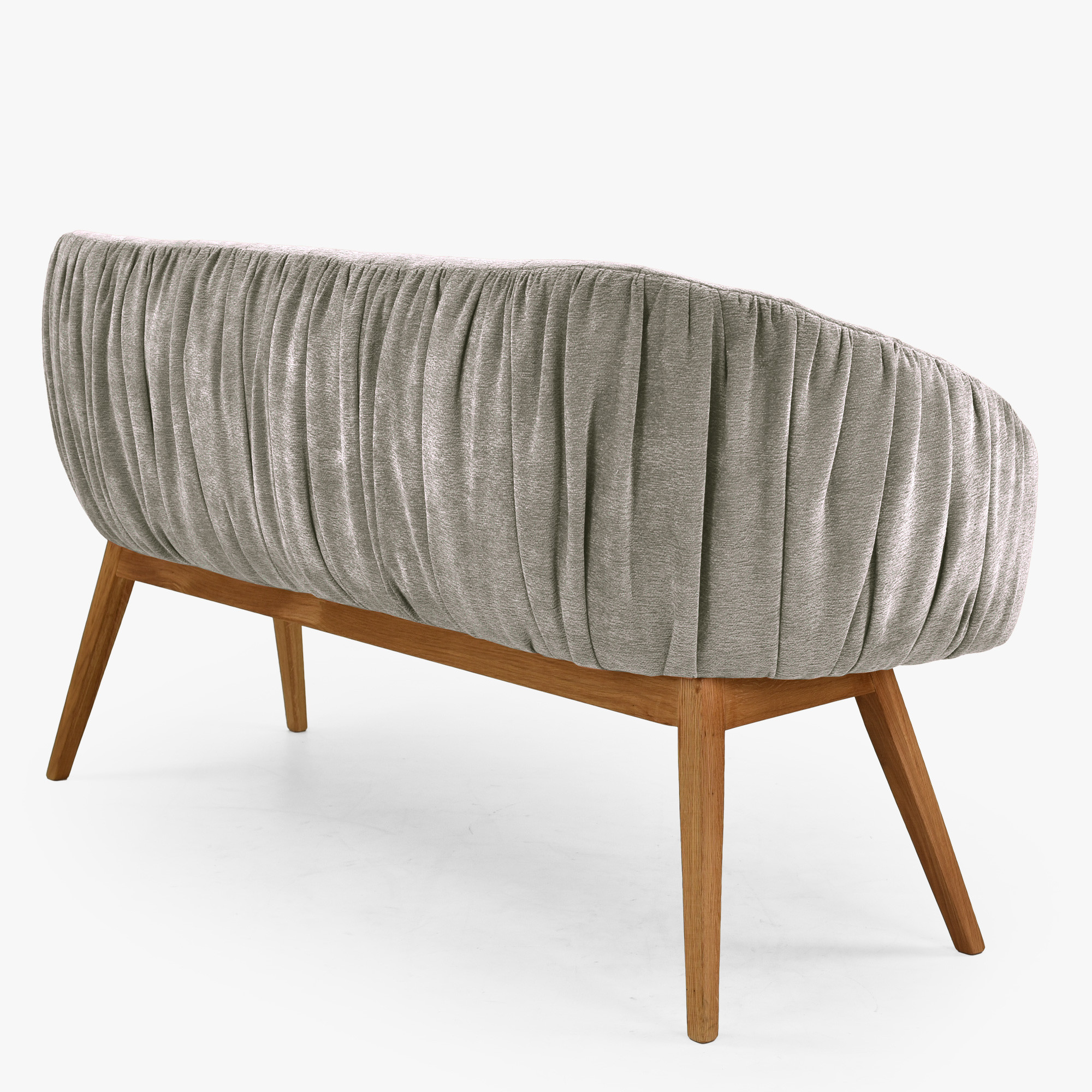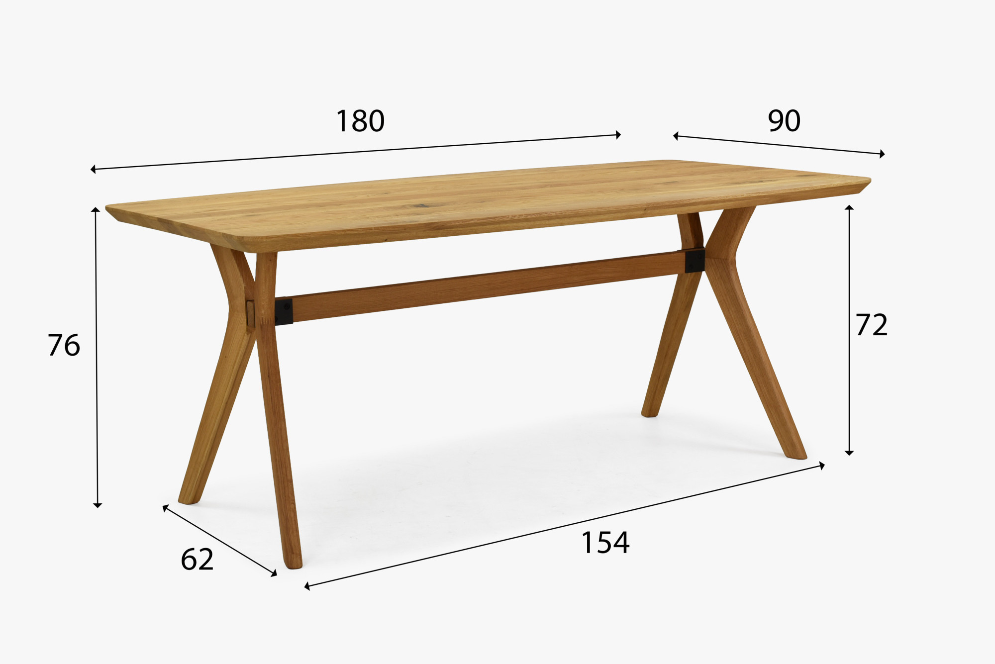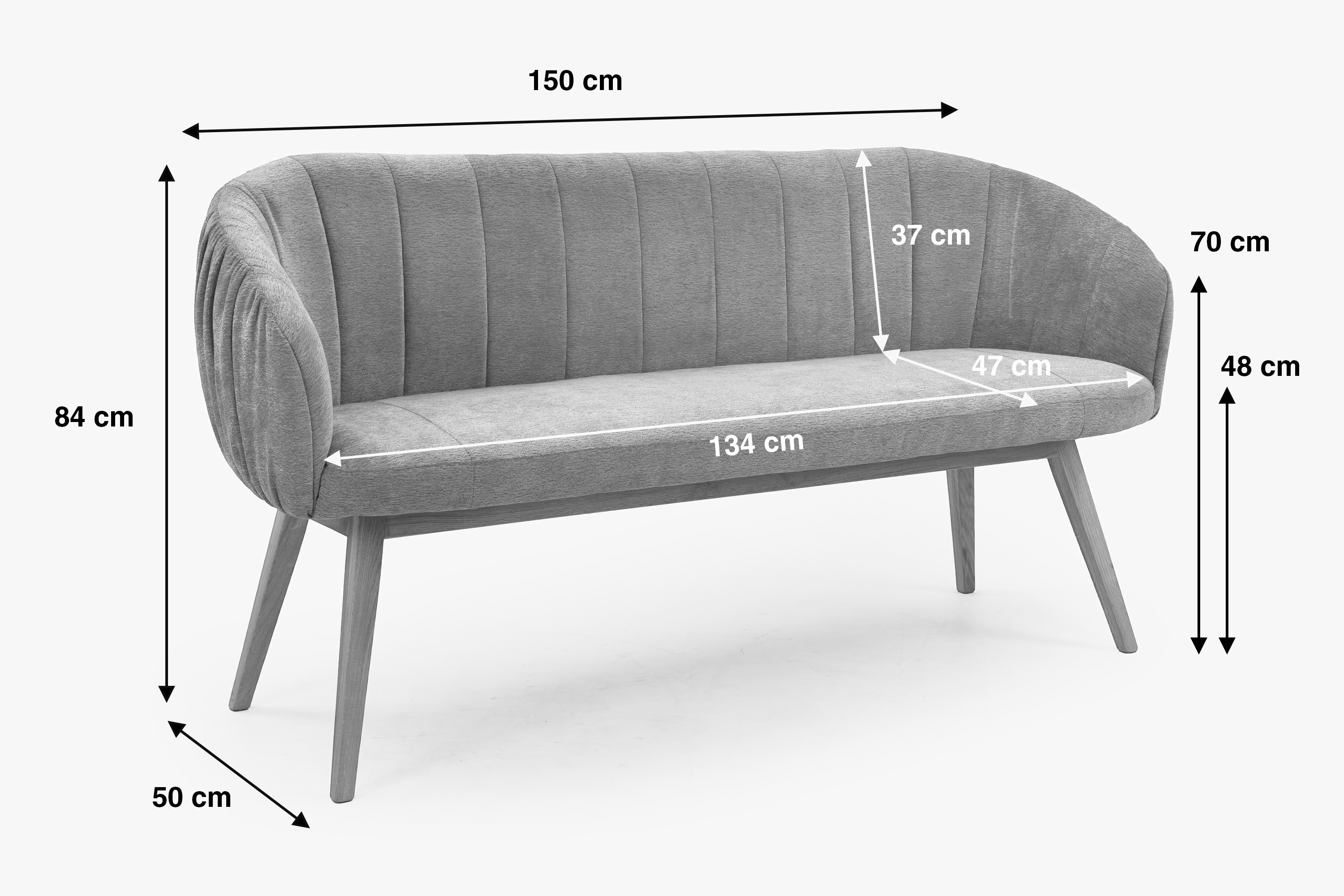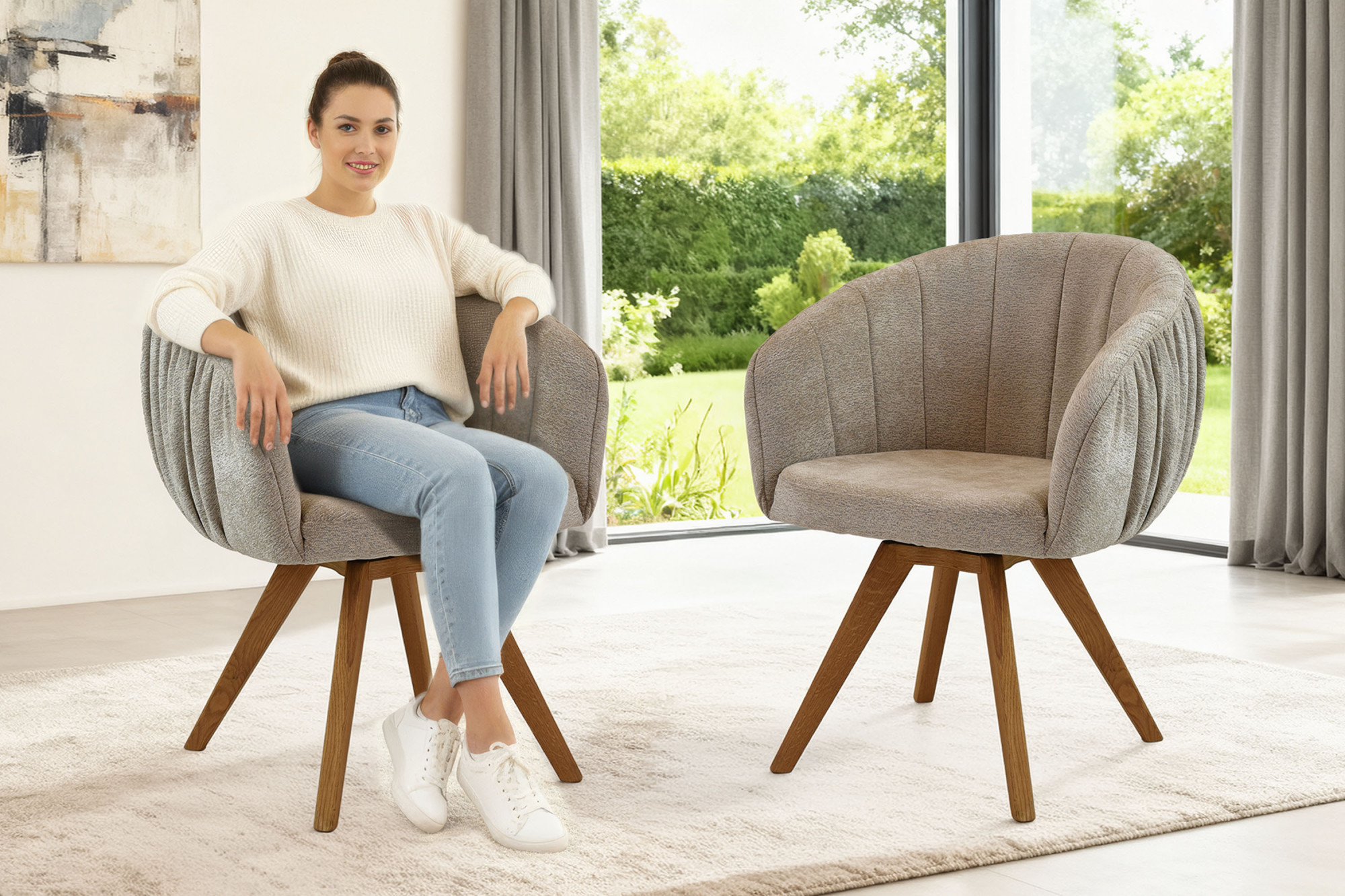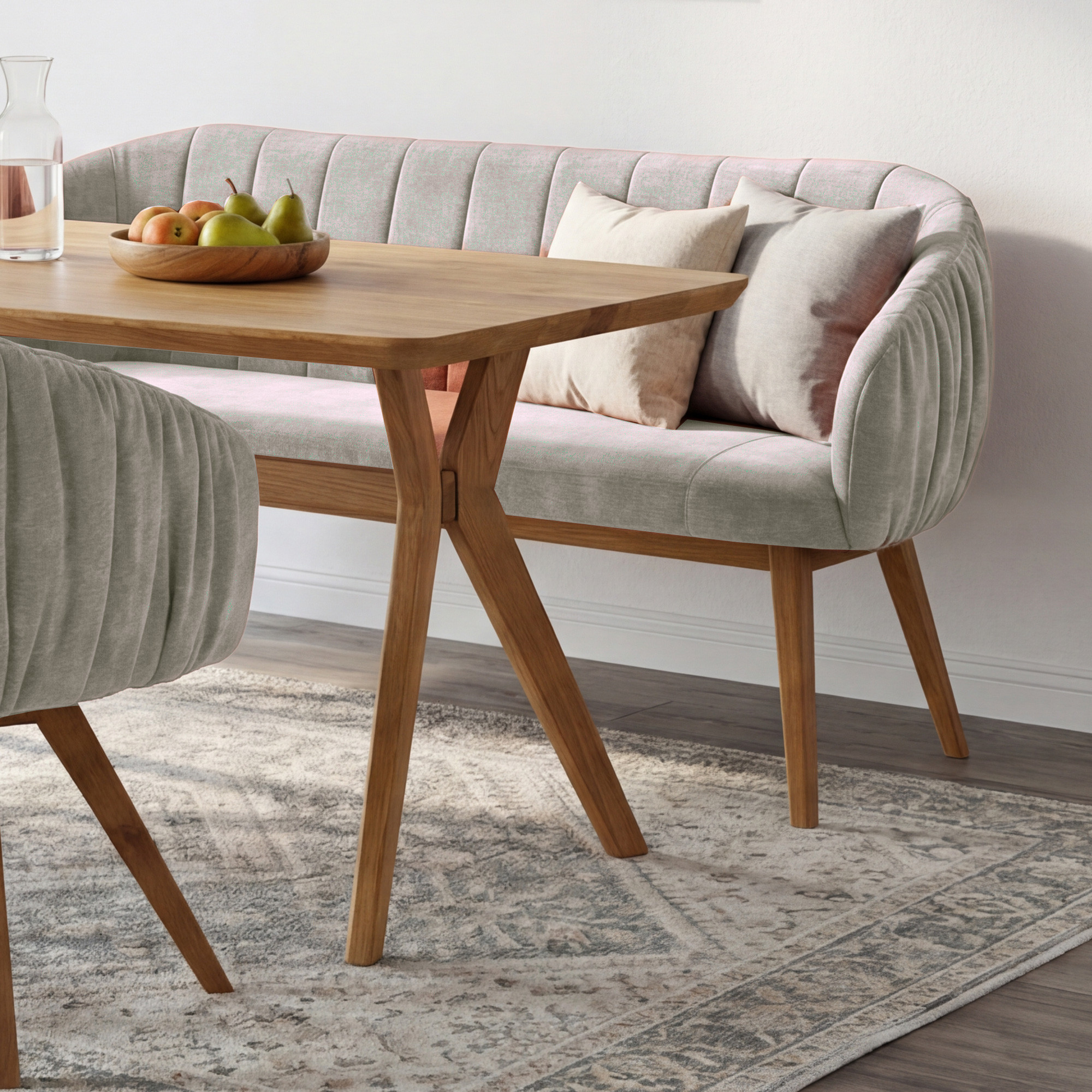 Die Grundlage des Sets ist der ovale Esstisch aus massivem Eichenholz mit den Maßen 180 × 90 cm, der ausreichend Platz für bequemes Essen für bis zu 6–8 Personen bietet. Drehbare Eichenstühle sowie die Bank sind mit Blick auf Ergonomie, Sitzkomfort und Stabilität gestaltet. Massive Eichenholzschenkel gewährleisten hohe Tragfähigkeit und lange Lebensdauer, während die hochwertige Polsterung bei der täglichen Nutzung ein angenehmes Gefühl vermittelt. Die Oberflächenbehandlung mit naturbelassenem Öl betont die Holzmaserung und schützt das Möbelstück über viele Jahre.