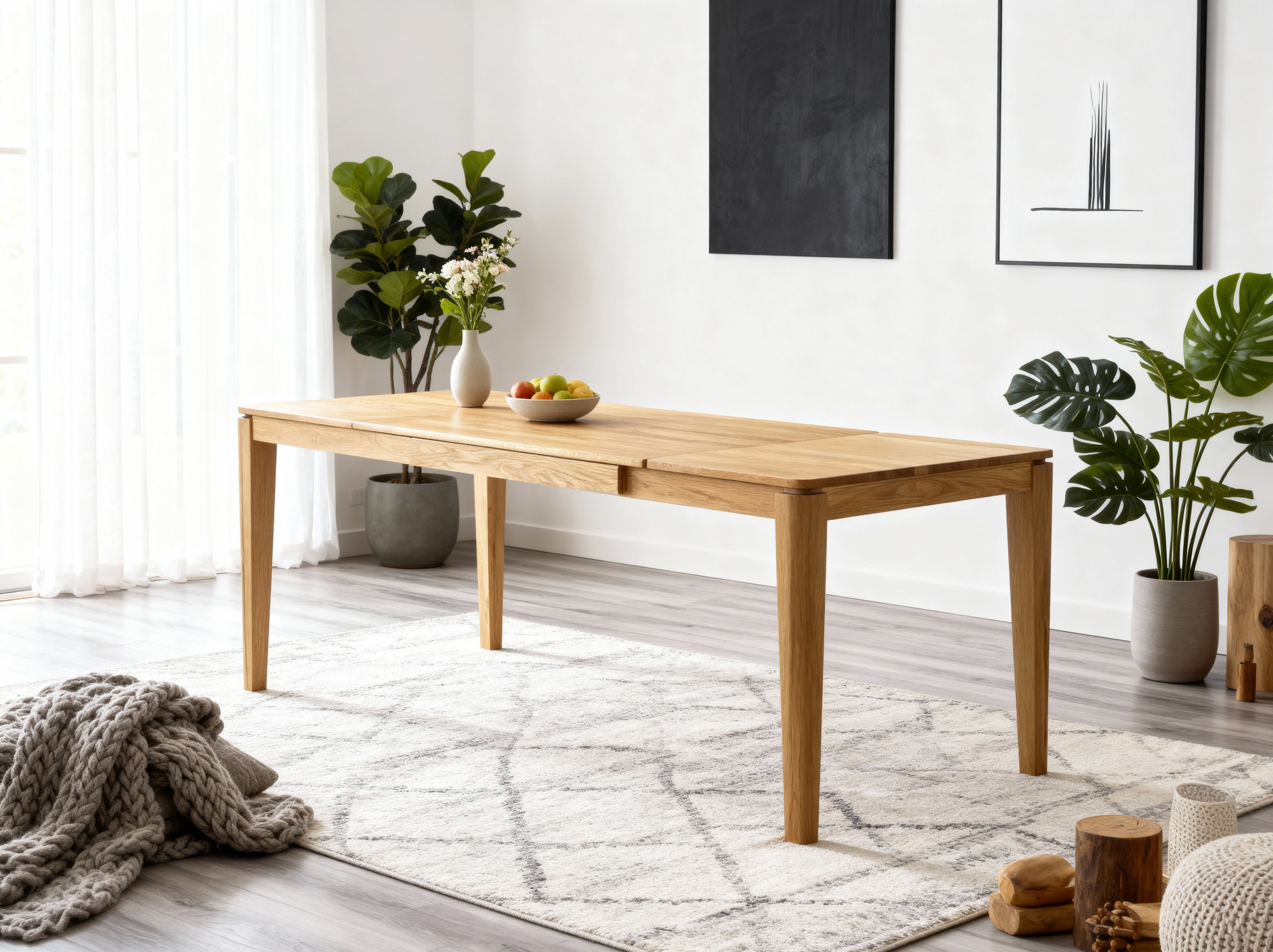 Der Eichen-Esstisch wird zerlegt mit einer übersichtlichen Montageanleitung geliefert – der Aufbau dauert maximal 15 Minuten. So lässt sich der Tisch problemlos auch in engere Räume transportieren. Der ausziehbare Eichenholztisch verbindet traditionelle Handwerkskunst mit modernem Design und passt in jedes Interieur. Die Tischhöhe beträgt 77 cm, der Abstand unter der Tischplatte 67 cm, was ausreichend Platz für bequemes Sitzen bietet. Dieses massive Eichenmöbel lässt sich perfekt mit weiteren Stücken aus unserer Kollektion natürlichen Möbel kombinieren, einschließlich Essstühlen. Die geölte Oberfläche erfordert minimale Pflege – es genügen handelsübliche Wachspflegemittel sowie eine jährliche Ölauffrischung.