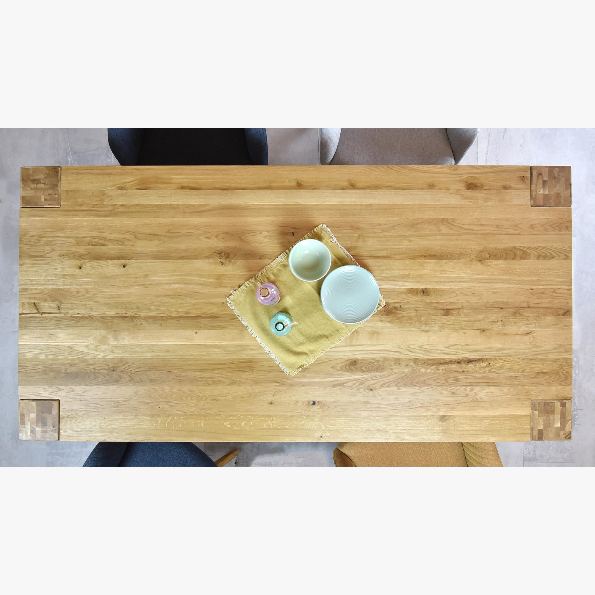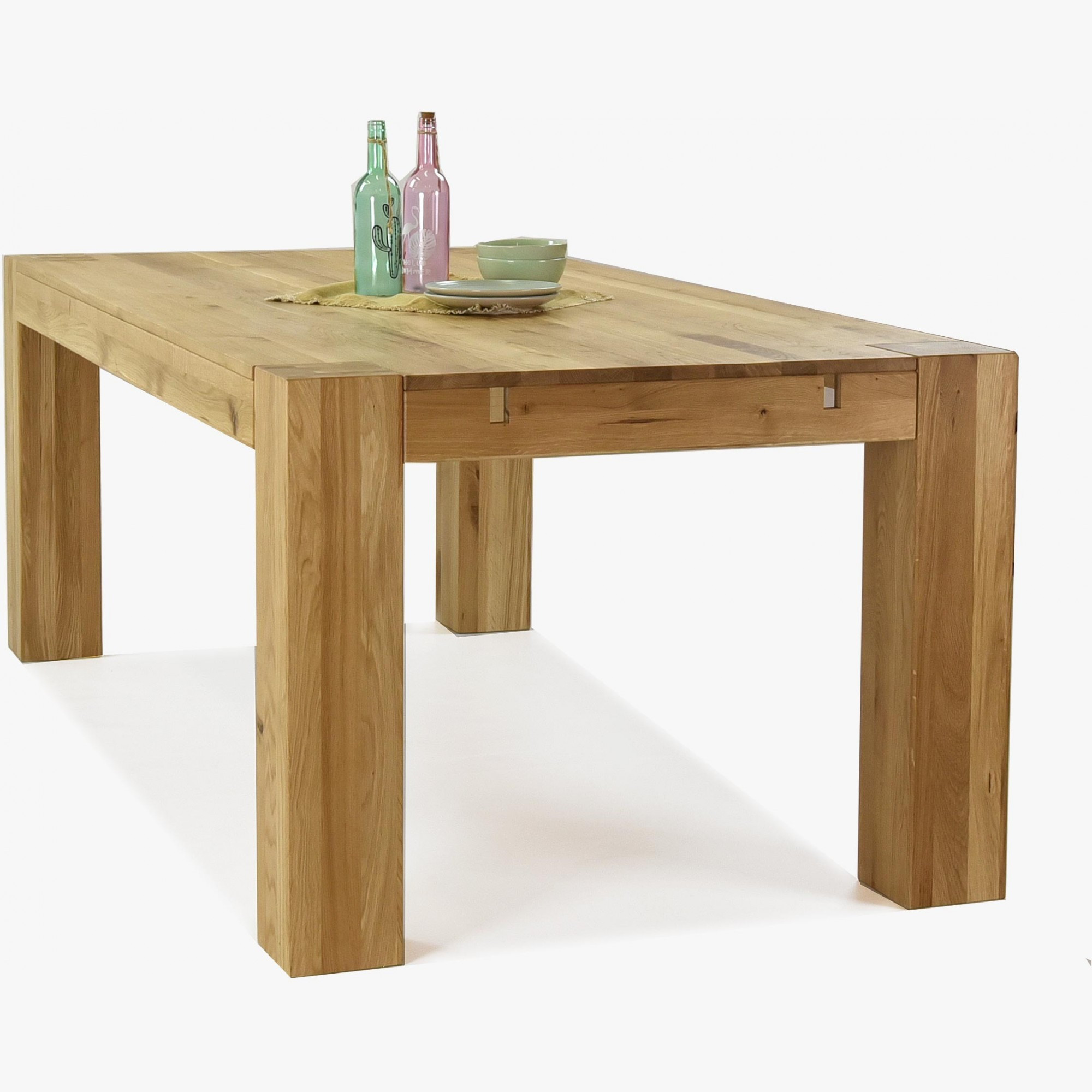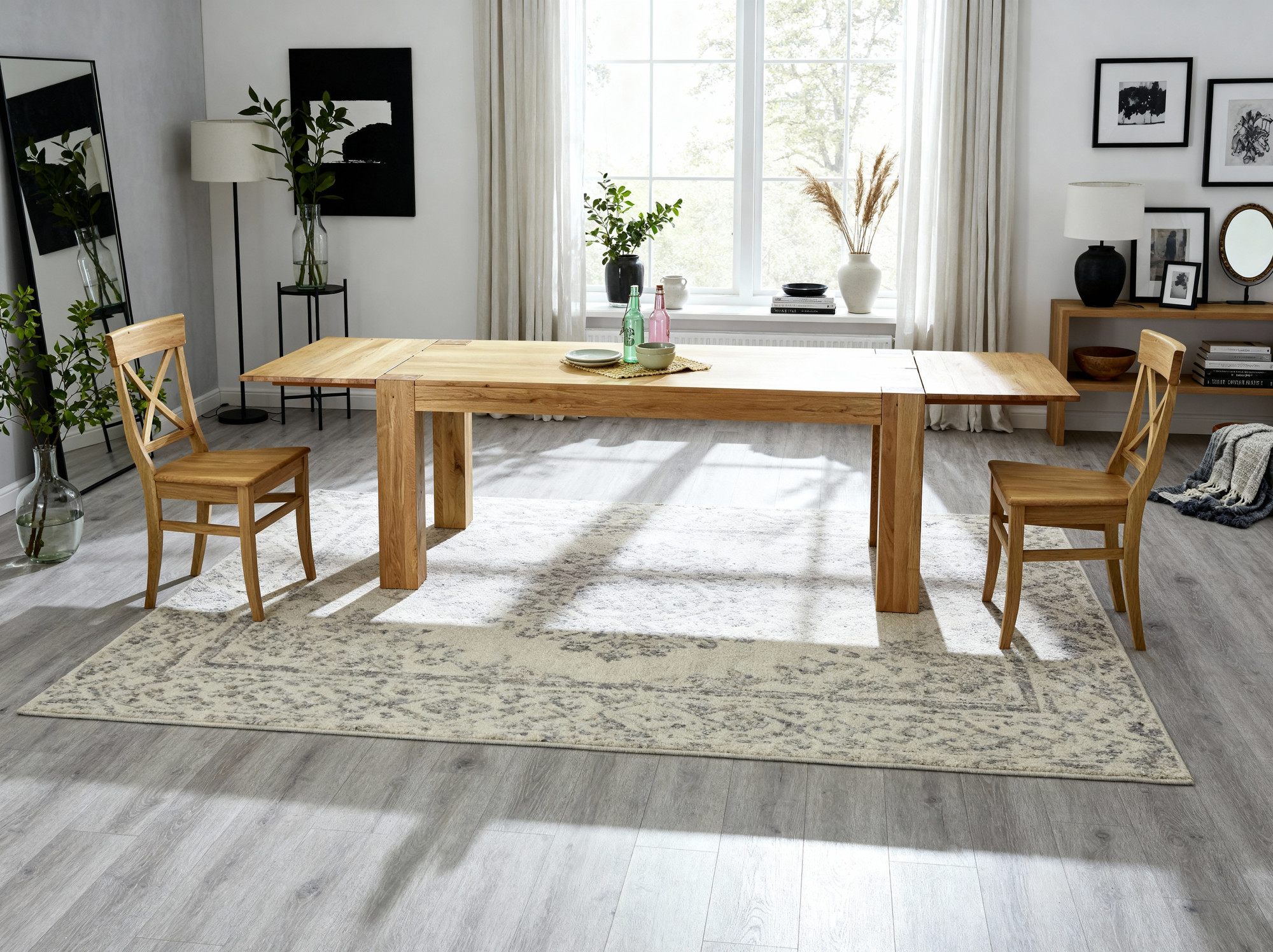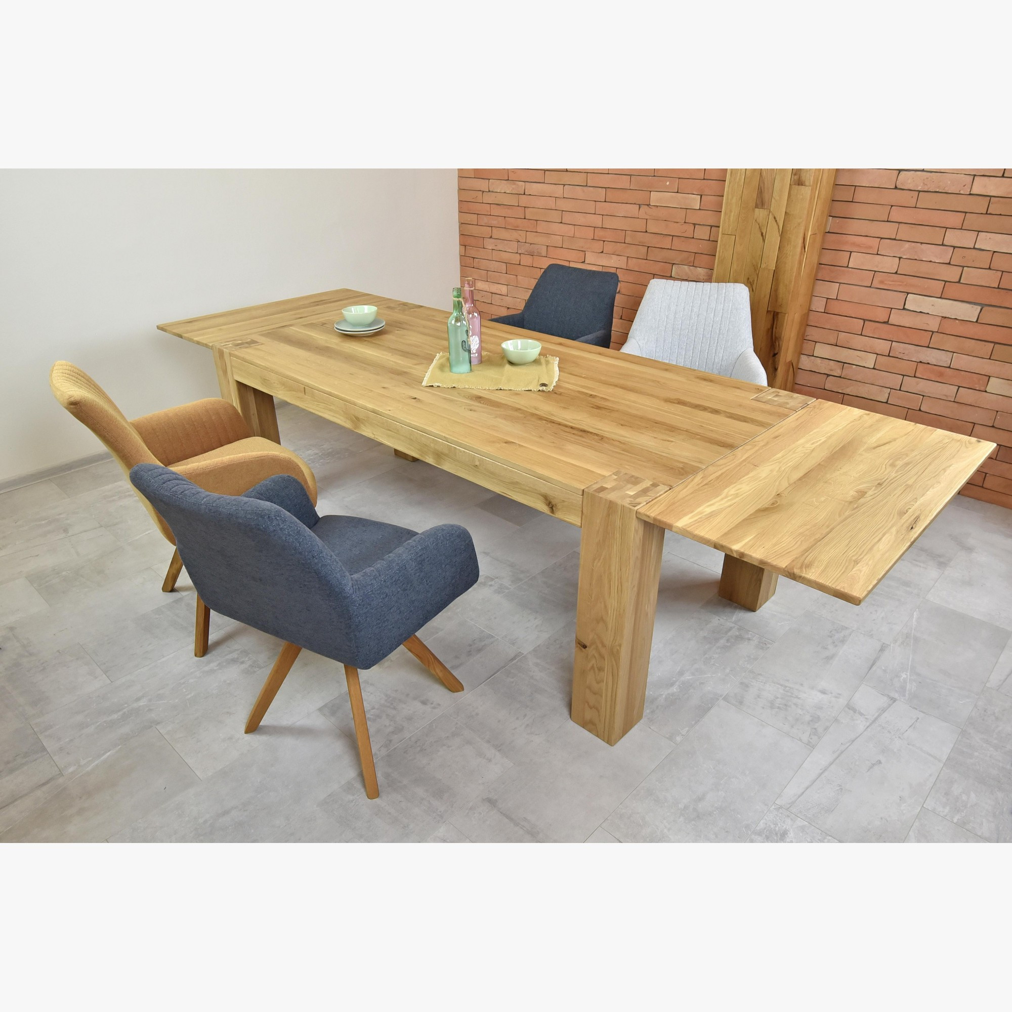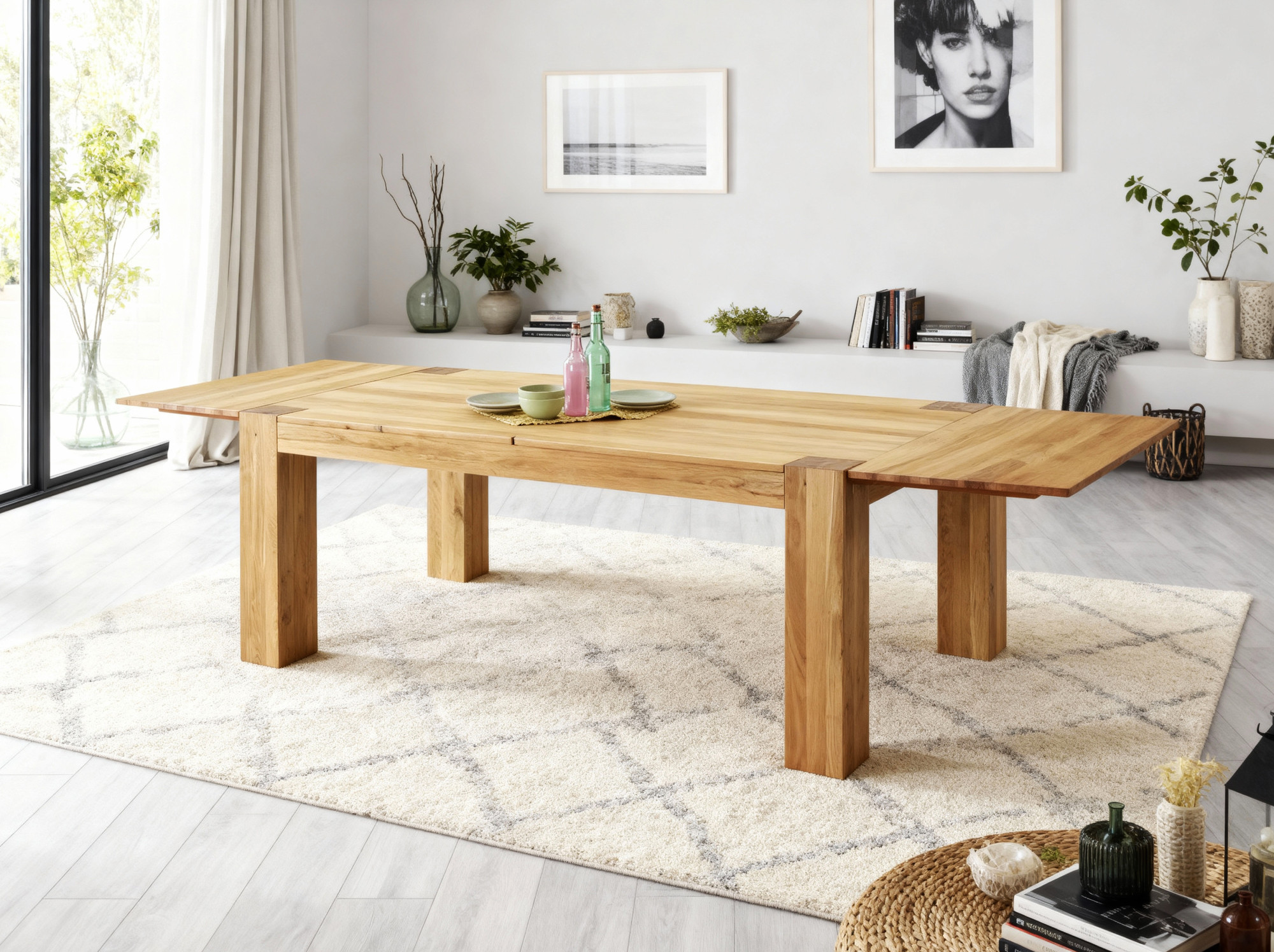 Der massive Eichenholztisch inklusive Verlängerungsplatten George II ist die ideale Wahl für Haushalte, die einen hochwertigen Esstisch aus massivem Eichenholz direkt vom Hersteller suchen. Die Grundplatte mit den Maßen 200 × 100 cm bietet ausreichend Platz für das tägliche Essen, während zwei Verlängerungsplatten mit je 50 cm die Tischlänge auf bis zu 300 cm erweitern. Diesen ausziehbaren Eichenholzesstisch können Sie so problemlos an Familienfeiern und Treffen mit Freunden anpassen. Die robuste Konstruktion, die starke Platte und massive Beine garantieren Stabilität und lange Lebensdauer. Dank eines zeitlosen Designs passt der Tisch sowohl in moderne als auch klassische Einrichtungen, besonders in Kombination mit weiterem massivem Eichenholz-Möbel.