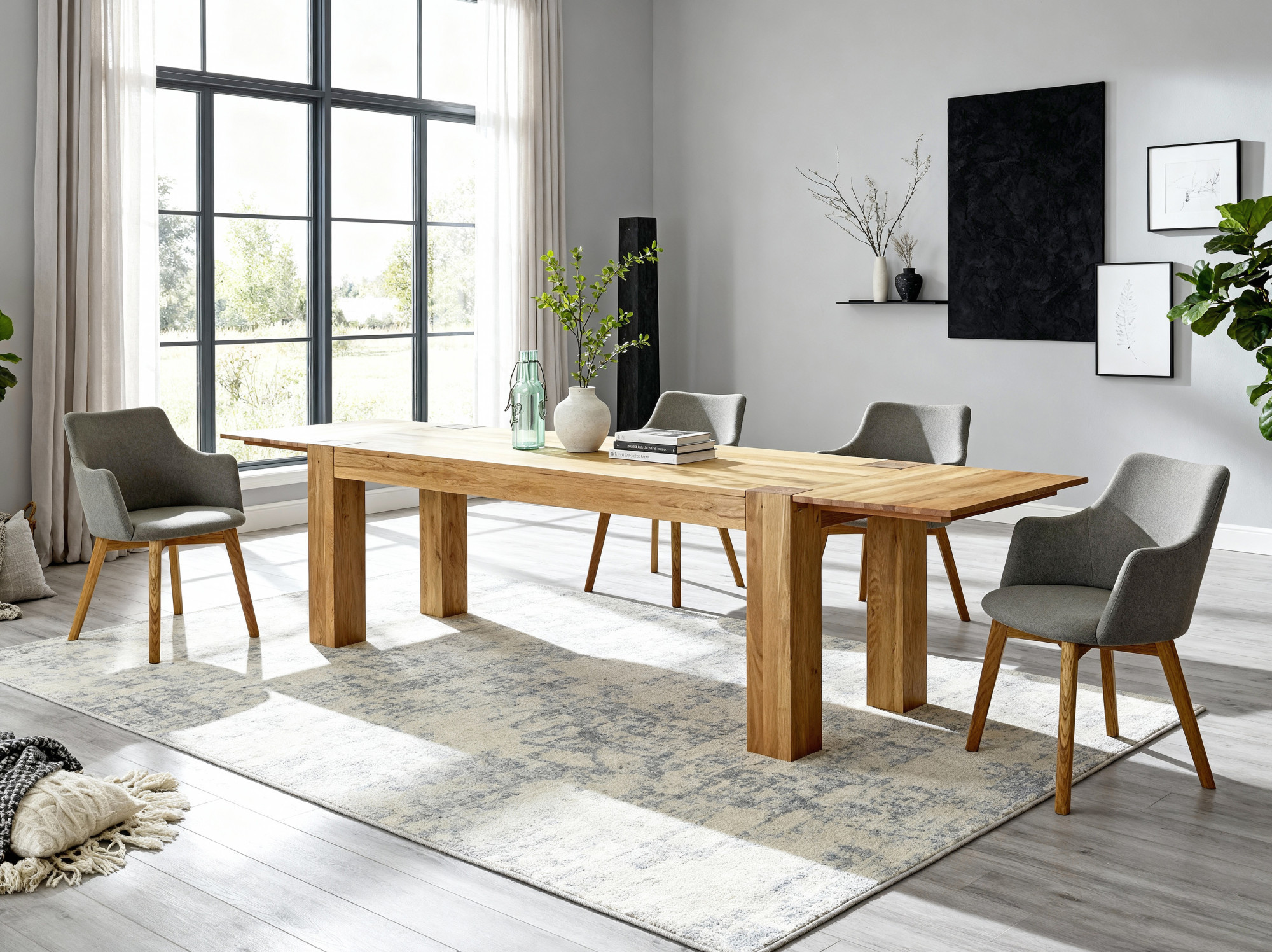 * Auf dem Bild Eichenholztisch 200 x 100 mit zwei Verlängerungsplatten und Bella Sessel in Grau