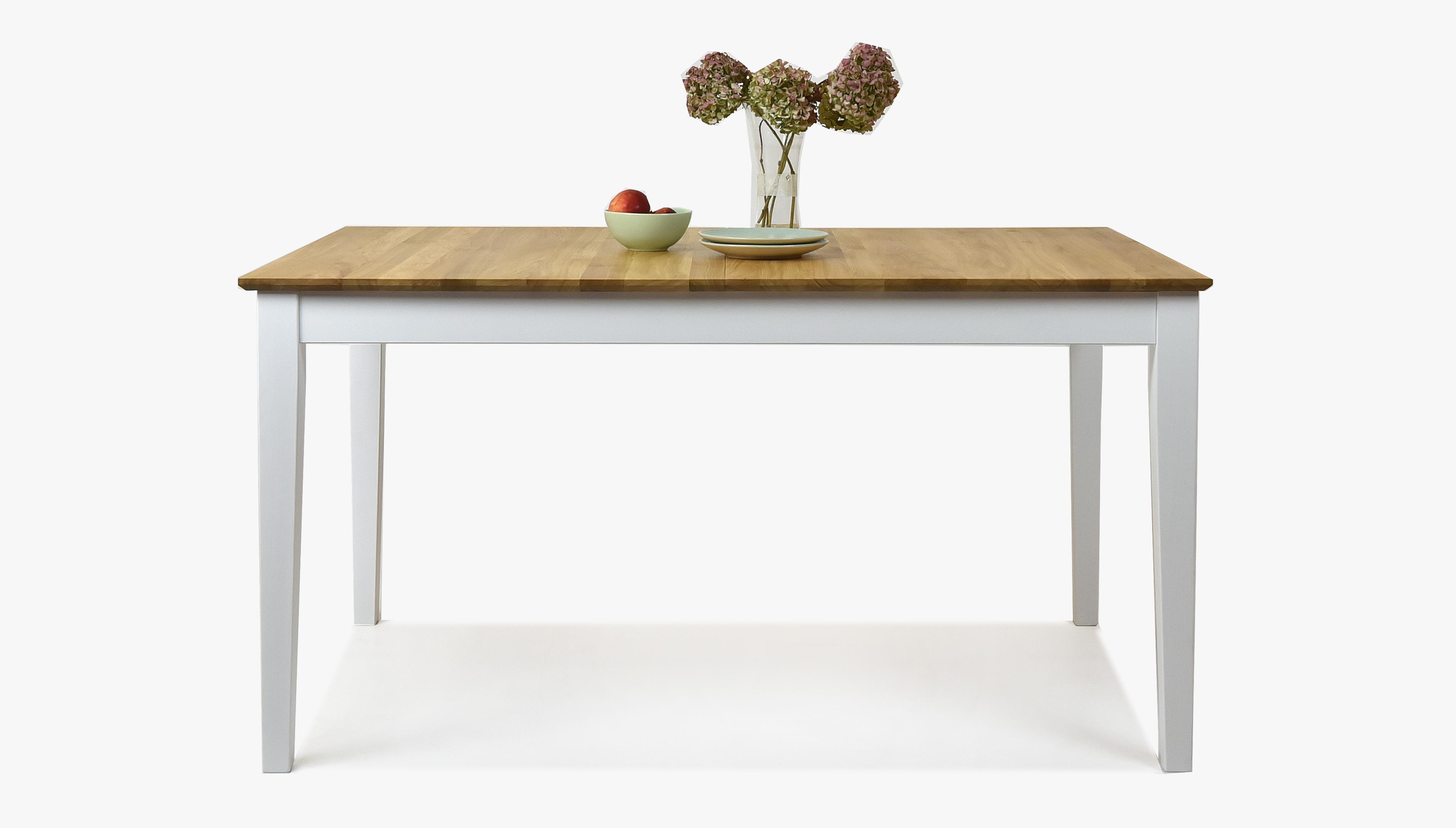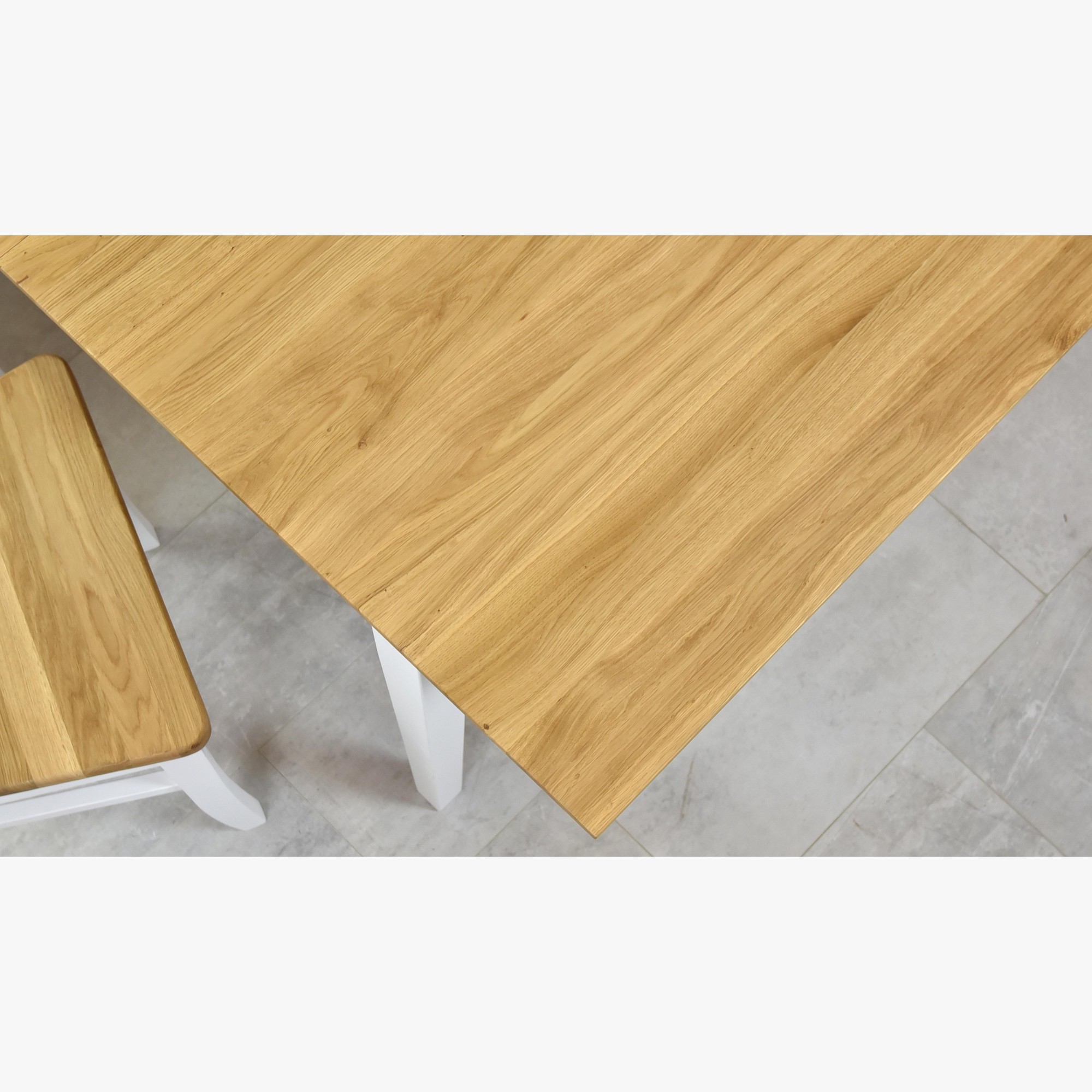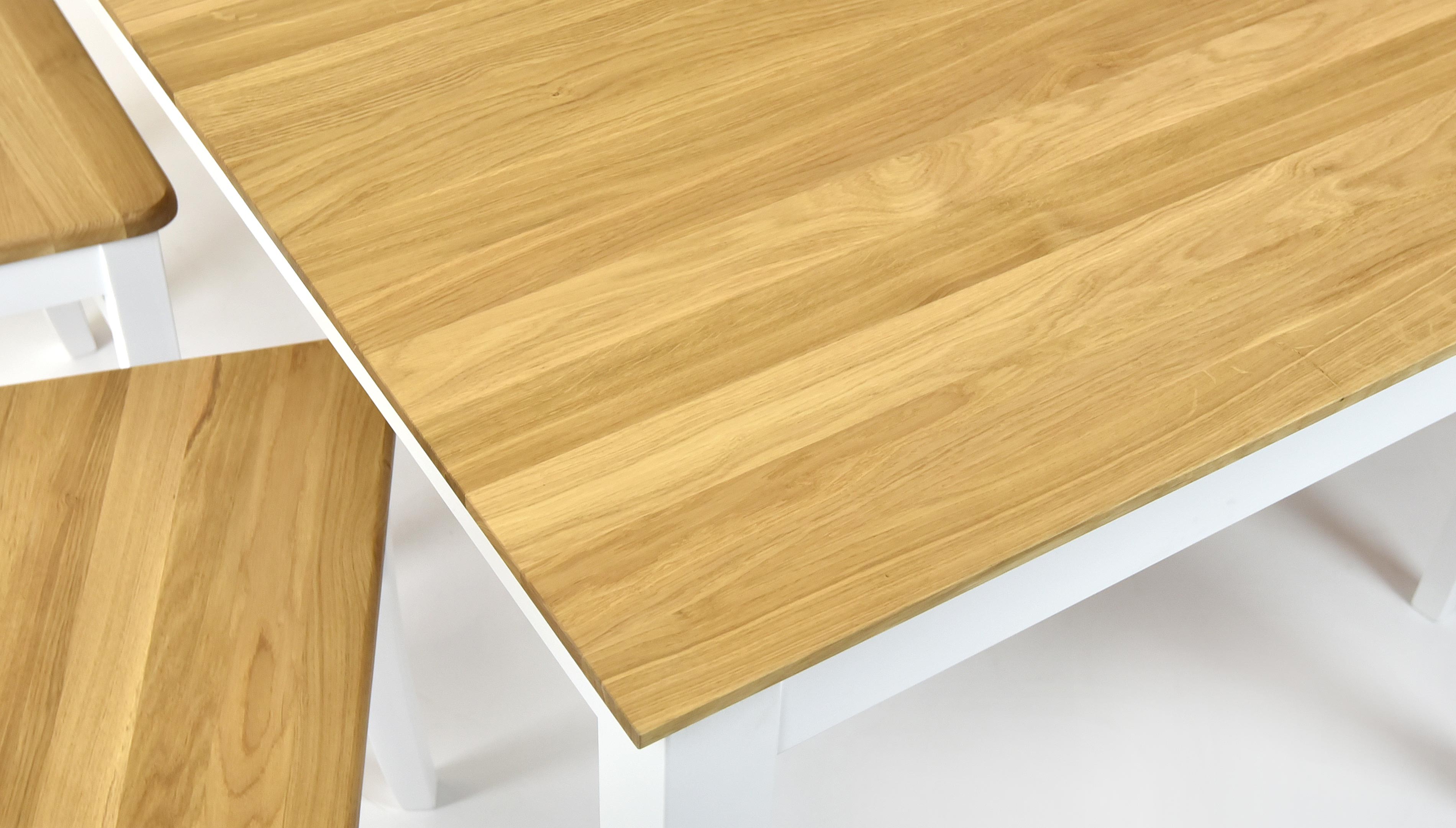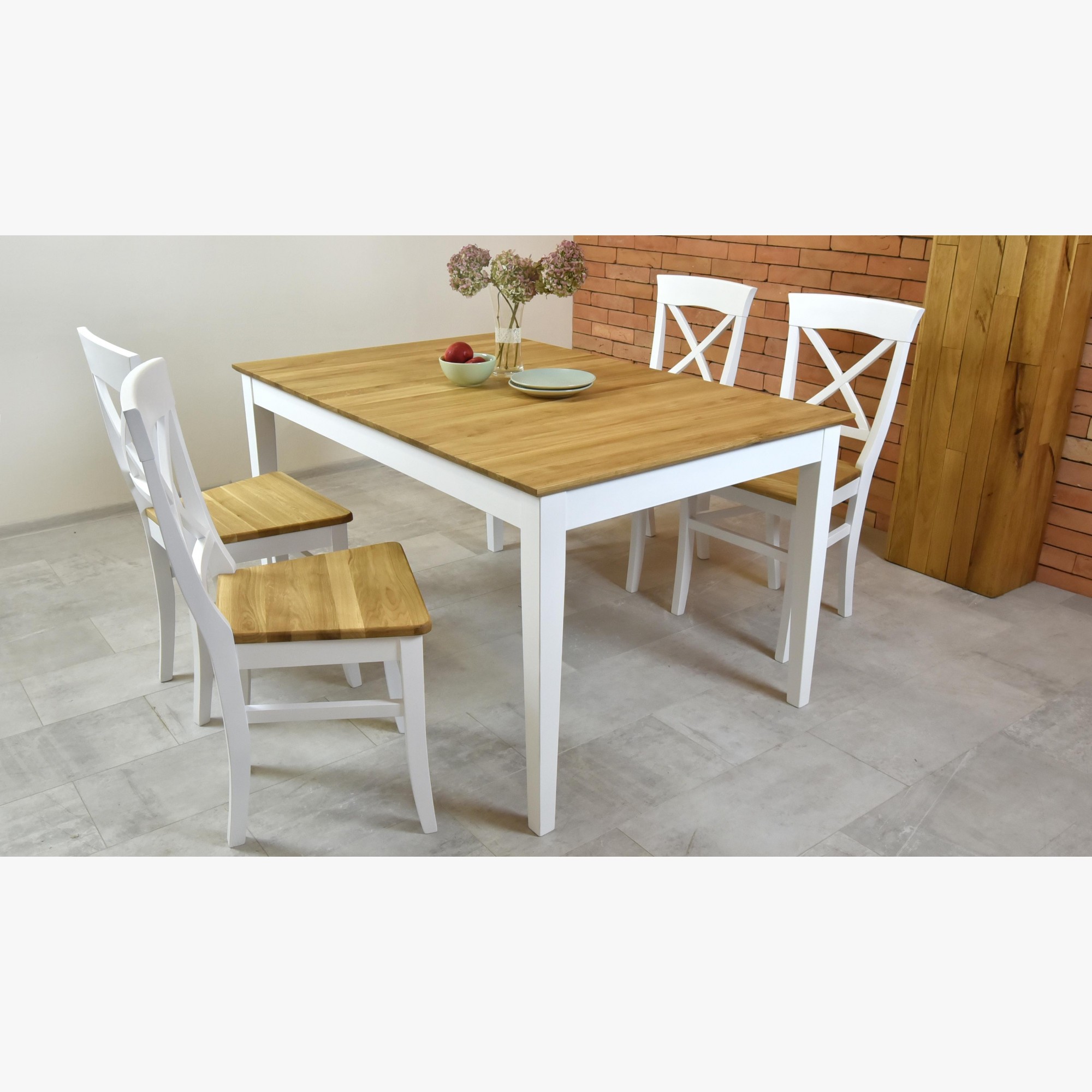 Wenn Sie beim Kauf neuer Möbel originell sein möchten, dann ist der massive Esstisch aus Eiche die ideale Wahl. Zu diesem Eichentisch können Sie bei uns auch passende Stühle auswählen, idealerweise in der gleichen Farbe und aus dem gleichen Material. Wunderschöner Esstisch in der schönen Kombination Weiß + Eiche. Die Tischplatte ist aus ausgewähltem Eichenholz gefertigt, das minimale Astlöcher und Holzfehler aufweist. Die weißen Holzteile bestehen aus gehärtetem Eschenholz. Dank des verwendeten harten Holzes ist der Tisch sehr stabil und robust.