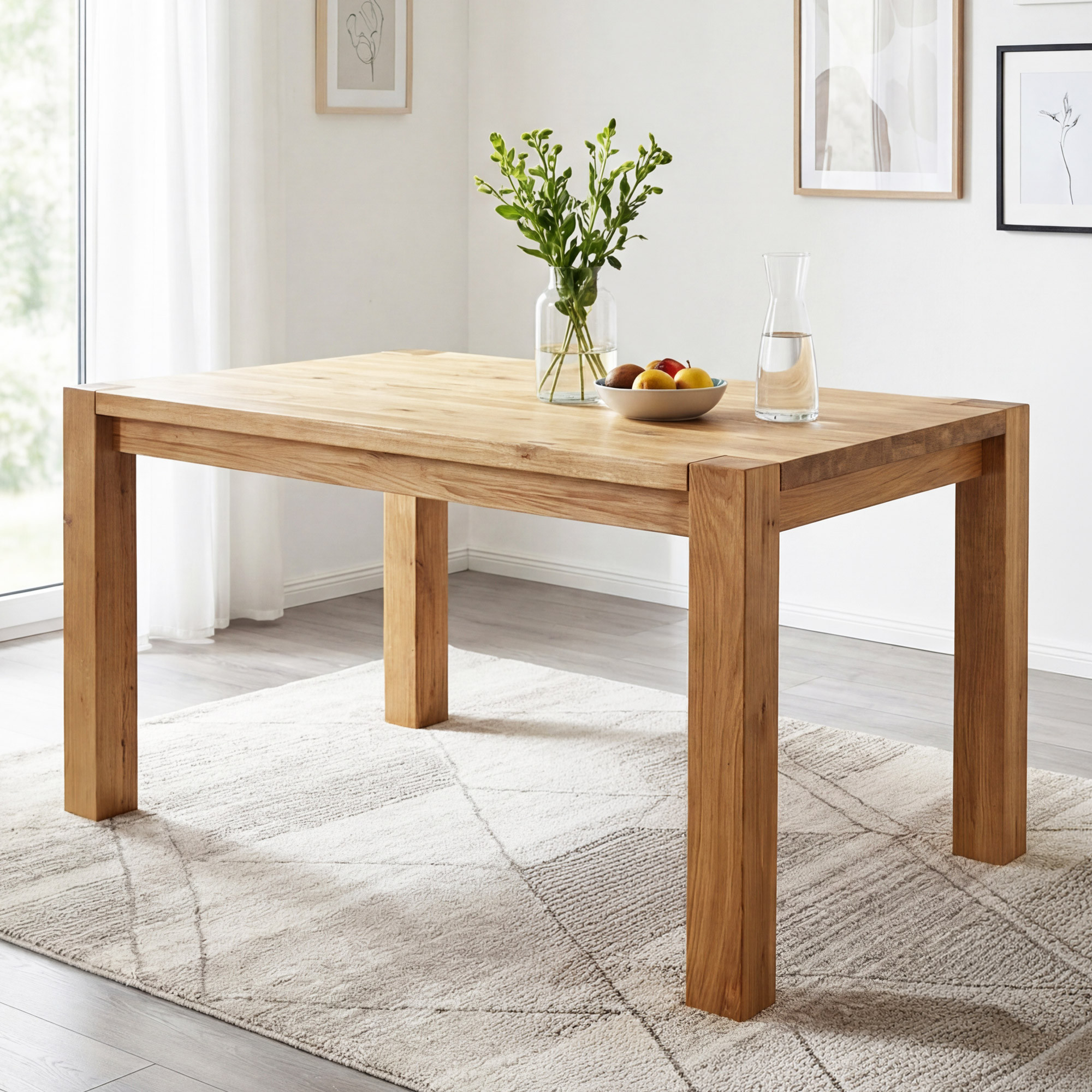 Der Esstisch Košice aus vollmassivem Eichenholz ist die Wahl für alle, die solide Möbel mit langer Lebensdauer suchen. Der Tisch in der Größe 140 x 90 cm bietet bequem Platz für 4–6 Personen und ist auch in den Varianten 120 x 80 cm und 180 x 90 cm erhältlich. Für die Herstellung wurde ausschließlich wilde Eiche verwendet – das Holz wurde weder gebleicht noch gebeizt, wodurch es seine natürliche Maserung inklusive Astlöchern behält, die bewusst für ein authentisch natürliches Aussehen erhalten bleiben. Die Oberfläche der Platte ist mit natürlichem Öl und Wachs einer renommierten Marke behandelt, was die Holzstruktur betont und einen wirksamen Schutz gegen kleine Kratzer und Abnutzungen bietet.