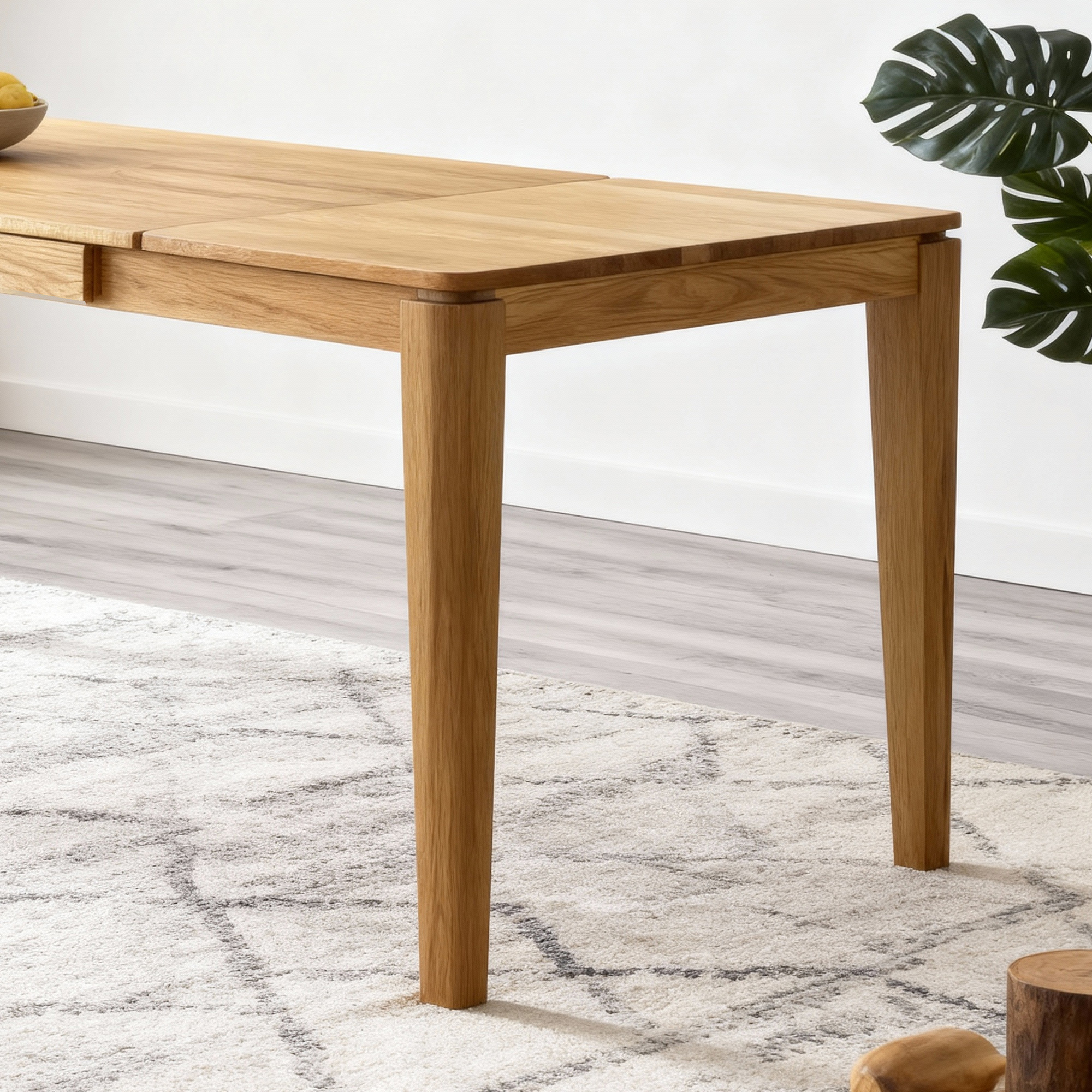 Den Eichen-Esstisch liefern wir zerlegt mit einer übersichtlichen Montageanleitung – der Aufbau dauert maximal 15 Minuten. So passt der Tisch problemlos auch in engere Räume. Der ausziehbare Eichenholztisch verbindet traditionelle Handwerkskunst mit modernem Design und passt in jedes Interieur. Die Tischhöhe beträgt 77 cm, der Abstand unter der unteren Kante 67 cm, was genügend Platz für bequemes Sitzen bietet. Dieses massive Eichenmöbel lässt sich perfekt mit weiteren Stücken aus unserer Kollektion für natürliche Möbel kombinieren, darunter Essstühle. Die geölte Oberfläche benötigt minimale Pflege – übliche Wachspflegemittel genügen, und einmal jährlich eine neue Ölschicht.