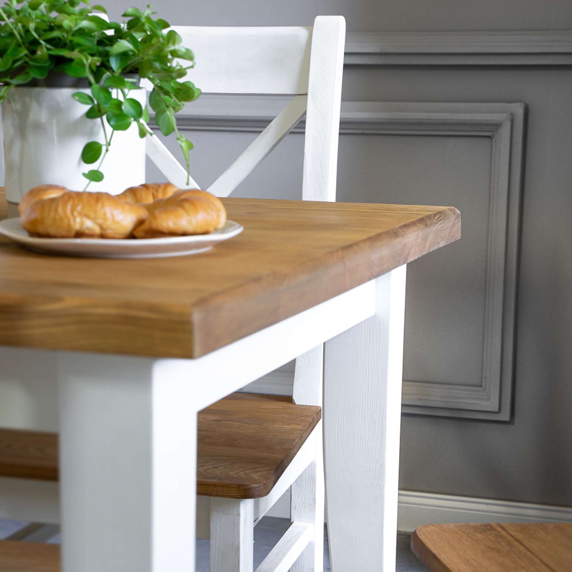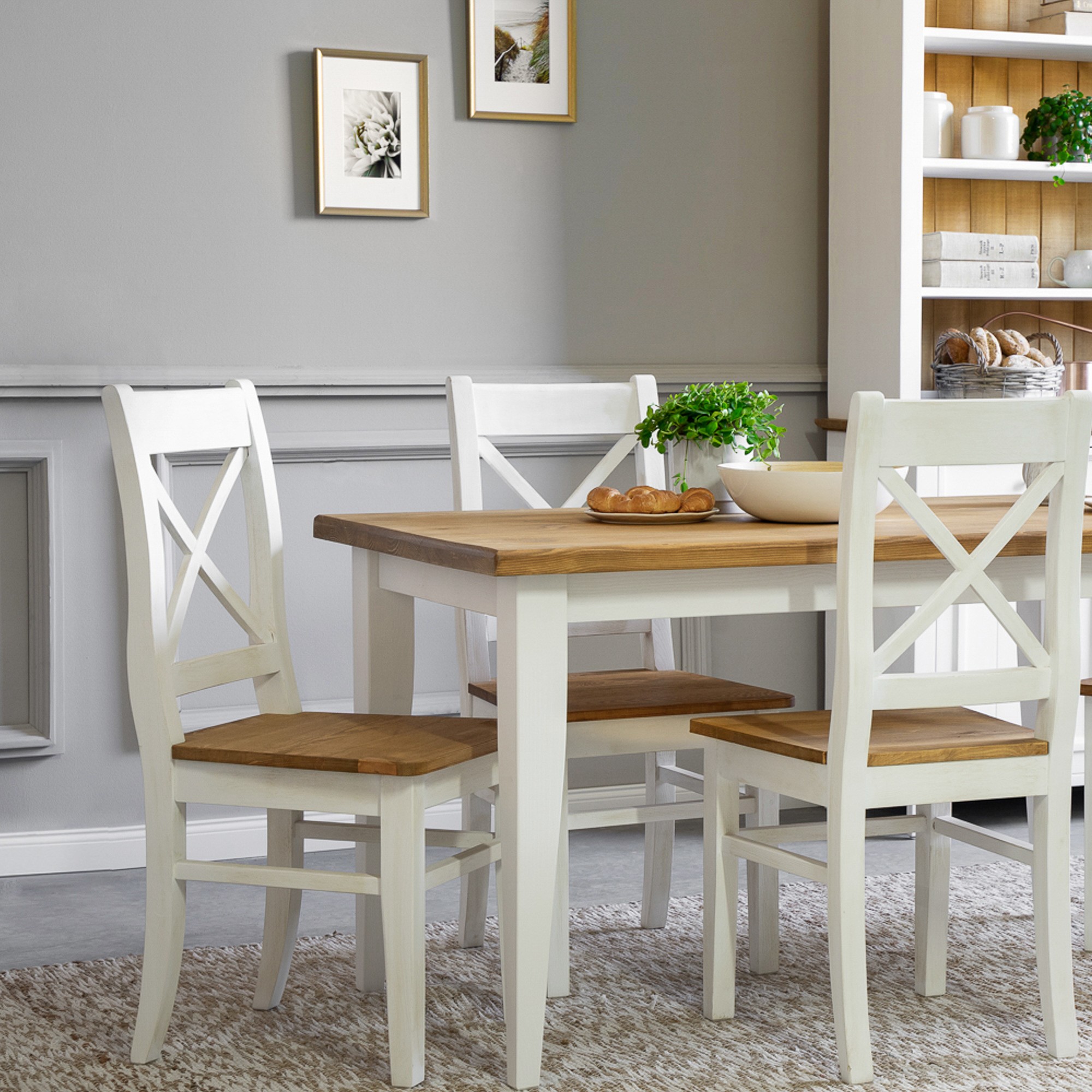 Esstisch für das Esszimmer aus der neuesten Möbelkollektion LILLE, gefertigt im französischen Landhausstil. Natürlicher Holztisch aus Kiefernholz in einer weiß-braunen Farbkombination. Der Tisch hat eine Tischplatte mit einer Stärke von bis zu 4 cm. Die Tischplatte ist in Braun gehalten und mit natürlichem Wachs behandelt. Ergänzen Sie Ihr Esszimmer mit weiteren Stücken aus dieser Kollektion und genießen Sie täglich die Atmosphäre des französischen Landhausstils. Der Esstisch wird zerlegt mit einfacher Montage geliefert. Erweitern Sie Ihr Interieur mit diesem attraktiven Stück und erleben Sie täglich die Kraft natürlicher Möbel. Die Ökologie eines natürlichen Produkts und die Harmonie eines wunderschönen Designs sind Eigenschaften, die wir bei der Herstellung des Tisches LILLE vereint haben.