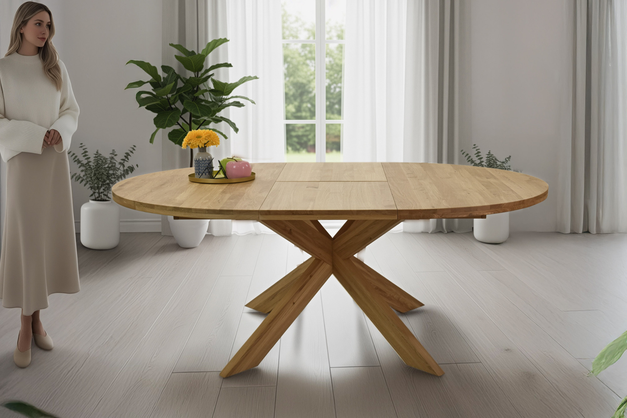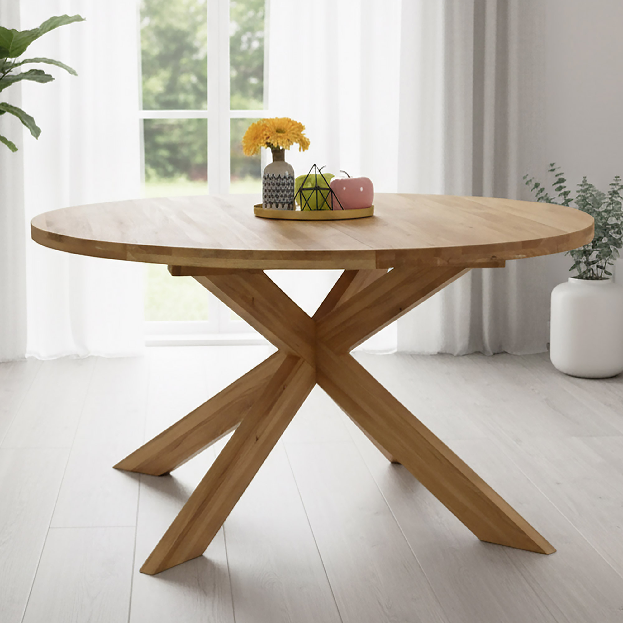 Solider Esstisch hergestellt aus echtem Eichenholz. Gönnen Sie sich in Ihrem Zuhause ein ordentliches Stück Naturmöbel. Der Esstisch ist rund mit Ausziehfunktion, was Sie bei Besuchen oder unerwarteten Gästen zu schätzen wissen. Der Durchmesser des Tisches beträgt +- 140 cm, der ausziehbare Teil ist 50 cm breit, nach dem Ausziehen erhalten Sie somit eine Tischfläche von bis zu 190 cm. Der Esstisch ist stabil und robust. Dominierend sind die Tischbeine in einer einzigartigen gekreuzten Form.