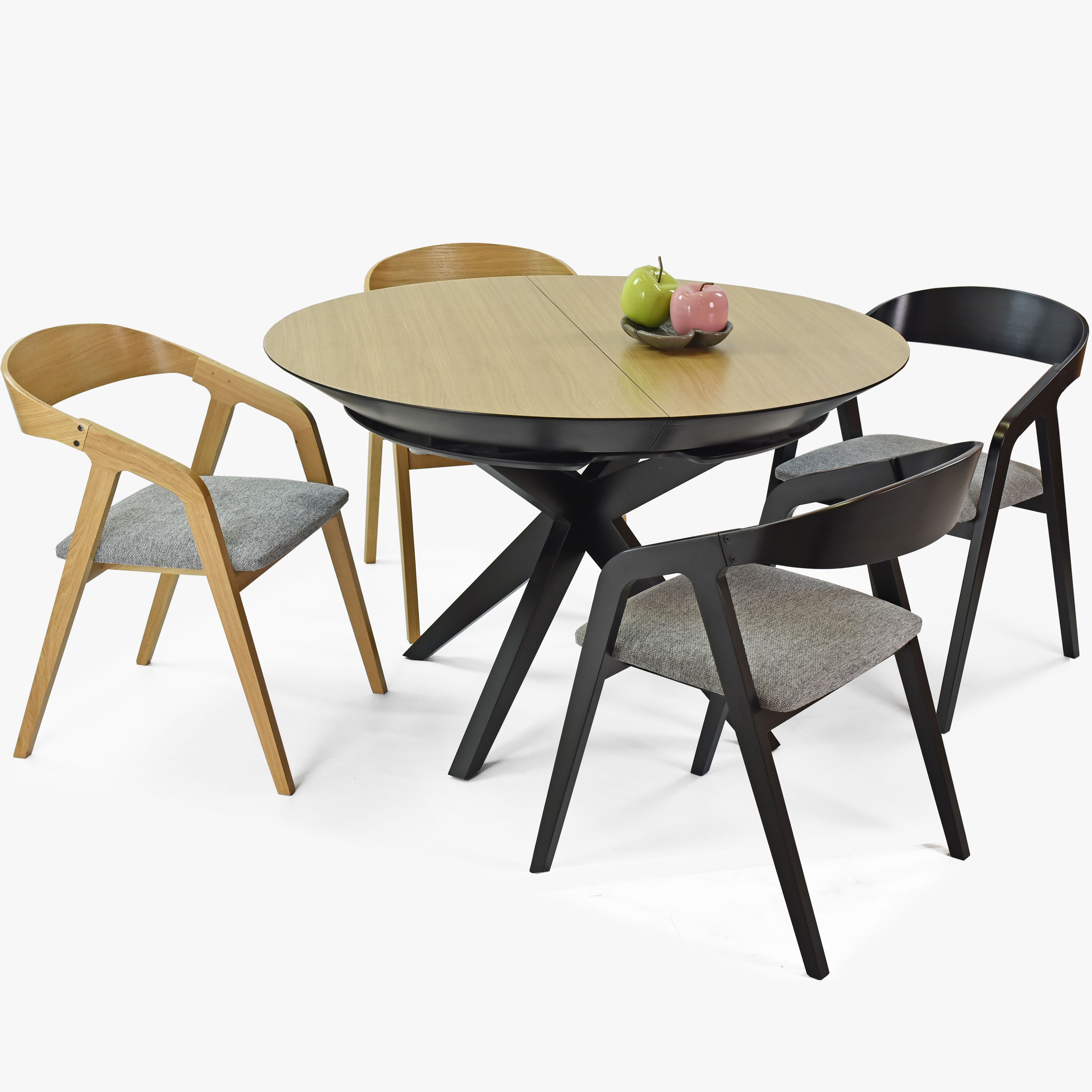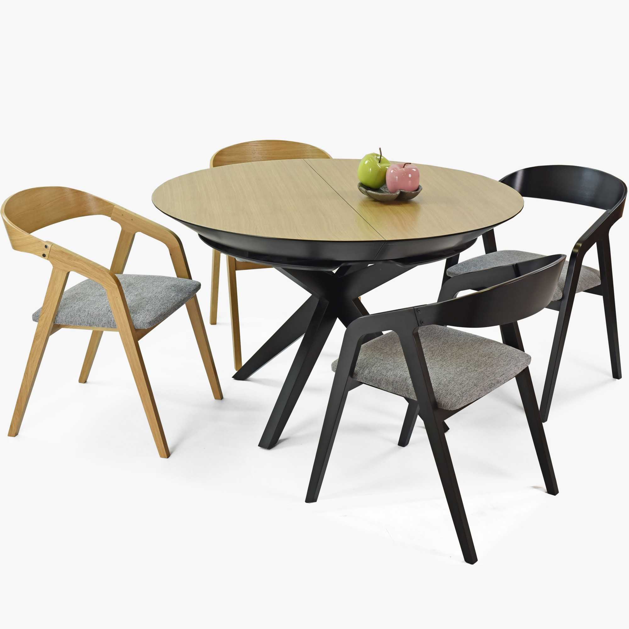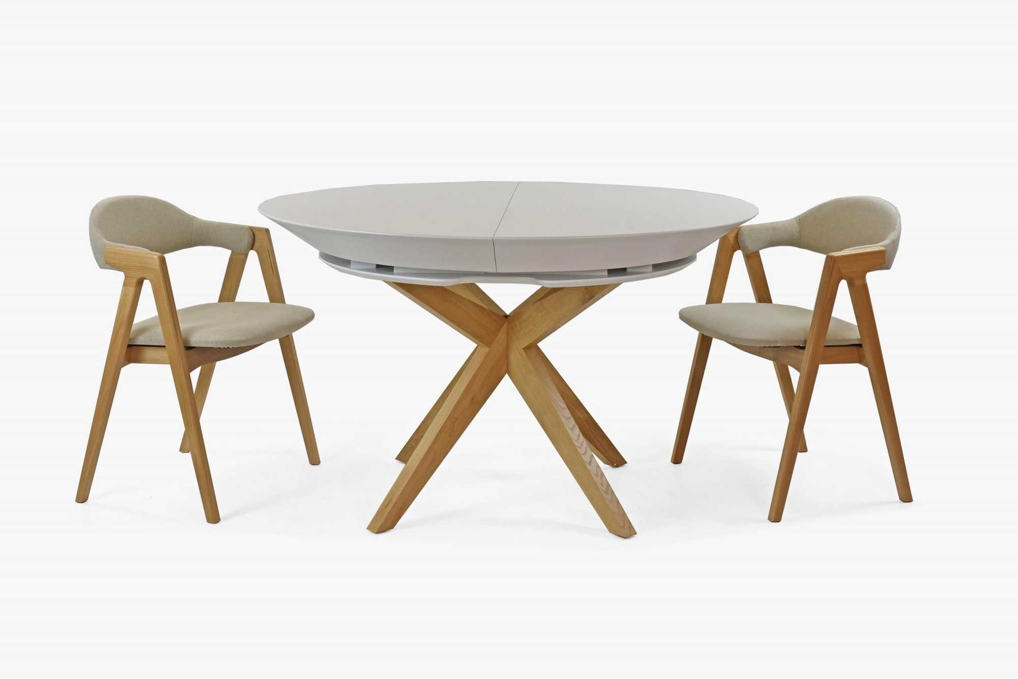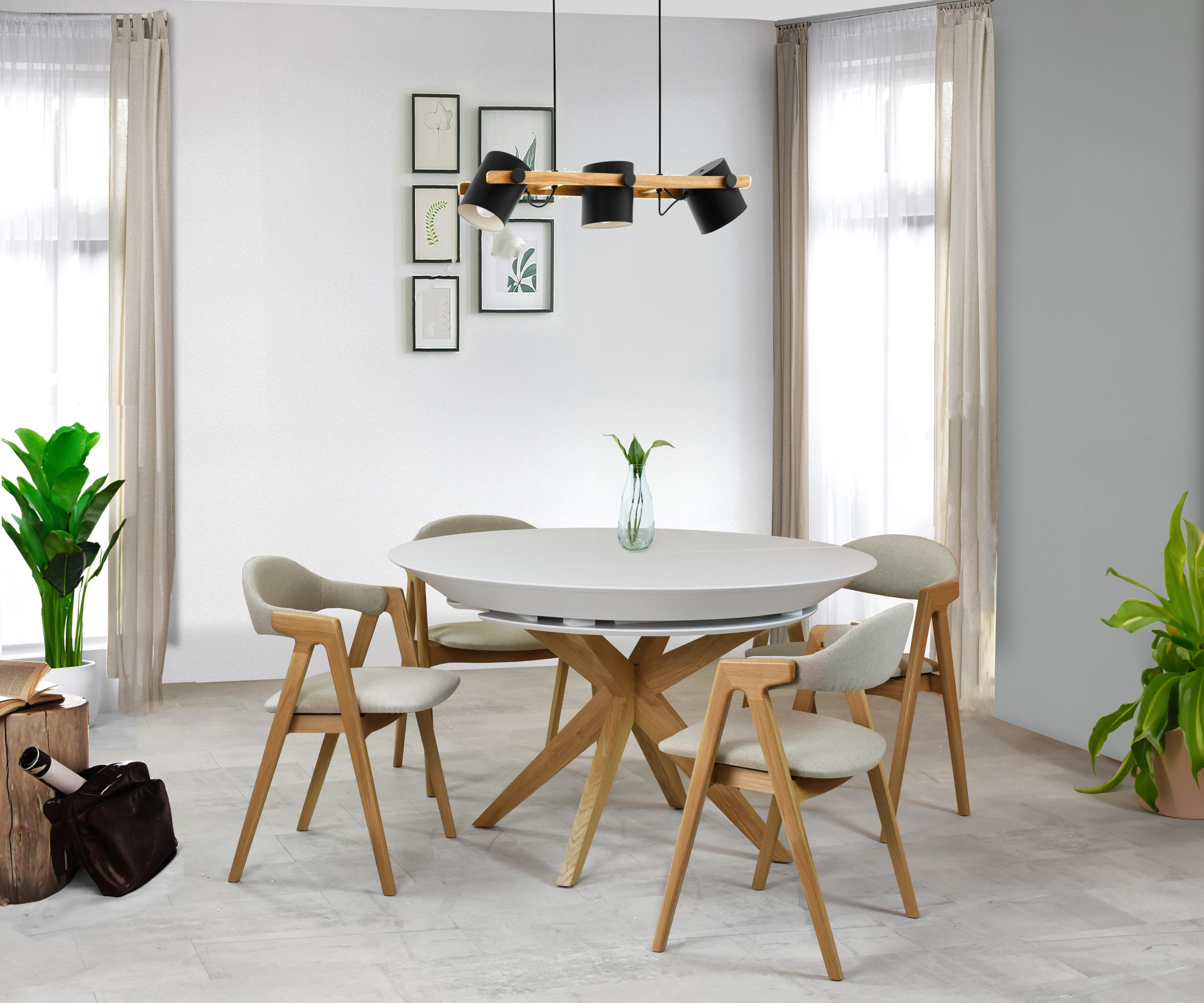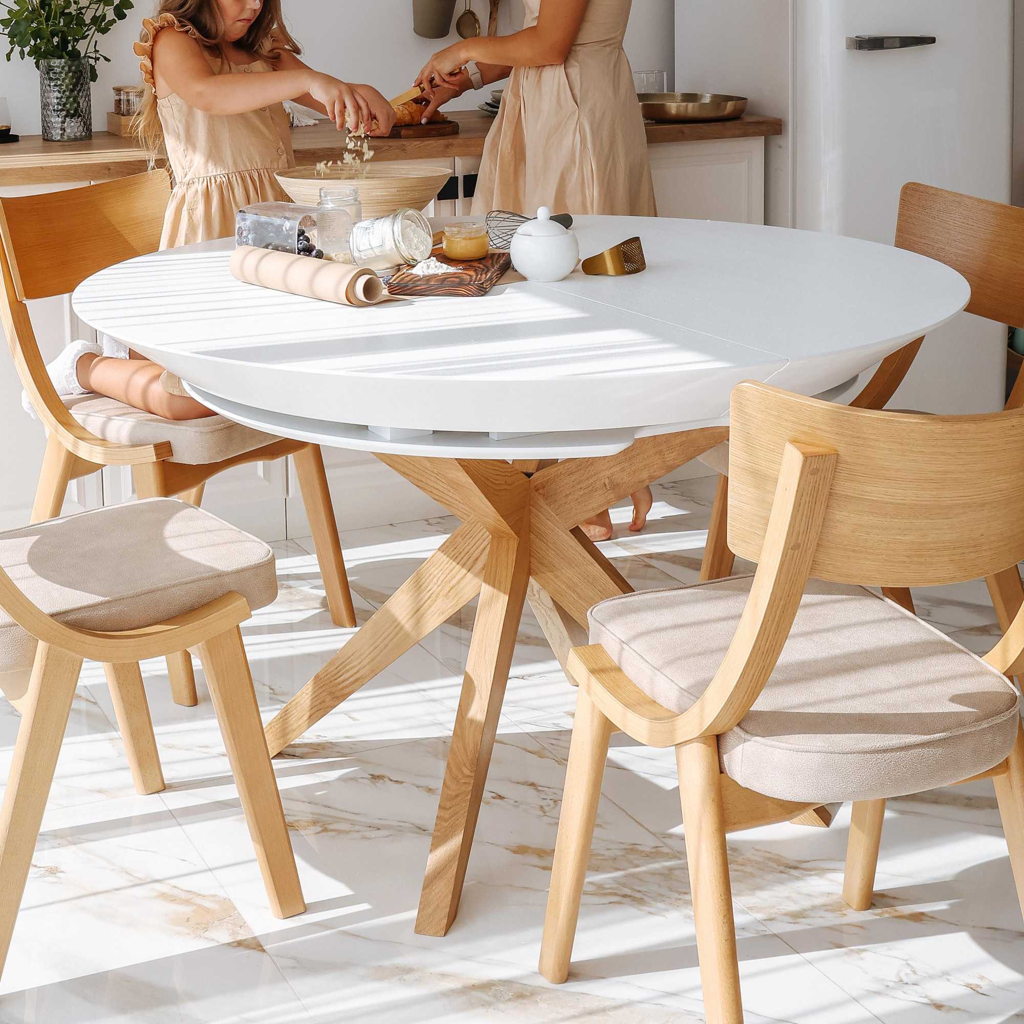 Dieser runde Esstisch stellt eine wunderbare Kombination aus modernem Design und praktischen Funktionen dar, was ein ideales Möbelstück für jeden Haushalt schafft. Aus natürlichen Materialien gefertigt und mit Liebe zum Detail hergestellt, verstärkt dieser Tisch die ästhetische Erscheinung und Funktionalität jedes Esszimmers. Die Konstruktion und die elegant gekreuzten Tischbeine bestehen aus hochwertigem Buchenholz und sind mit mattem schwarzen Lack versehen, was einen markanten und anspruchsvollen Eindruck hinterlässt. Der Durchmesser des Tisches beträgt 127 cm, ausgezogen eine Länge von bis zu 227 cm.