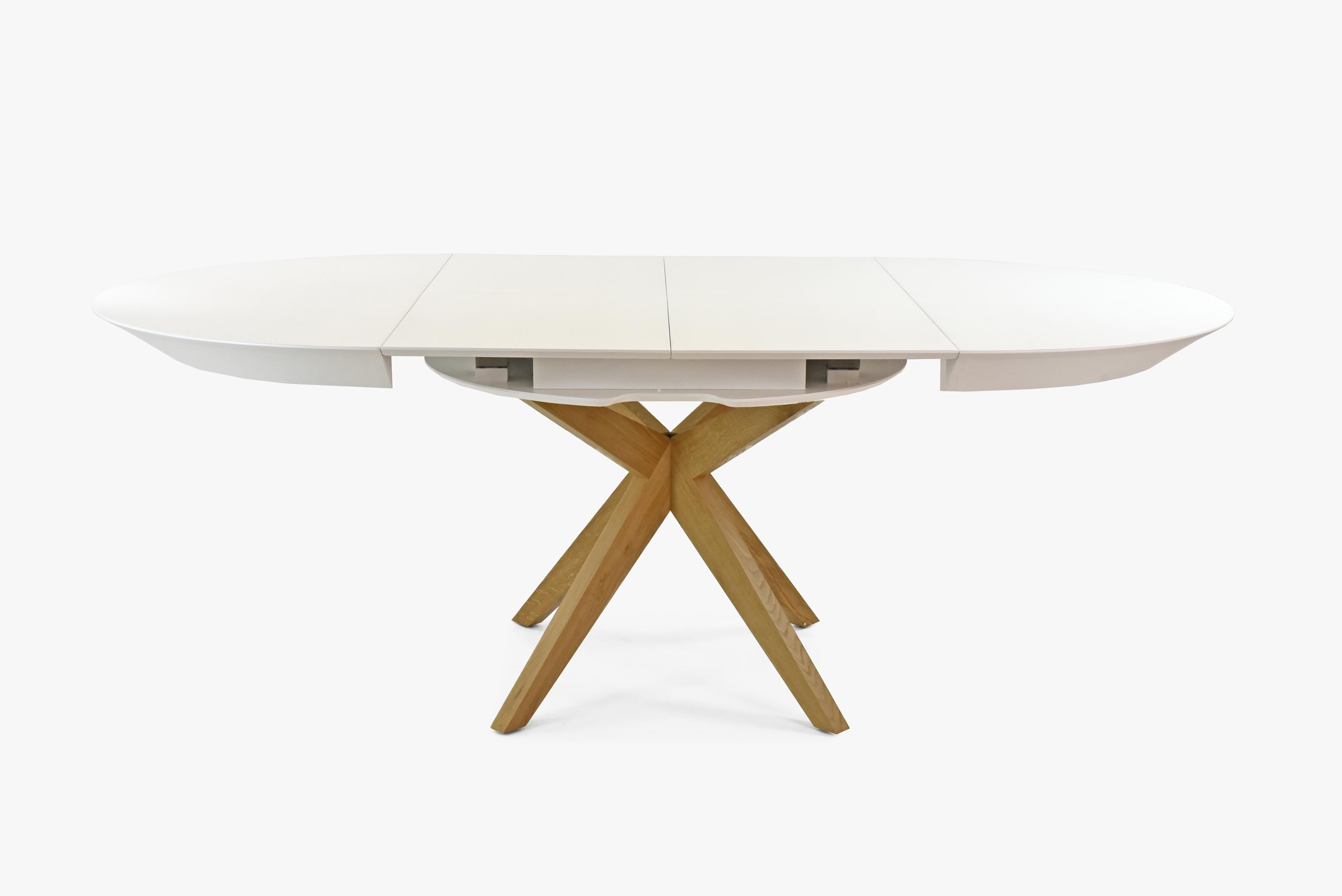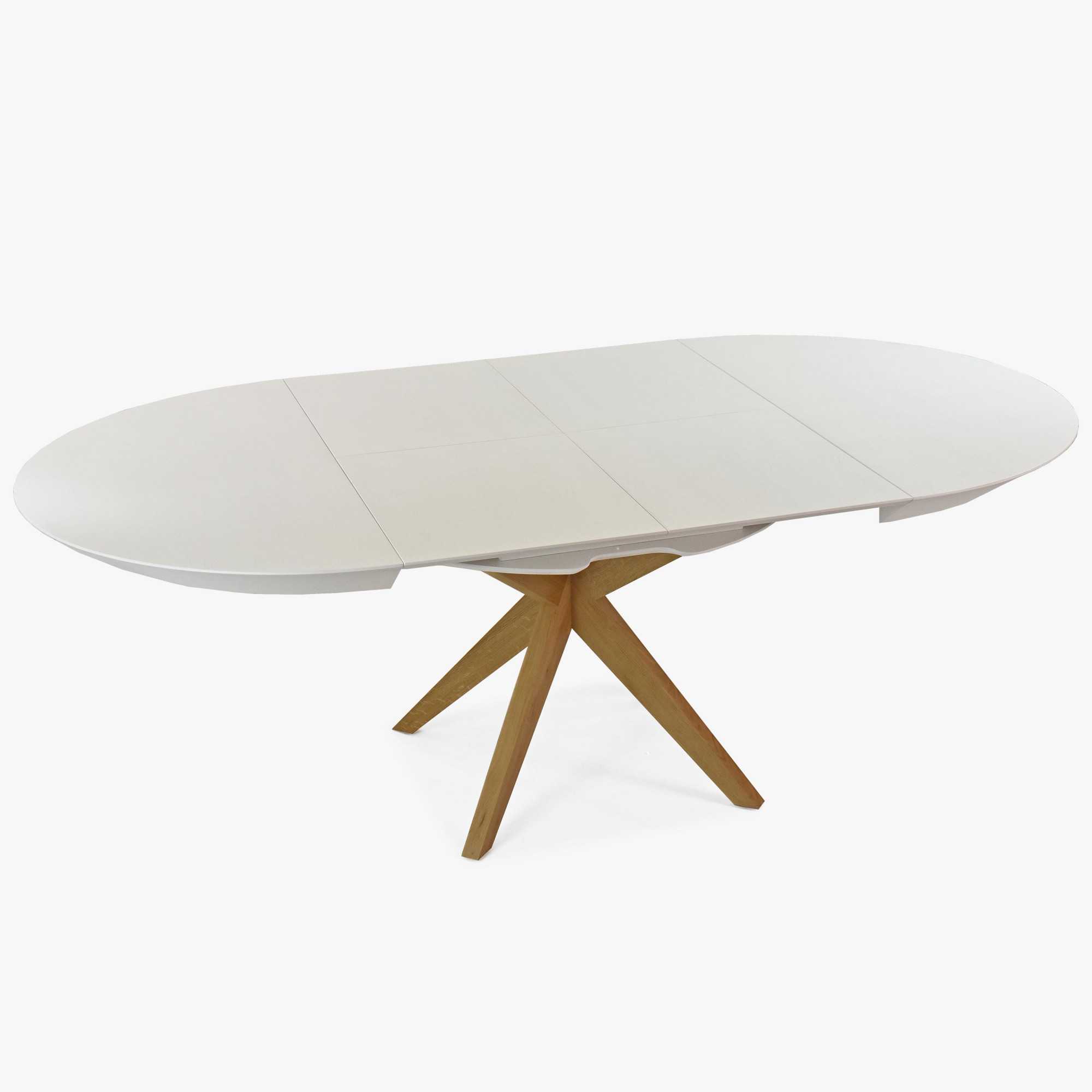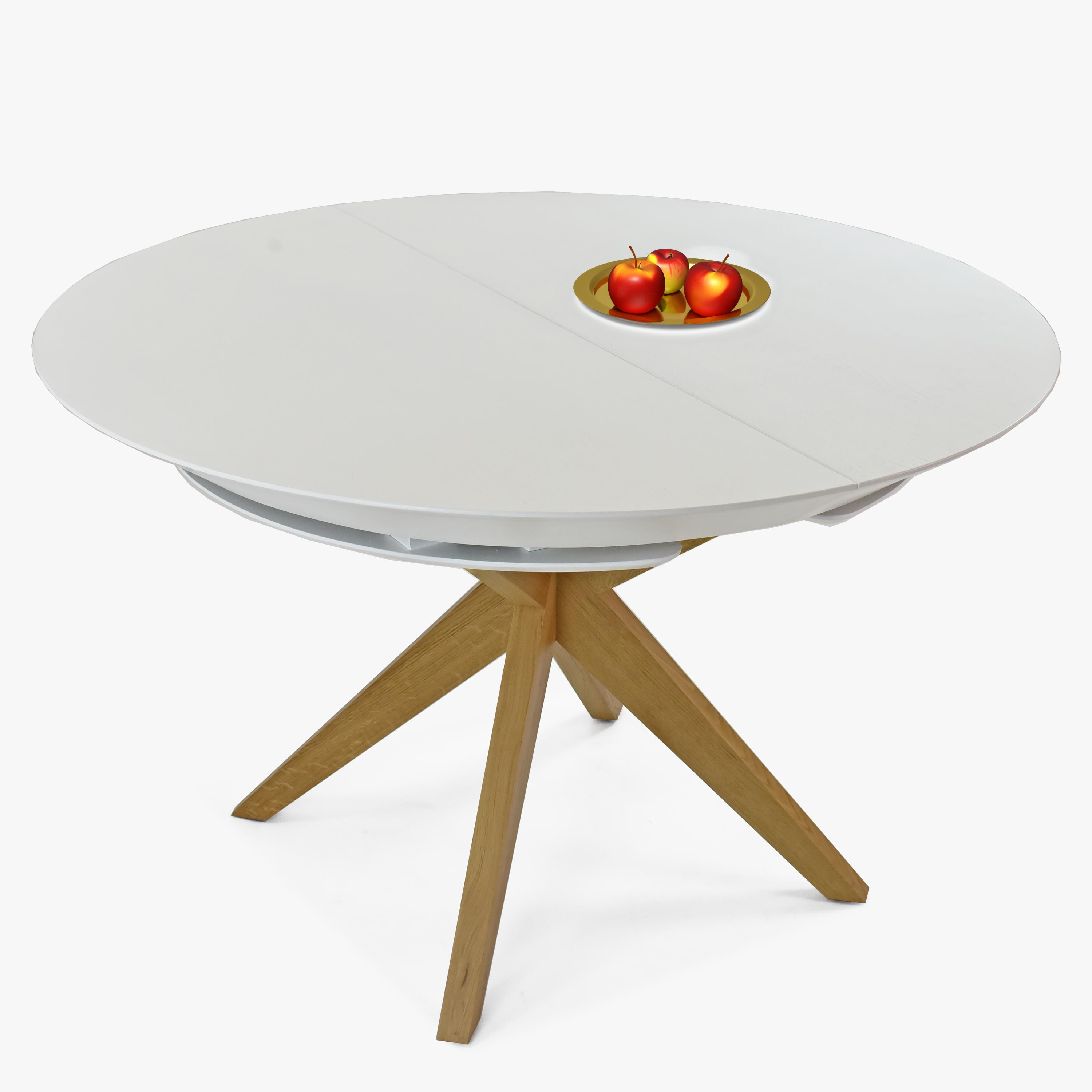 Runder weißer Esstisch - ausziehbare Beine Eiche natur und Platte Eichenfurnier