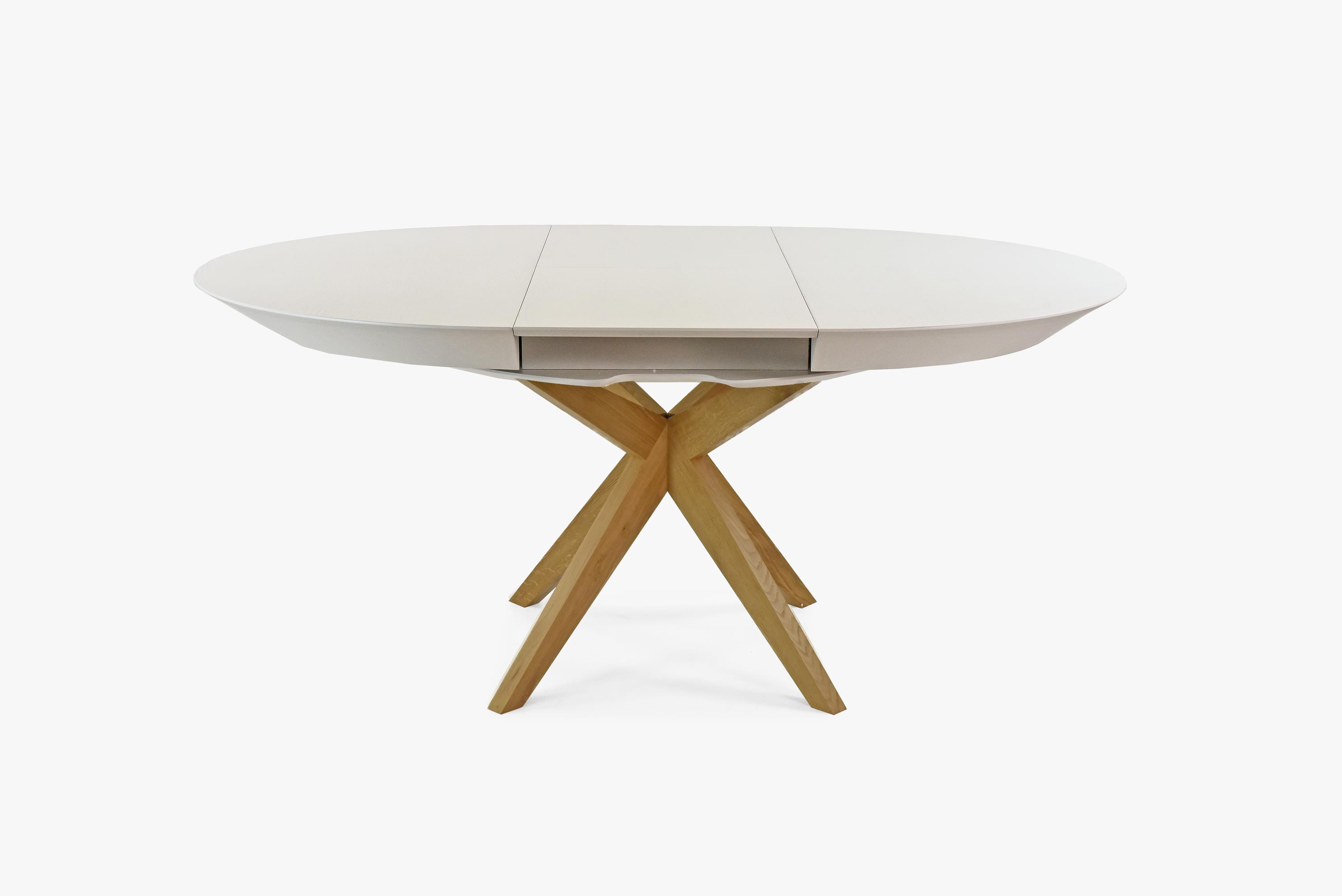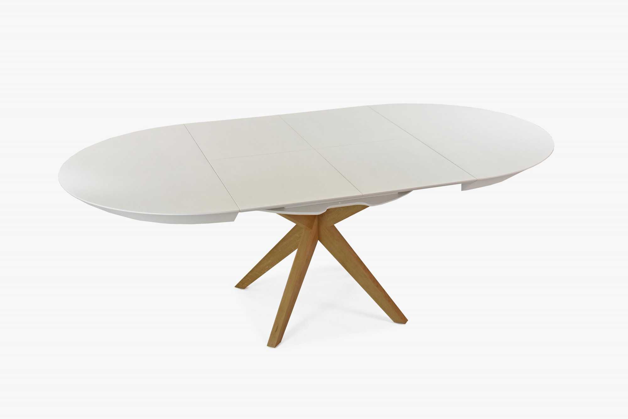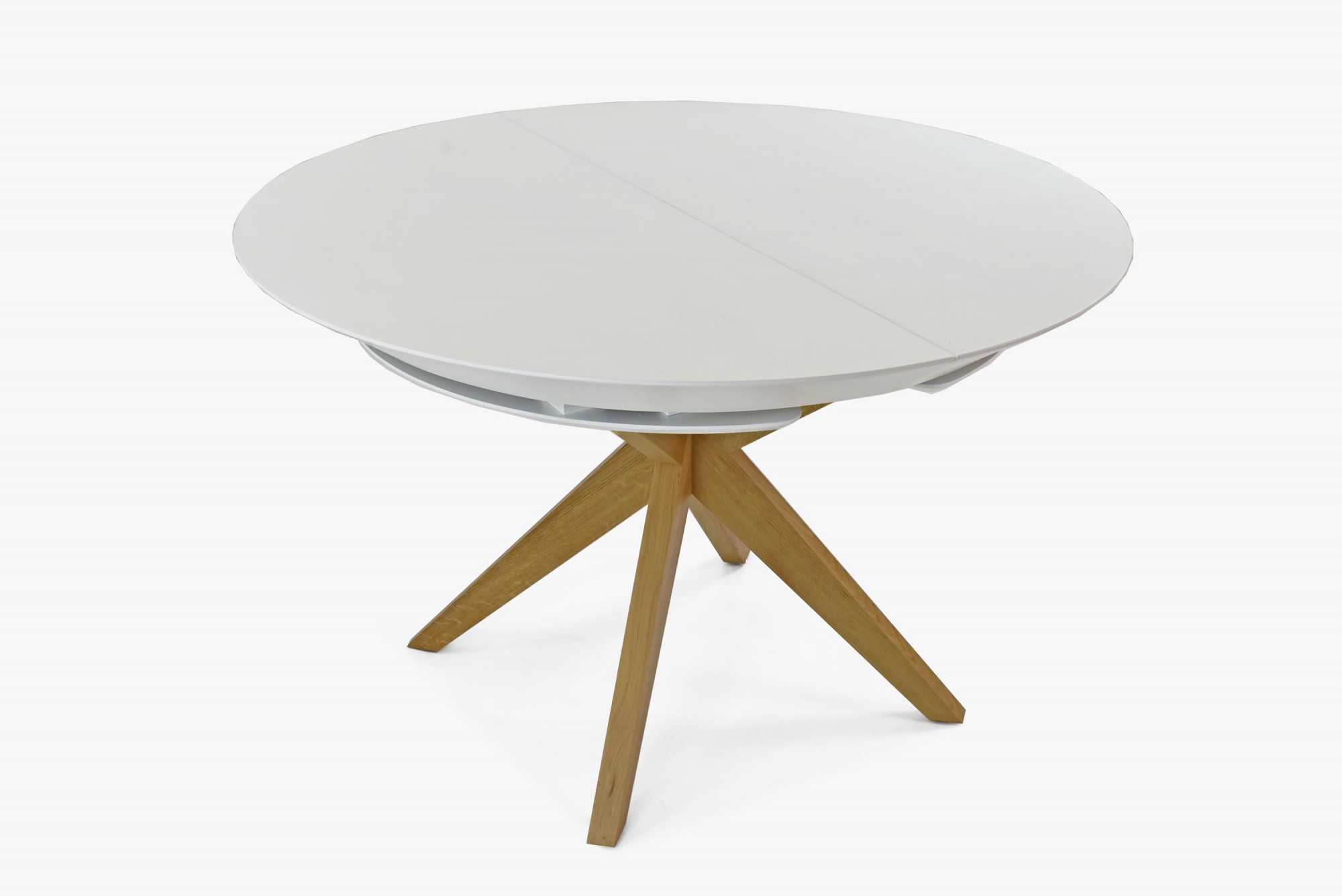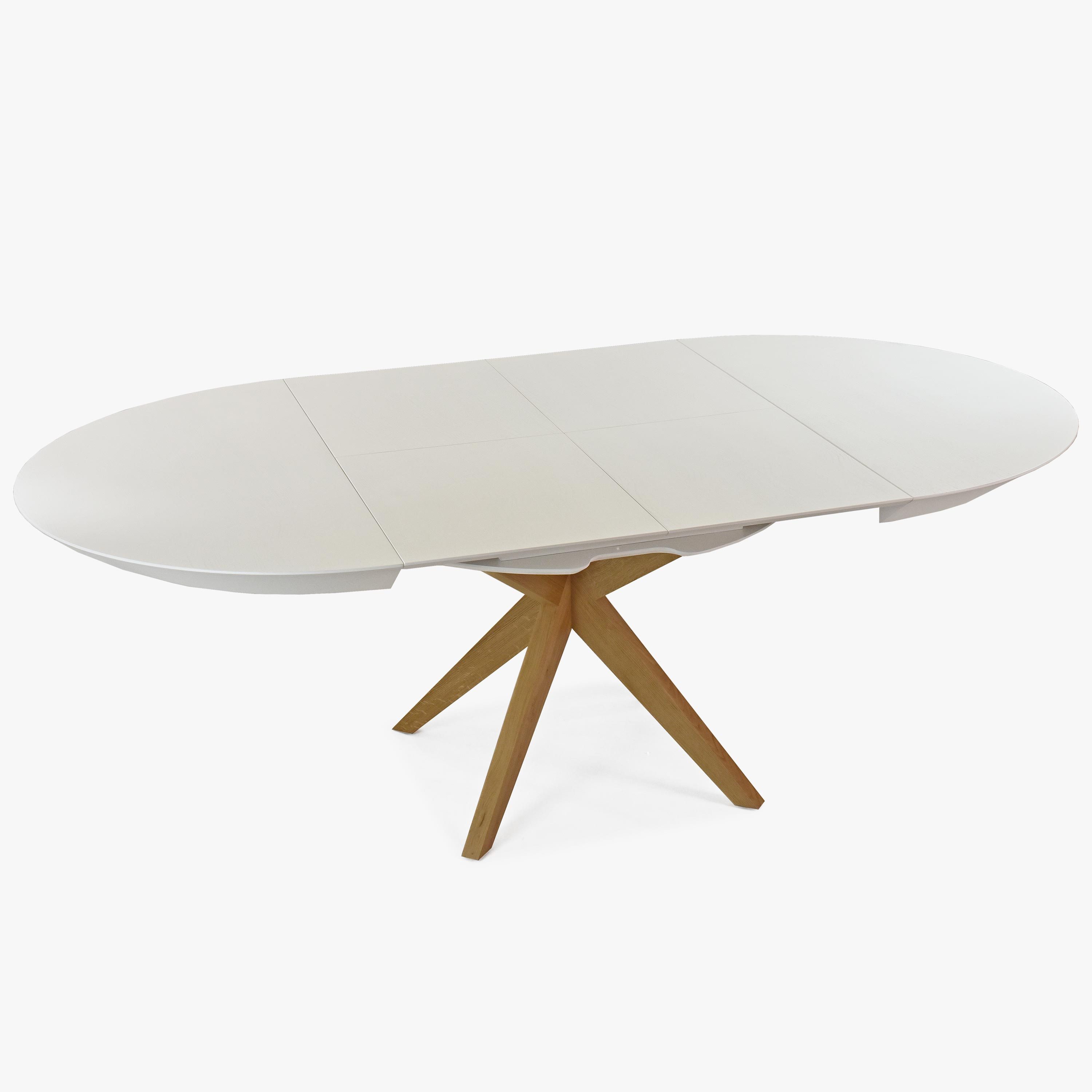Runder weißer Esstisch - ausziehbare Beine Eiche natur und Platte Eichenfurnier