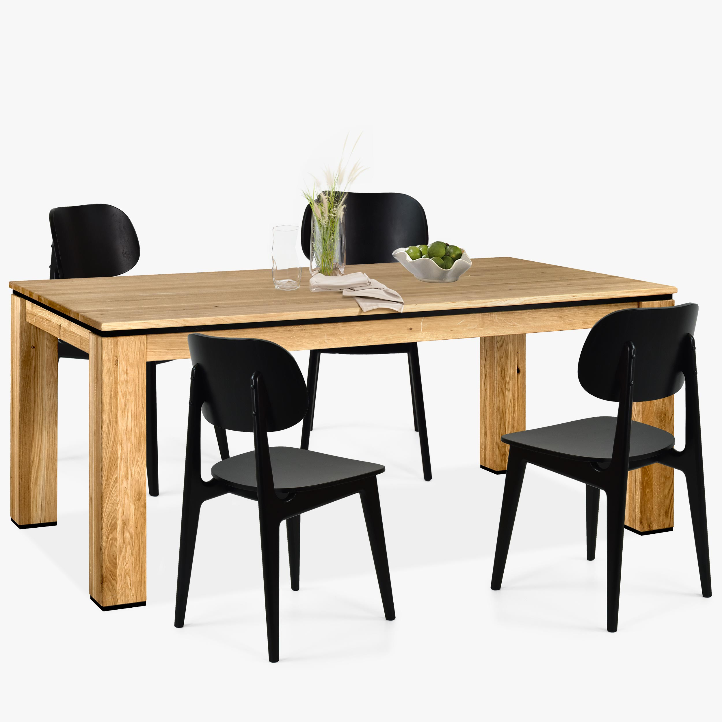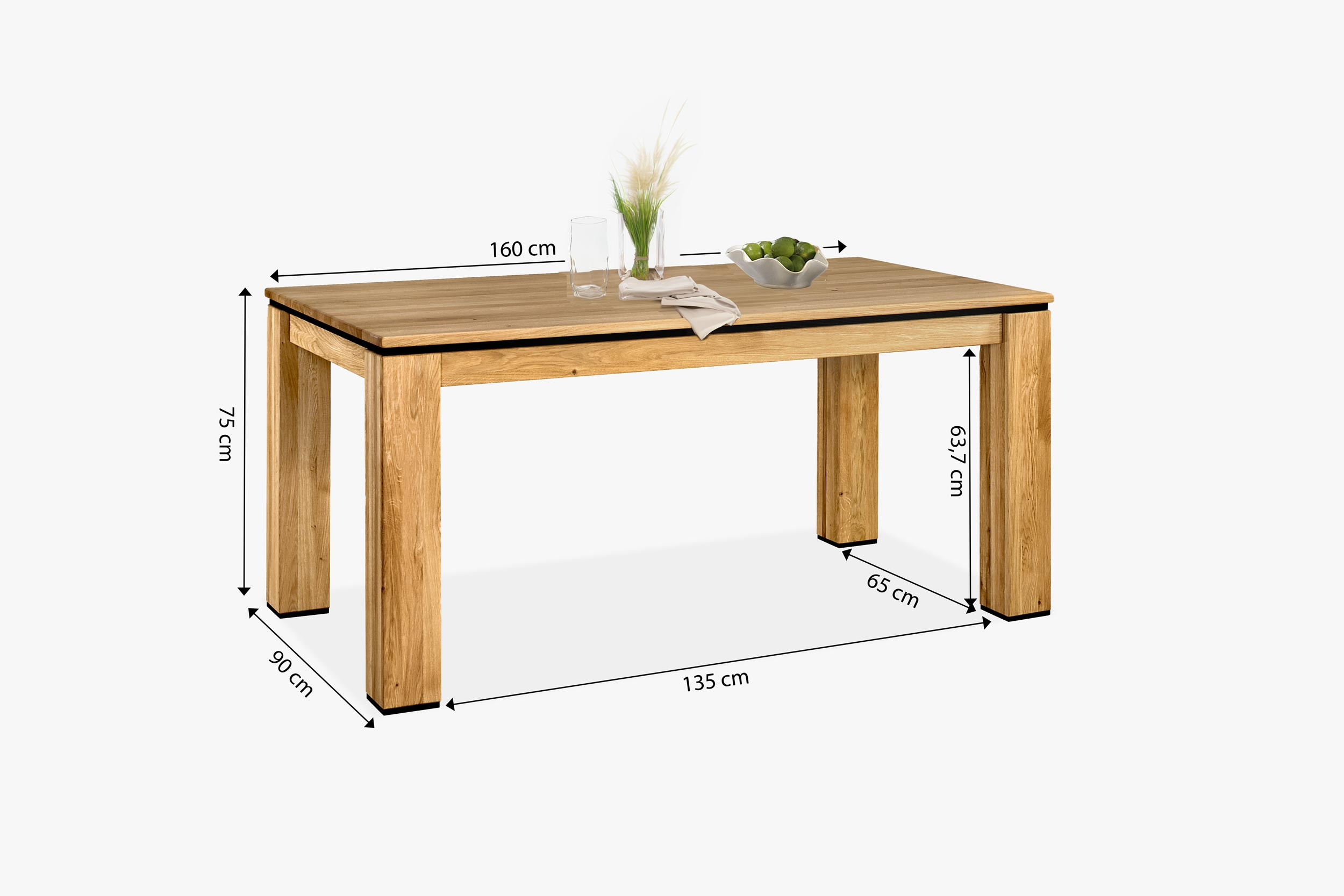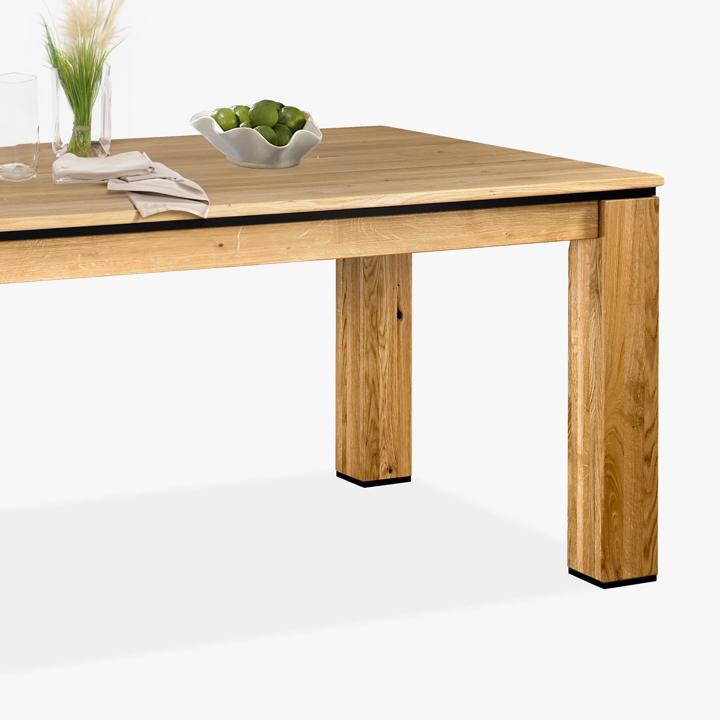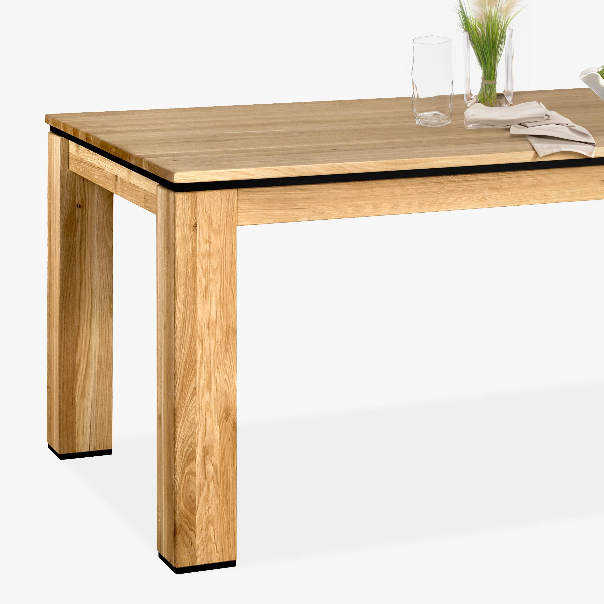 Die Lieferung des Tisches erfolgt zerlegt, was den Transport erleichtert. Die Montage der Tischbeine ist einfach und schnell, auch für Laien, und dauert nur wenige Minuten. Dieser Esstisch ist mit einer schwarzen dekorativen Leiste unter der Tischplatte ausgestattet und die unteren Abdeckungen der Tischbeine sind ebenfalls in Schwarz gehalten, was ihm ein modernes und elegantes Aussehen verleiht. Der Tisch ist Teil der Kollektion NEW Line, doch sein universelles Design und die Farbe ermöglichen eine einfache Kombination mit anderen Eichenmöbeln in Ihrem Zuhause.