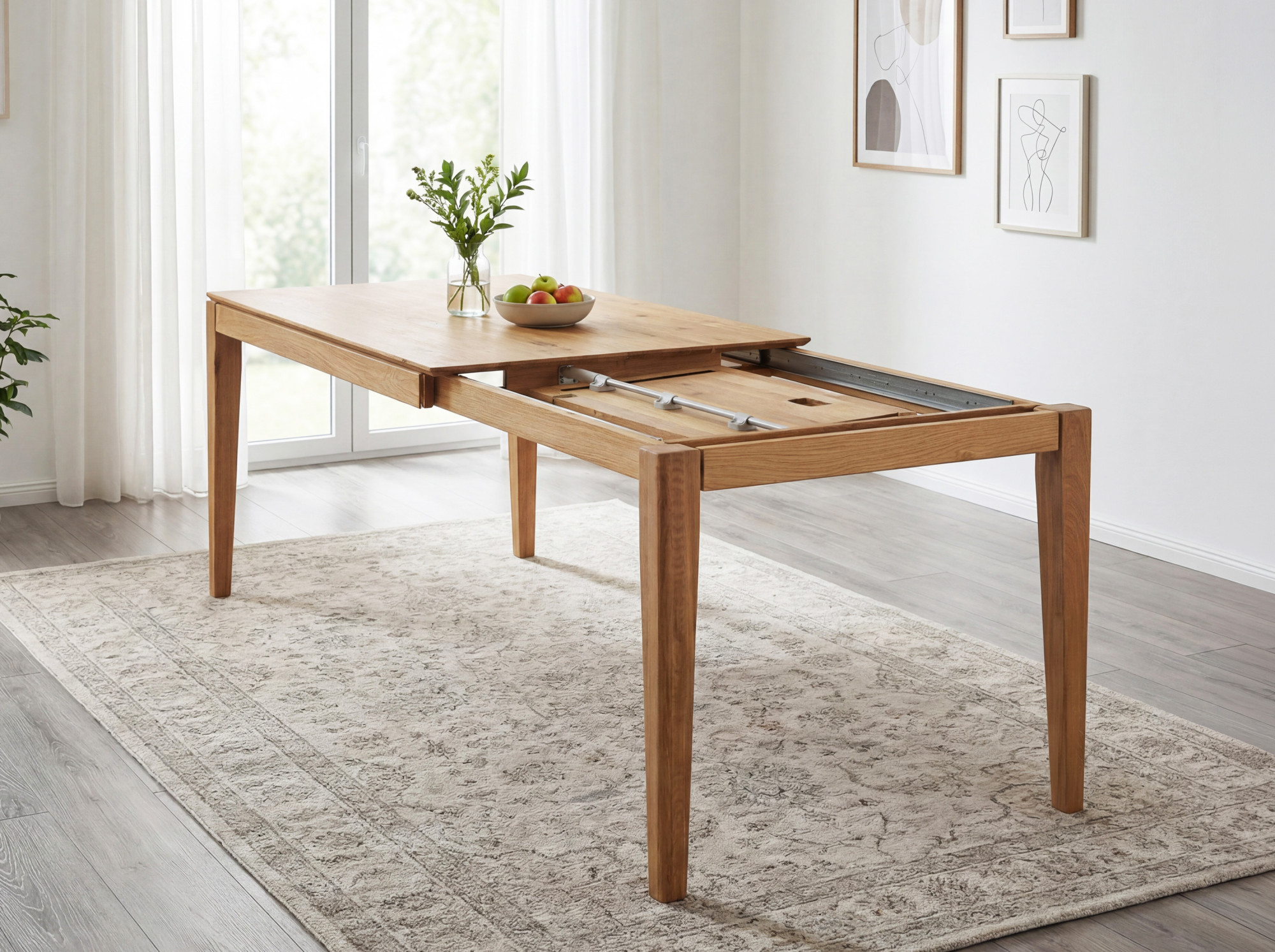 Dieser praktische Ausziehmechanismus ermöglicht eine einfache und schnelle Vergrößerung des Tisches, die sogar ein Kind mit einer Hand bewältigen kann. Die gesamte Ausziehplatte ist elegant unter dem Tisch verborgen und die Tischbeine sind mit Rollen ausgestattet, die die Handhabung erleichtern.