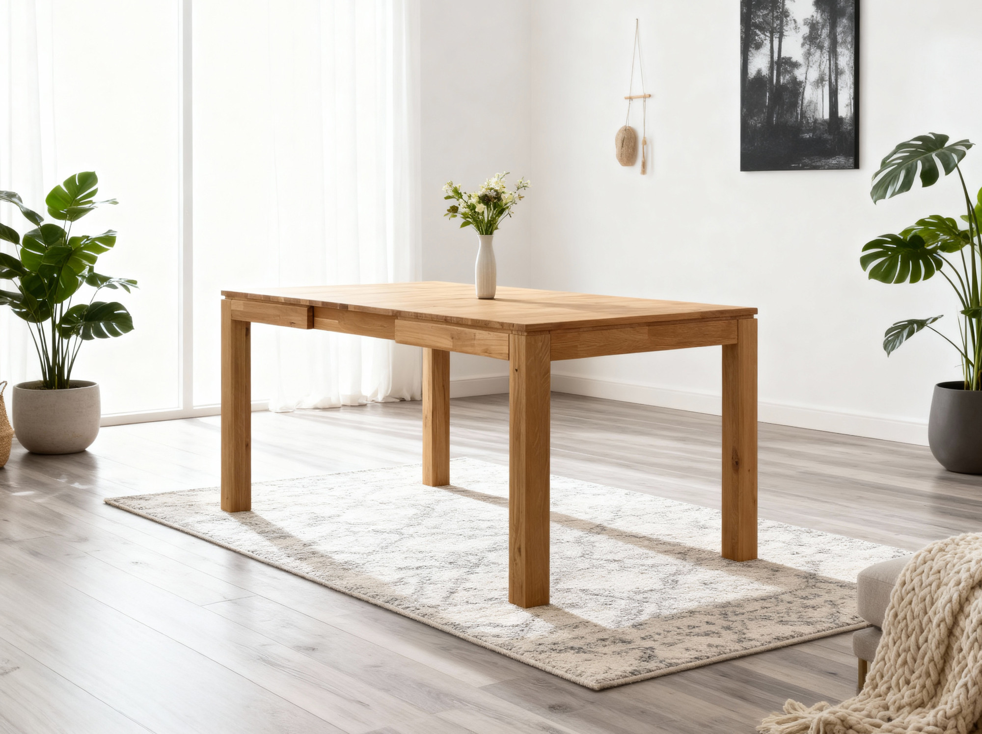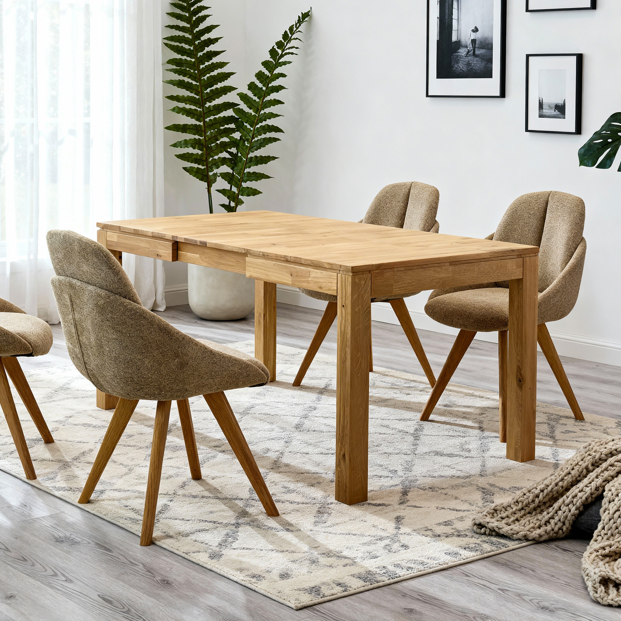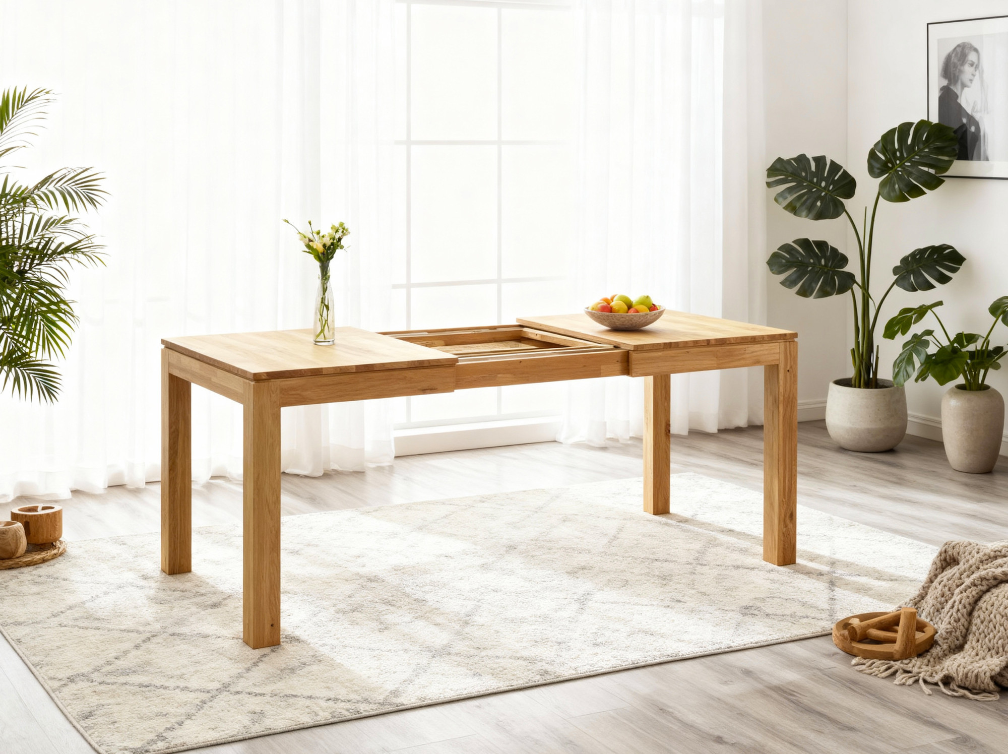 Dieser Esstisch aus Eichenholz ist für alle gedacht, die in Küche oder Esszimmer mit dem Platz kämpfen. Die Grundgröße des Tisches beträgt 120 x 80 cm, was ideal für kleinere Räume ist. Dank seiner Ausziehfunktion lässt sich der Tisch einfach auf 170 x 80 cm vergrößern, was eine komfortable Größe für bis zu 6 Personen darstellt. Ein Vorteil dieses Tisches ist seine vollmassive Ausführung, die hohe Widerstandsfähigkeit und lange Lebensdauer garantiert. Der Ausziehmechanismus ist clever direkt im Tisch versteckt, was zu seinem eleganten Aussehen beiträgt.