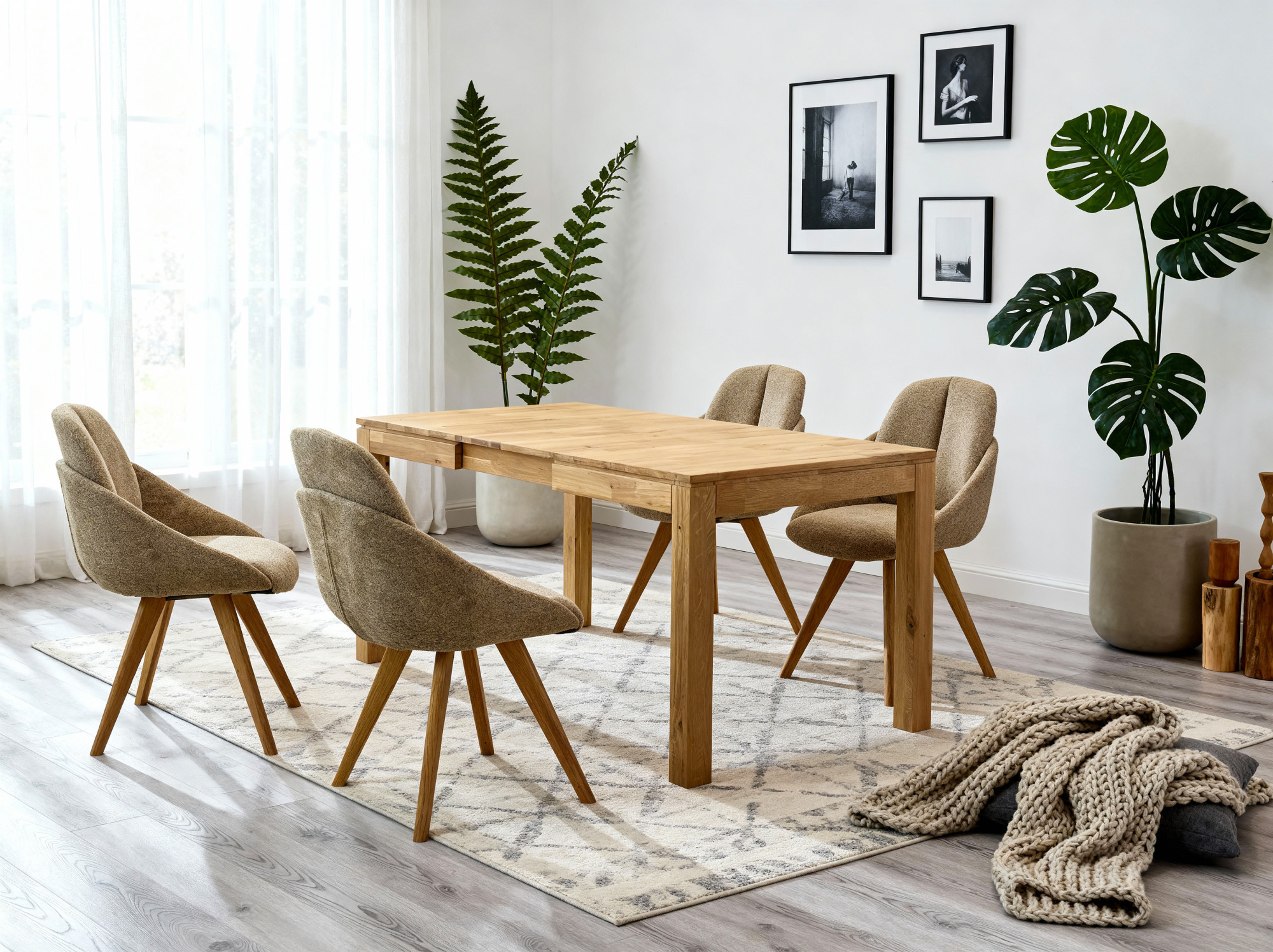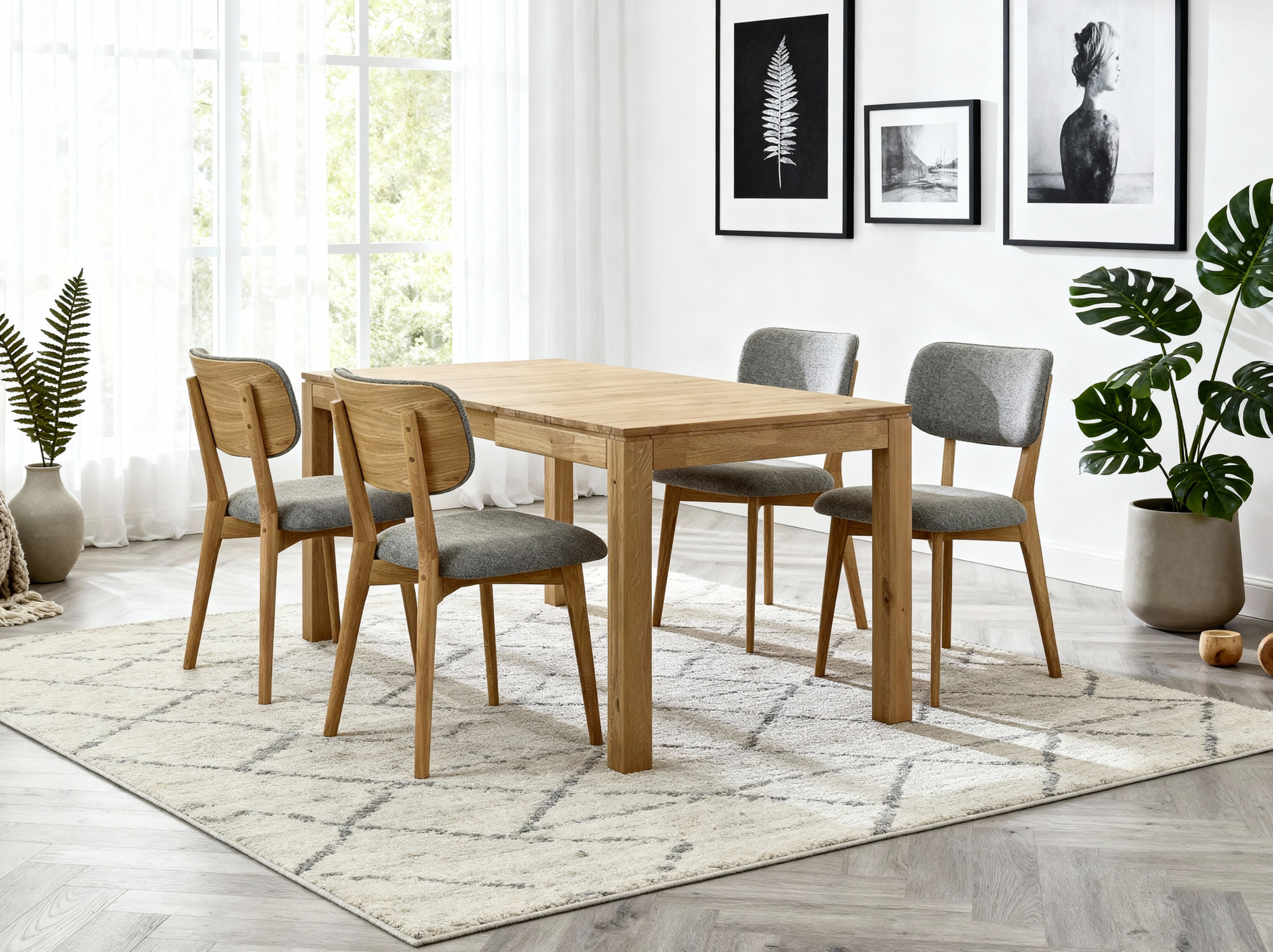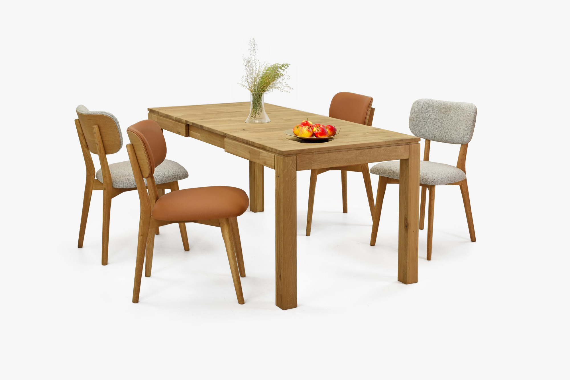 * Im Bild ausziehbarer Eichenholztisch Matuš 120(160) x 80 cm und Esszimmerstuhl Benjamin