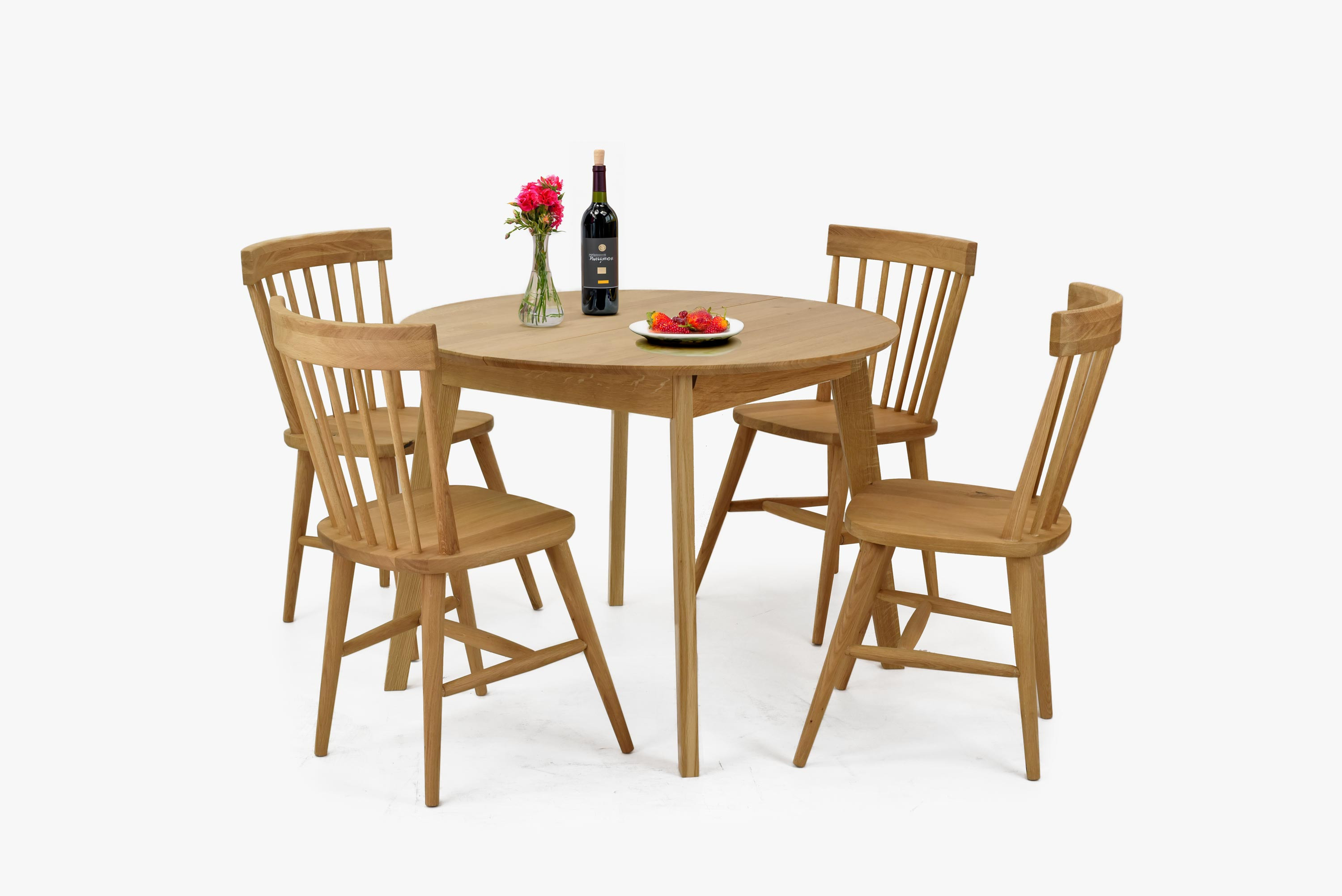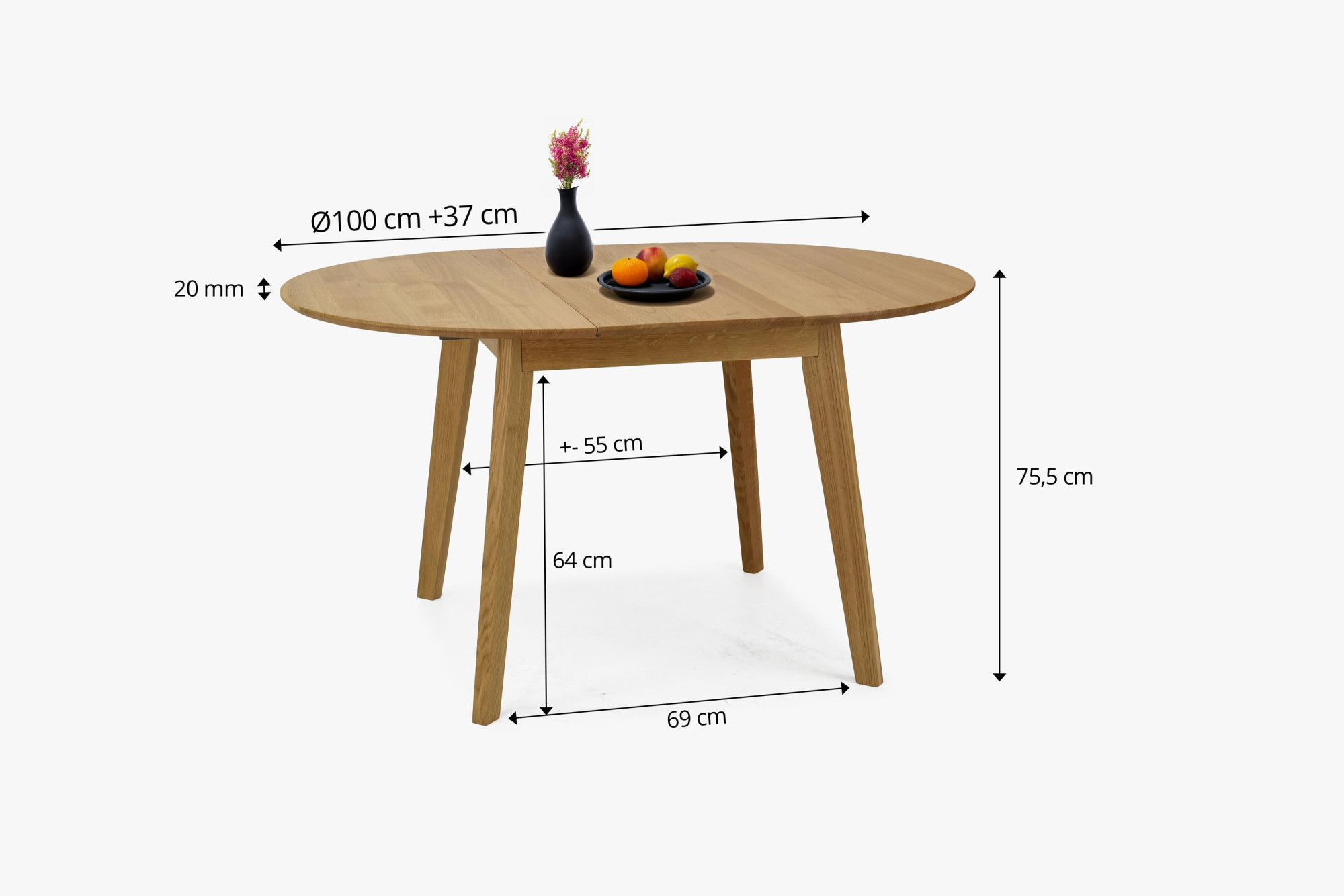 Runder Esstisch aus massivem Eichenholz mit Ausziehfunktion ist eine ausgezeichnete Wahl für Haushalte, die ein praktisches und elegantes Möbelstück aus Naturmaterial suchen. Hergestellt aus hochwertigem massivem Eichenholz, bringt dieser Tisch nicht nur natürliche Schönheit, sondern auch lange Lebensdauer und Stabilität mit sich. Der Durchmesser der Tischplatte beträgt 100 cm, was ihn ideal für kleinere Esszimmer oder Küchen macht, aber dank der Ausziehfunktion kann seine Größe um 37 cm auf eine ovale Form erweitert werden, wodurch er zu einem praktischen Tisch für größere Familientreffen oder Gäste wird.