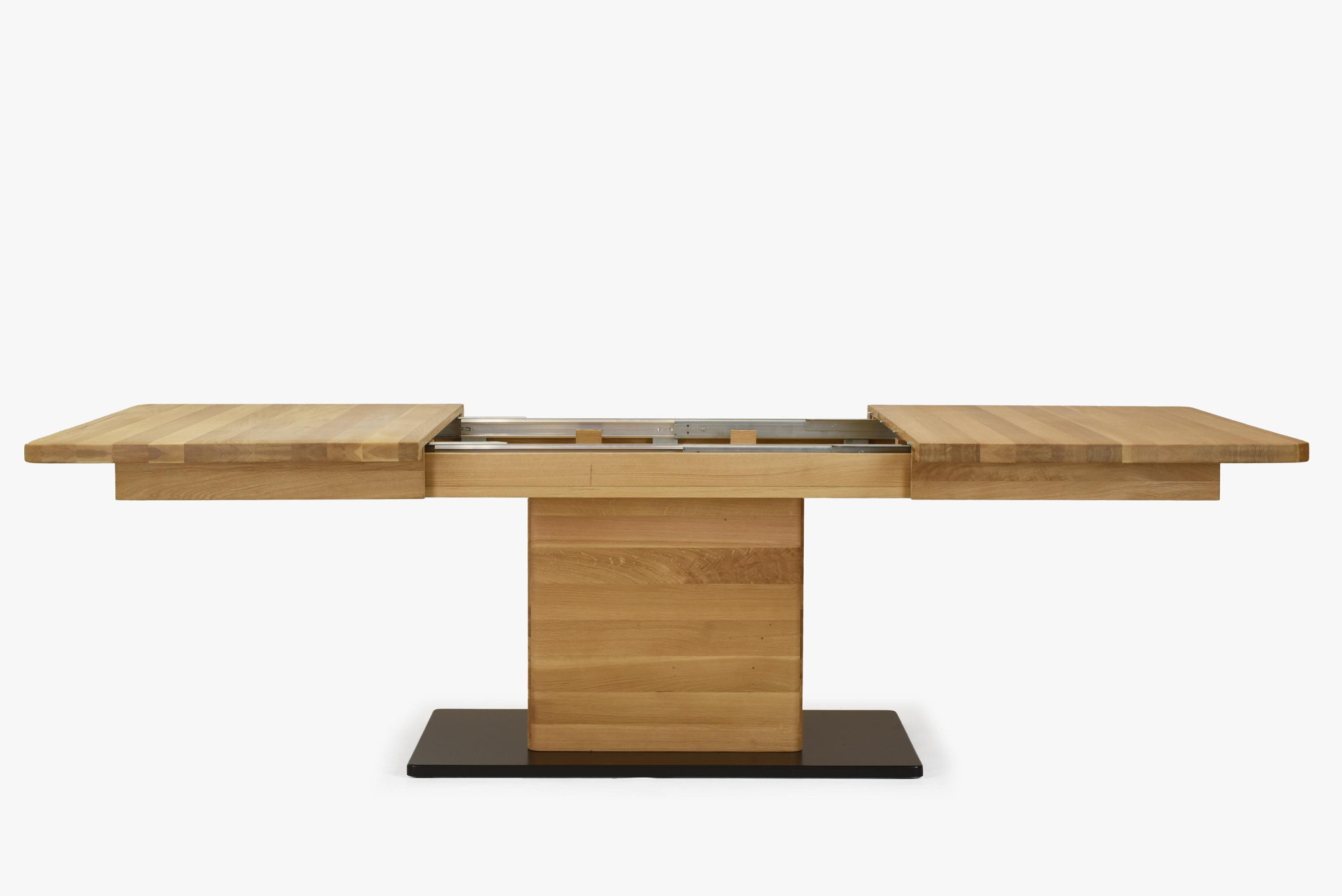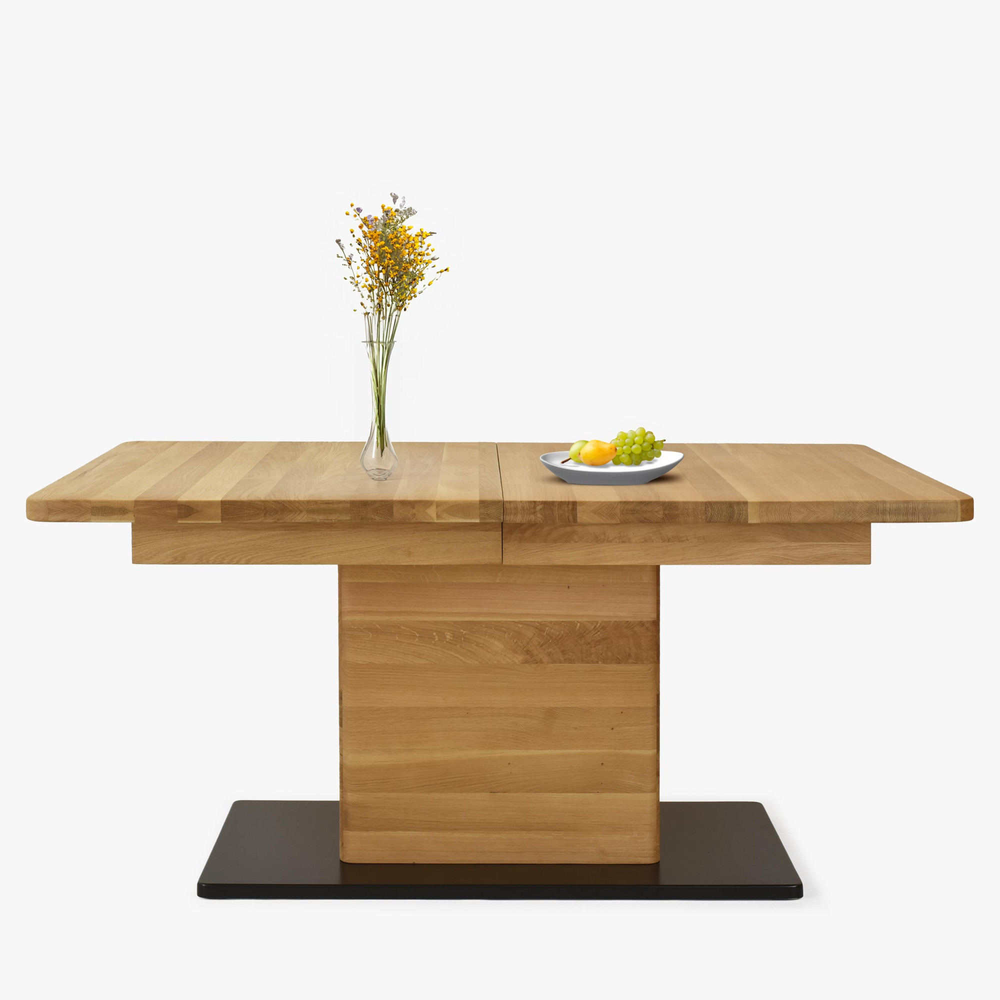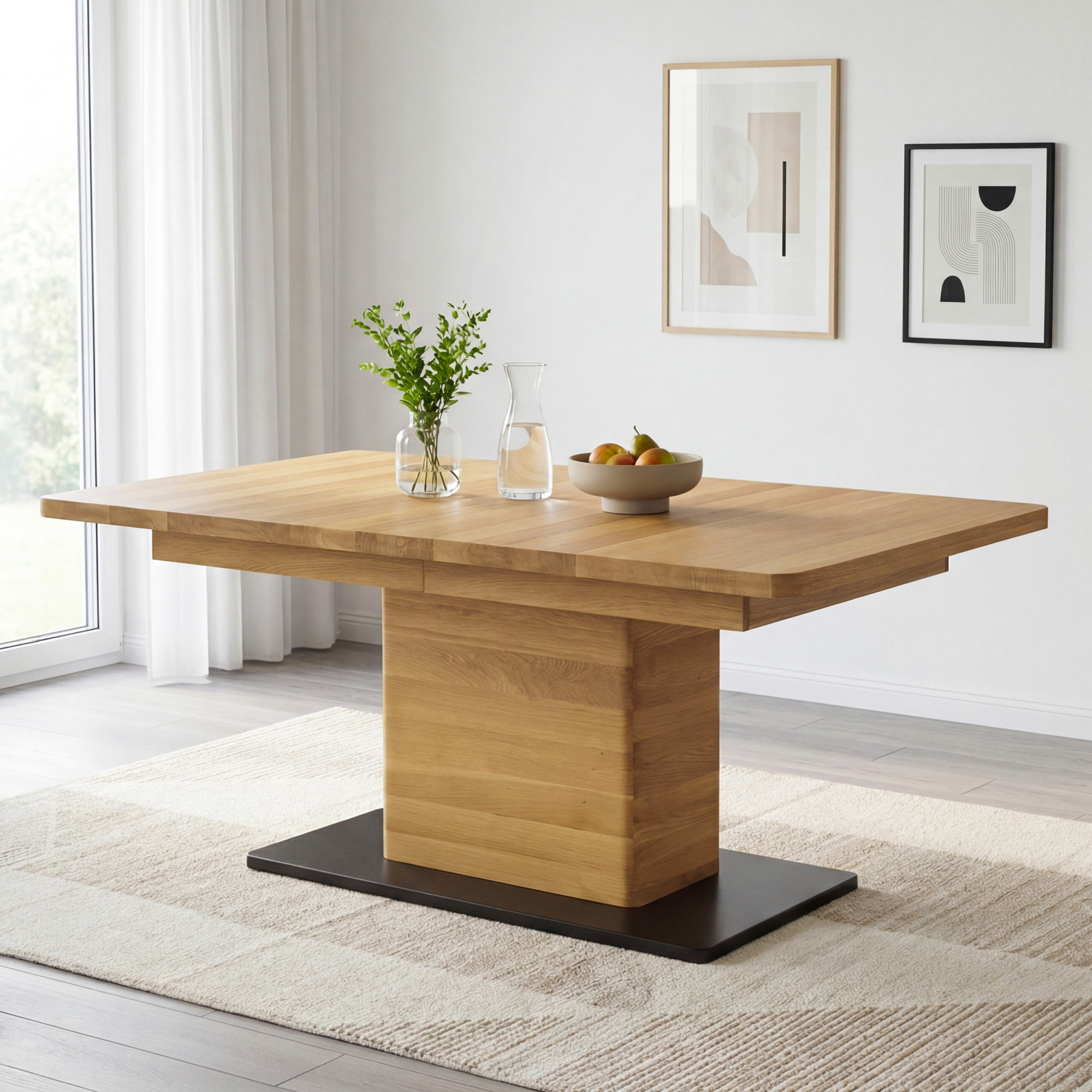 Eiche ausziehbarer Esstisch auf einem Bein ist eine elegante und funktionale Lösung für jeden Haushalt, der hochwertigen und stilvollen Möbel aus Naturholz sucht. Dieser Tisch besticht durch sein modernes Design, das massives Eichenholz und einen schwarzen Sockel kombiniert, was ein einzigartiges und ästhetisch ansprechendes Element in Ihrem Interieur schafft. Abgerundete Tischkanten sorgen nicht nur für mehr Sicherheit, besonders in Familien mit Kindern, sondern verleihen dem Tisch auch Sanftheit und Eleganz.