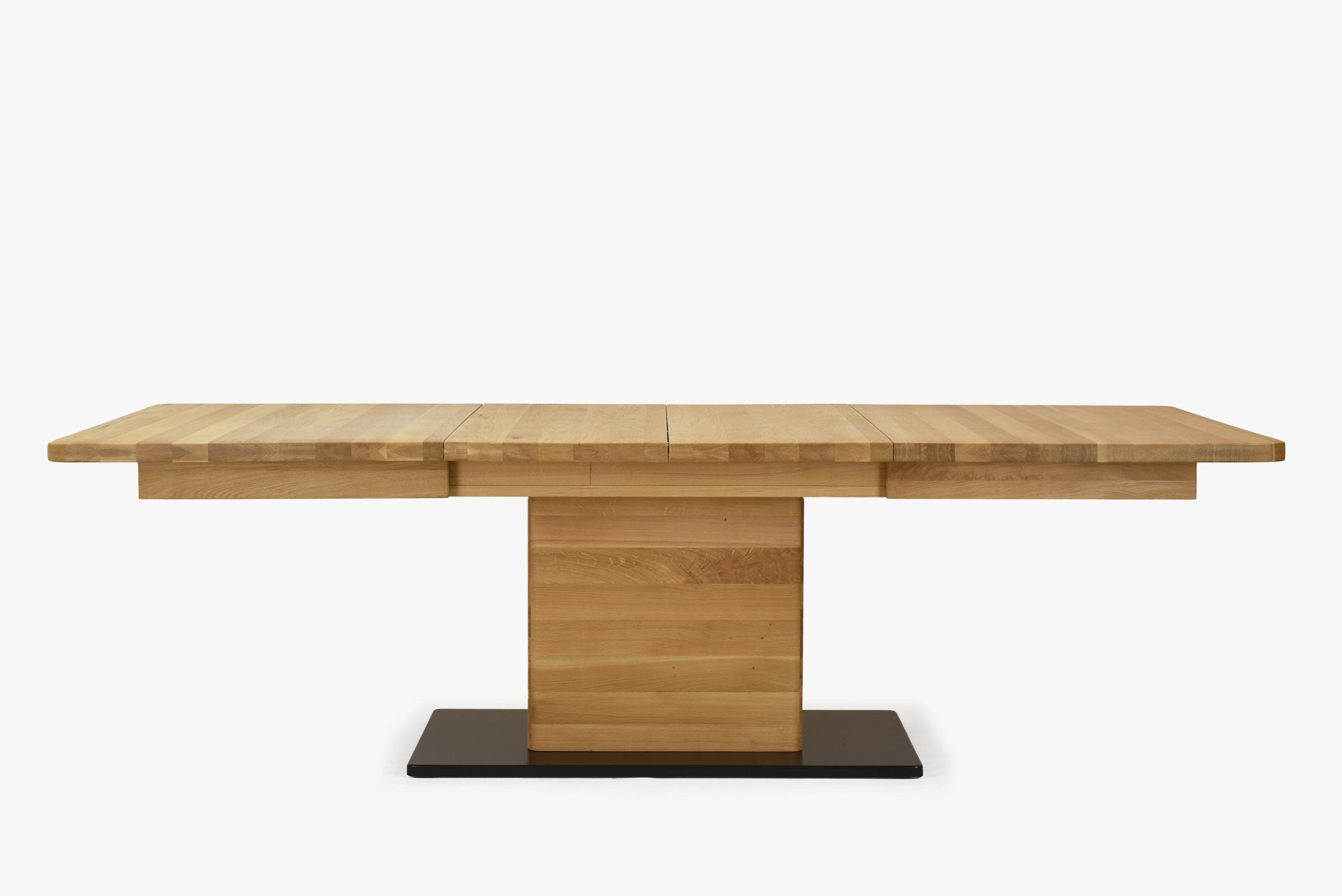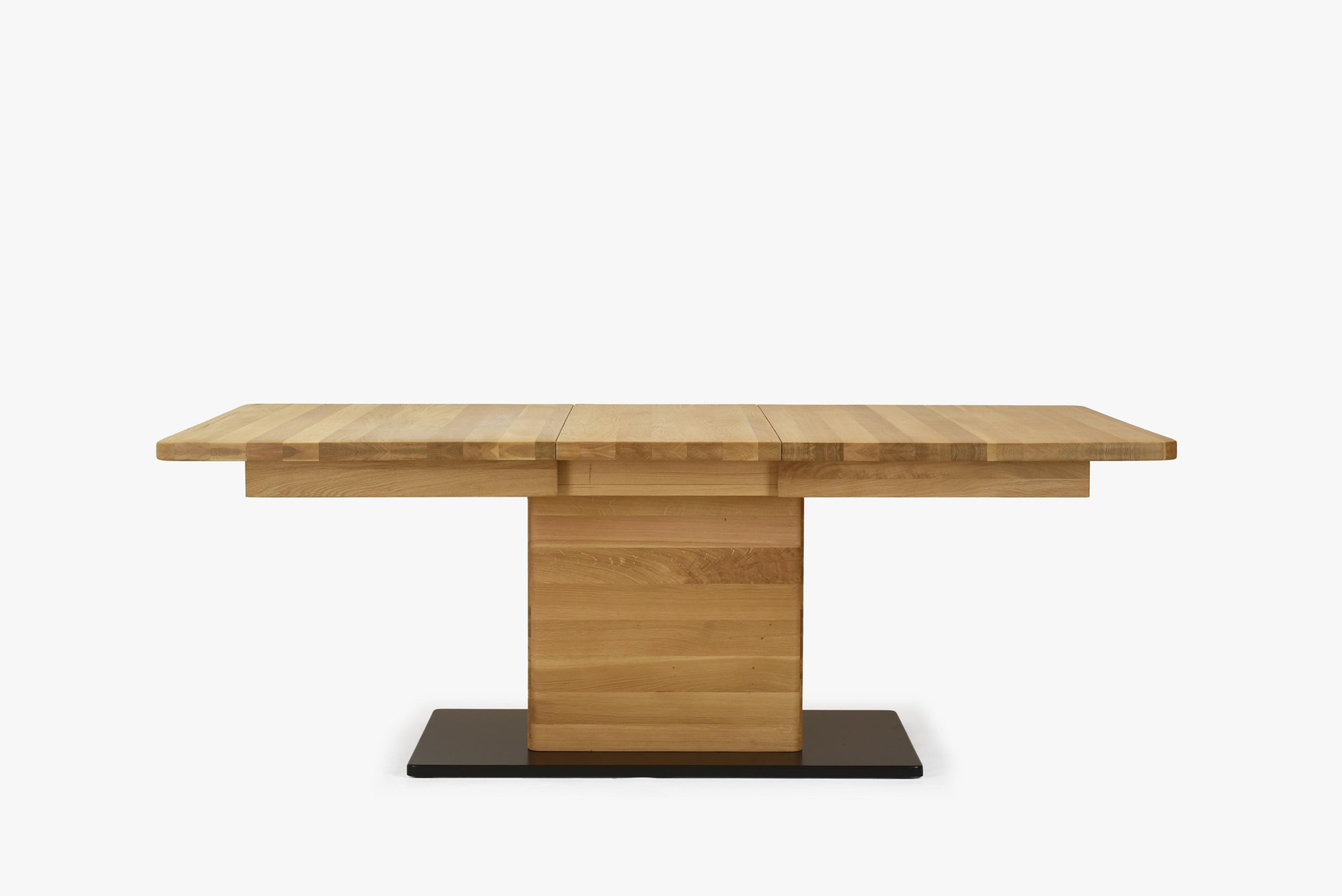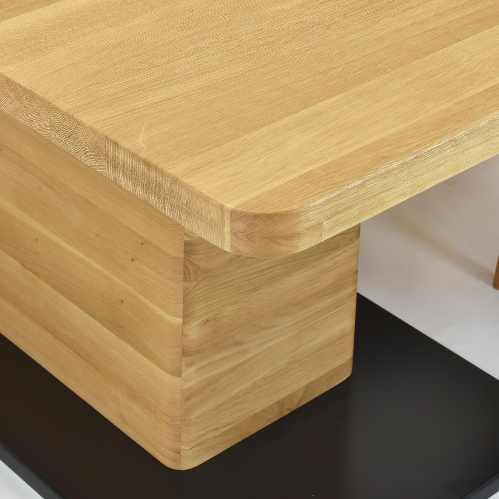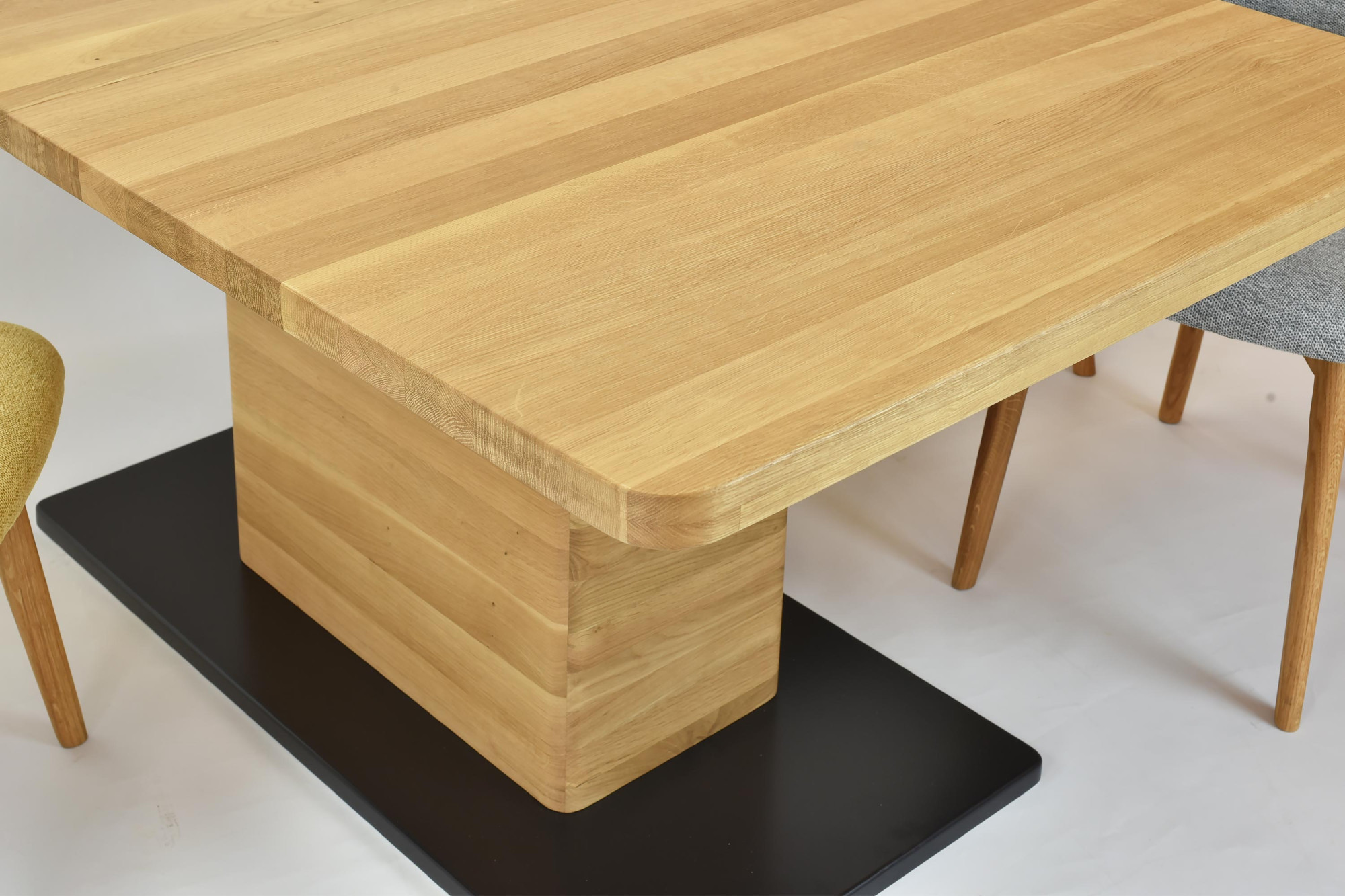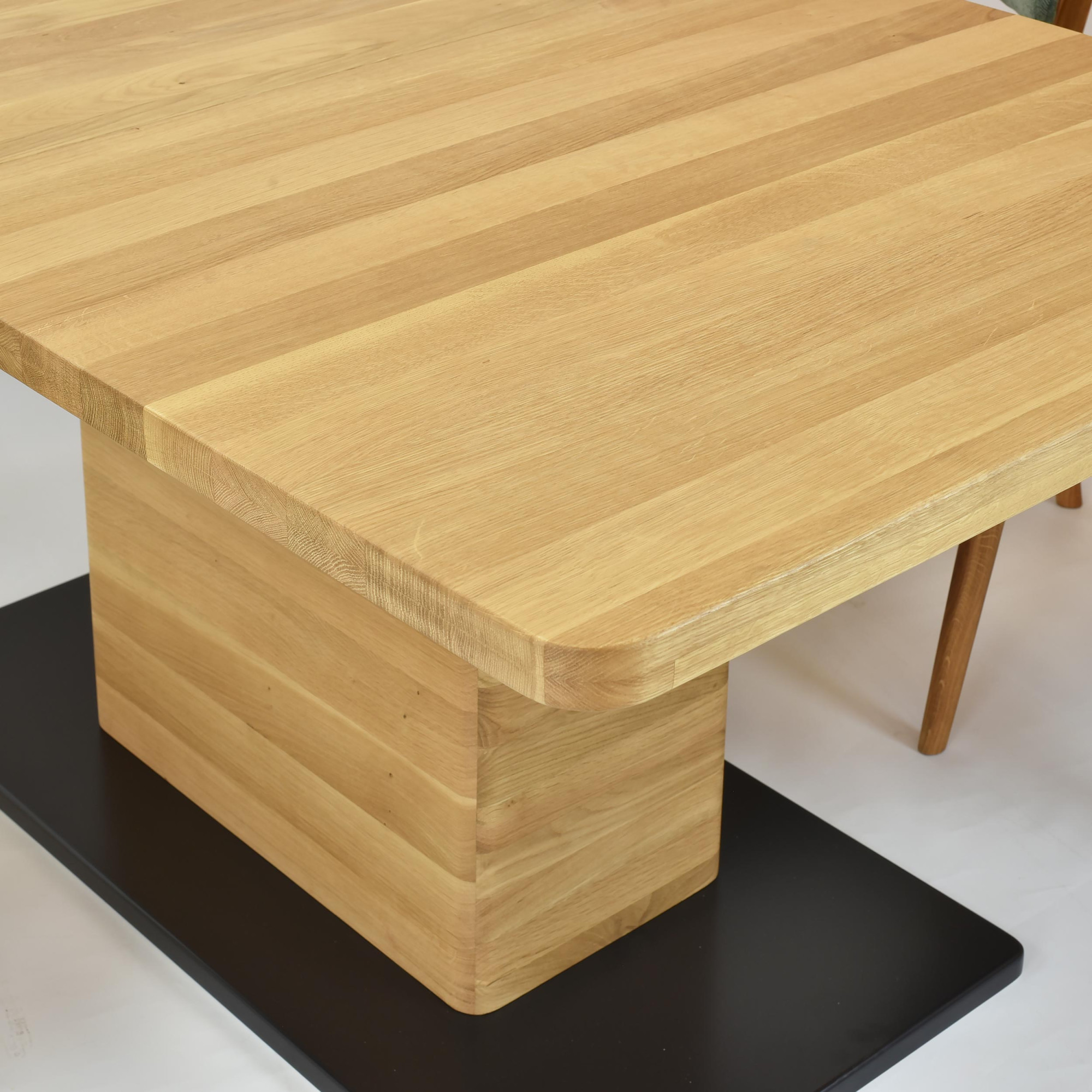 Der Tisch ist aus hochwertigem Eichenholz gefertigt, das mit dänischem Naturöl Woca behandelt wurde, was seine lange Haltbarkeit und Widerstandsfähigkeit gewährleistet. Das Hauptmerkmal dieses Tisches ist sein zentraler Fuß, der auf einem stabilen schwarzen Sockel sitzt. Diese Lösung ermöglicht nicht nur maximalen Sitzkomfort, sondern verleiht dem Tisch auch ein modernes, minimalistisches Aussehen.